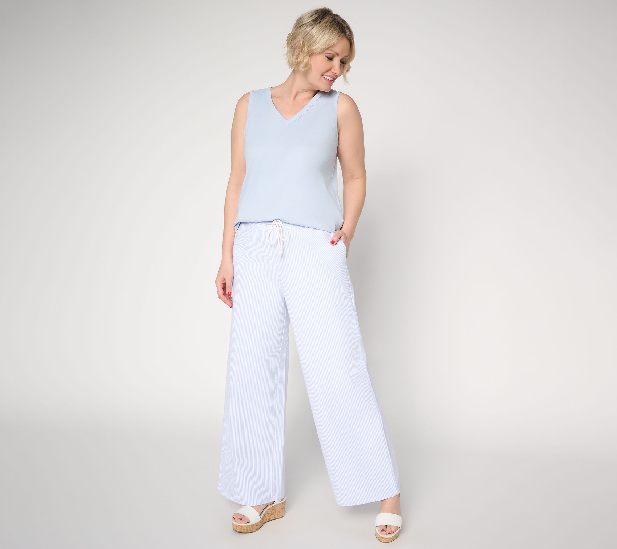 With trend-smart railroad stripes and a comfortable wide-leg cut, these full-length pants are just the ticket to a stylish new season. Easy-fitting through the hip and thigh, they're finished with a flexible elastic waistband, on-seam pockets, and thoughtful angled seaming for a flattering touch. Pair with your go-to top and sneakers for an upbeat, versatile look. From Peace Love World.