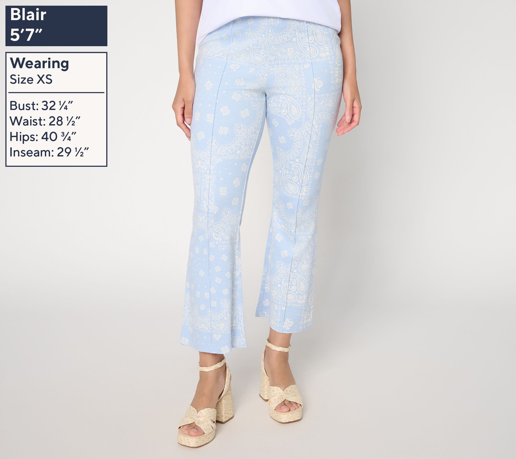 Designed to sweeten social engagements or add a lively twist to daily routines, these printed pull-on crop pants deliver flair and figure-flattering comfort. The Hollywood waistband and front pintucks create a smooth, tailored effect, while the flared leg and stretchy-smooth fabric make moving through your day a breeze. From Peace Love World.