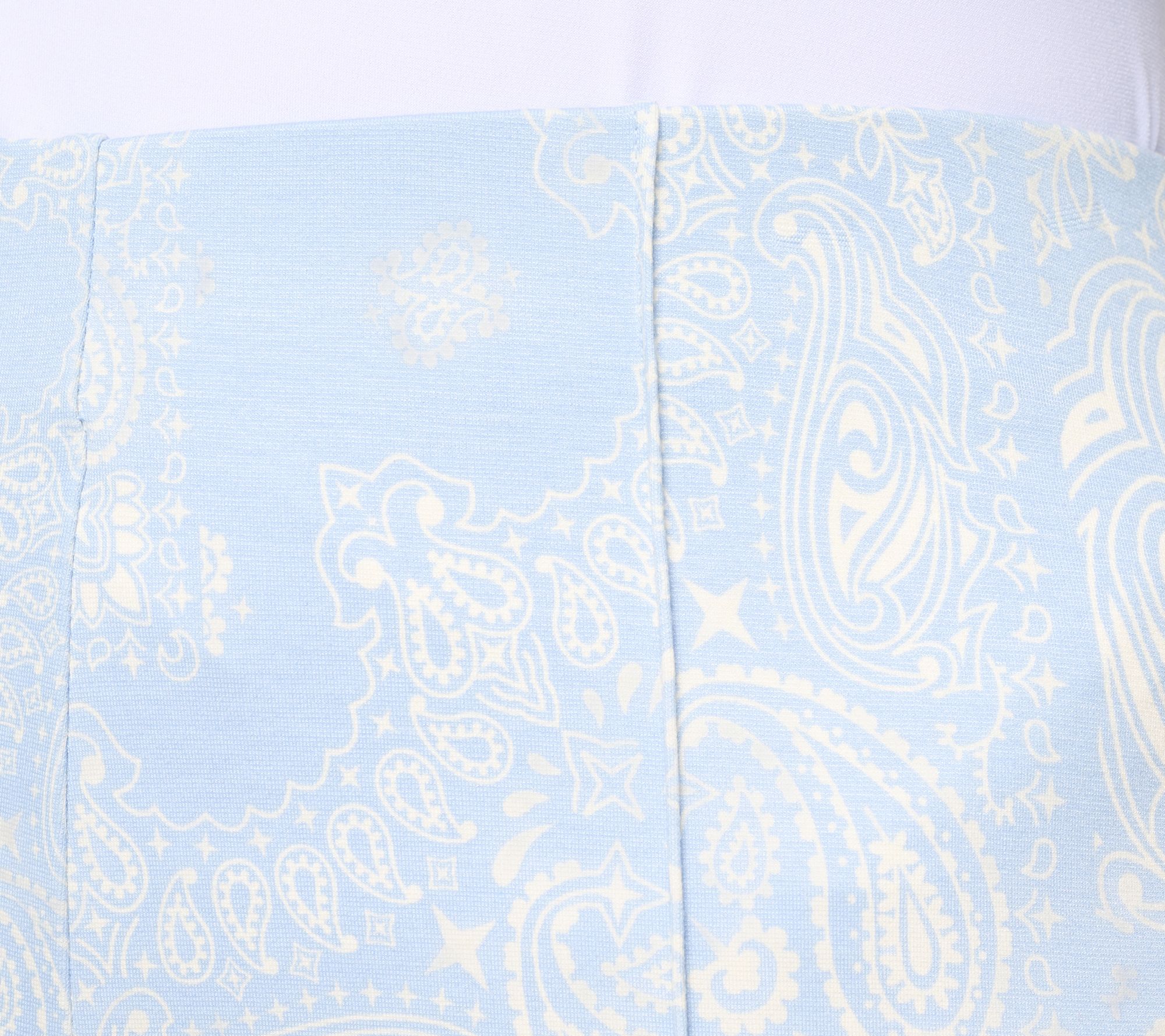 Features: printed, pull-on style, Hollywood waistband with flat, encased elastic, front pintucks