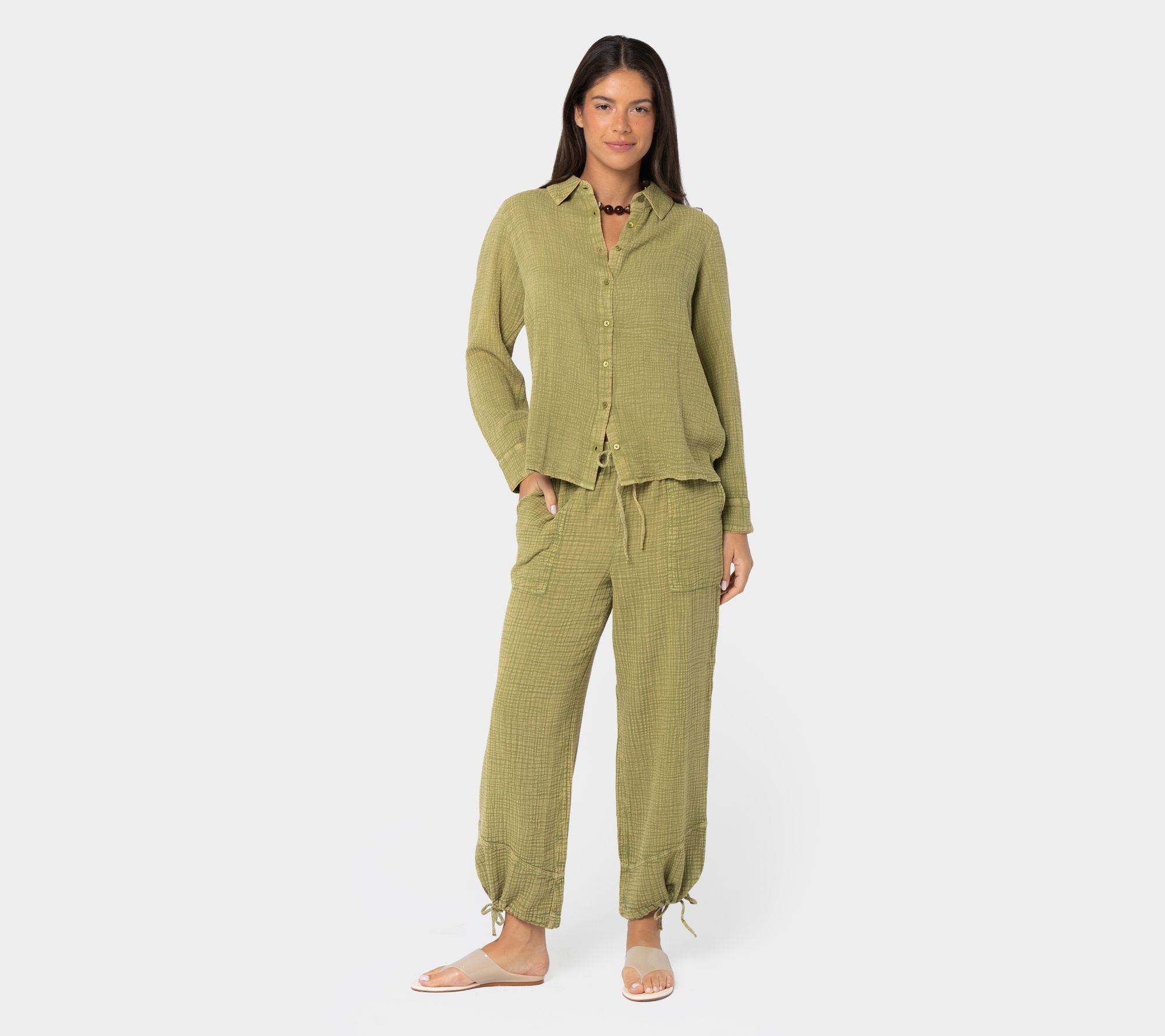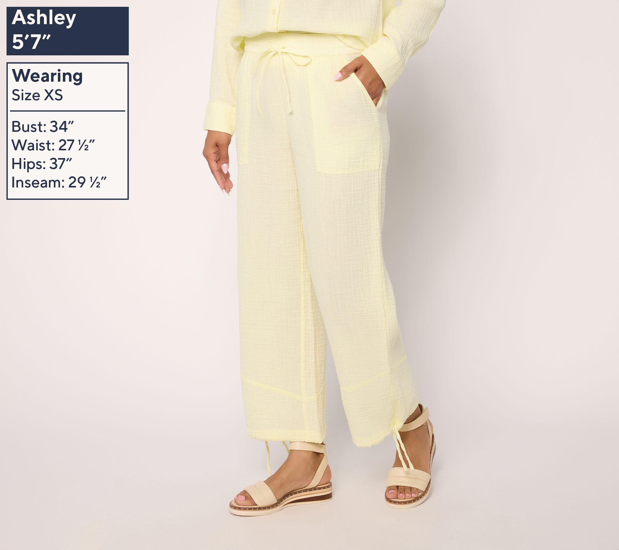 Vacation vibes or stay-cation state of mind? Make any moment easy breezy and stylish with these washed cotton gauze pants. Angled hem details, generous pockets, and drawcords at side leg seams add a playful personality to this summer savvy style. From Peace Love World.
