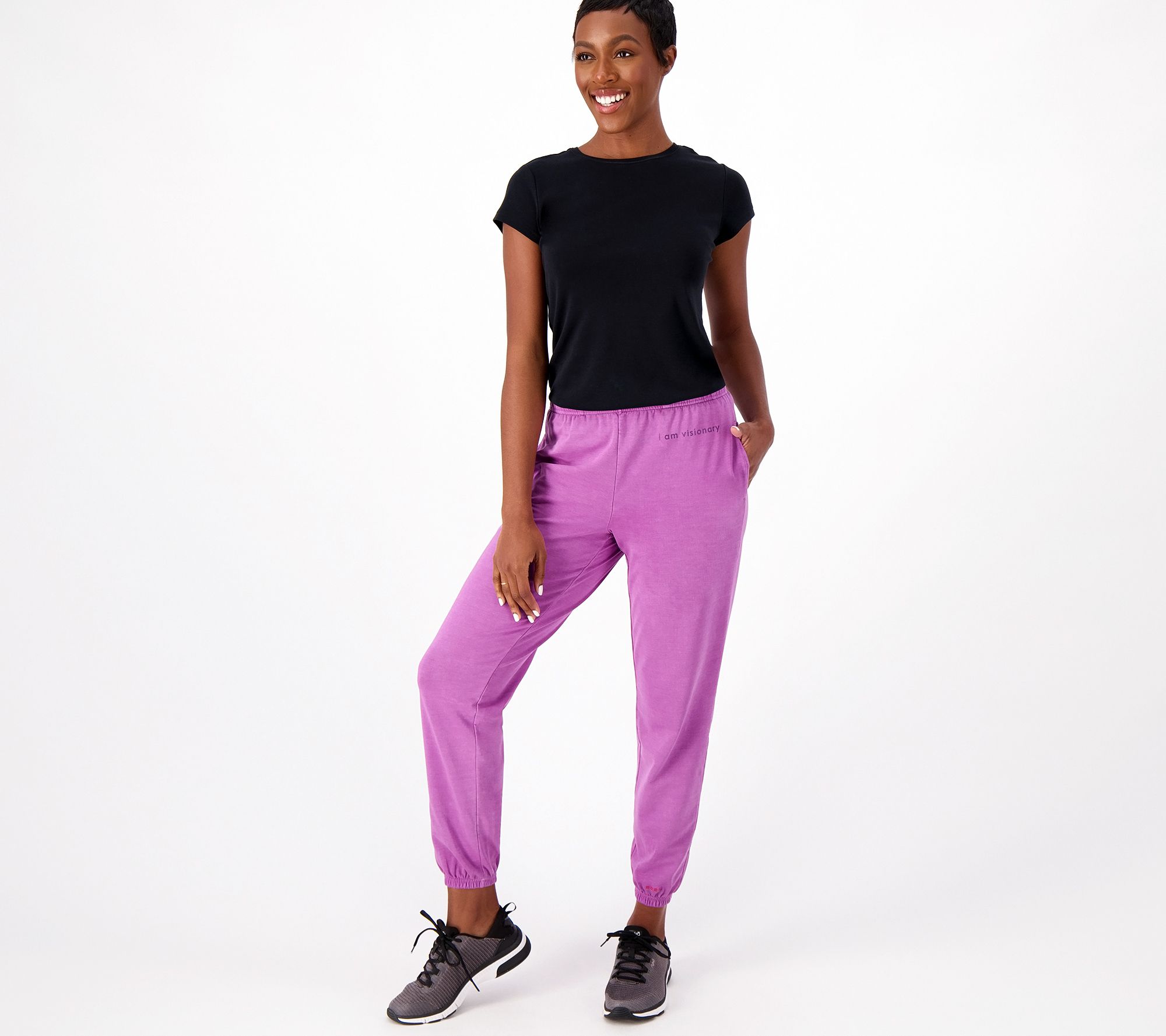 Features: tunneled elastic waistband with internal drawcord, side seam pockets with jersey pocket bag, elastic leg opening, inspiration message on left front hip