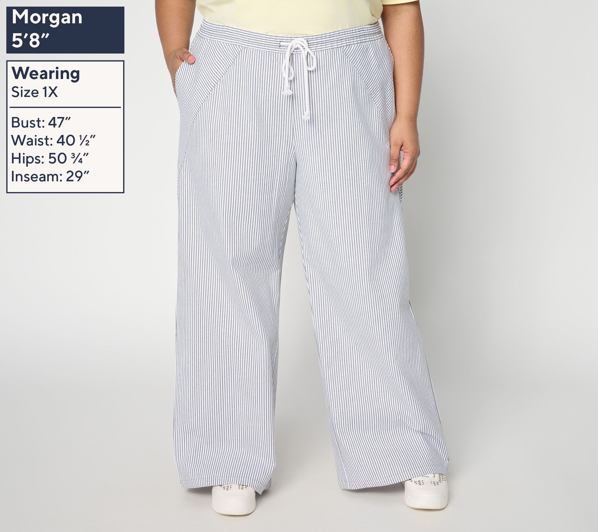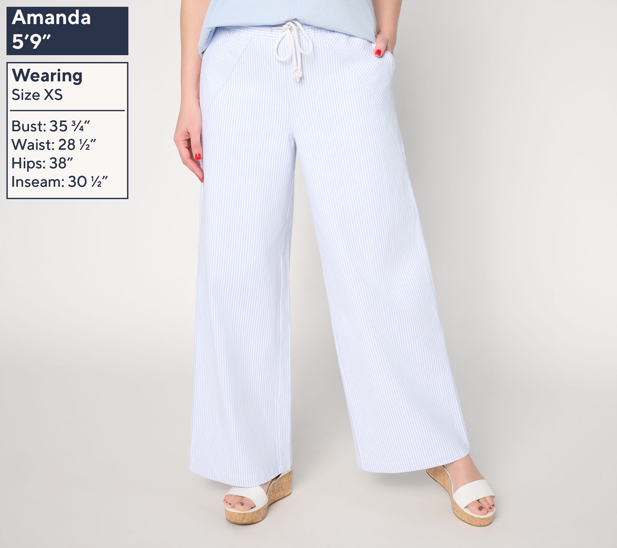 With trend-smart railroad stripes and a comfortable wide-leg cut, these full-length pants are just the ticket to a stylish new season. Easy-fitting through the hip and thigh, they're finished with a flexible elastic waistband, on-seam pockets, and thoughtful angled seaming for a flattering touch. Pair with your go-to top and sneakers for an upbeat, versatile look. From Peace Love World.