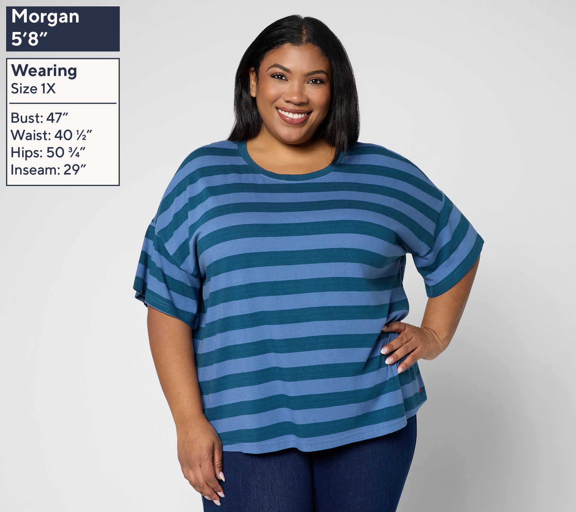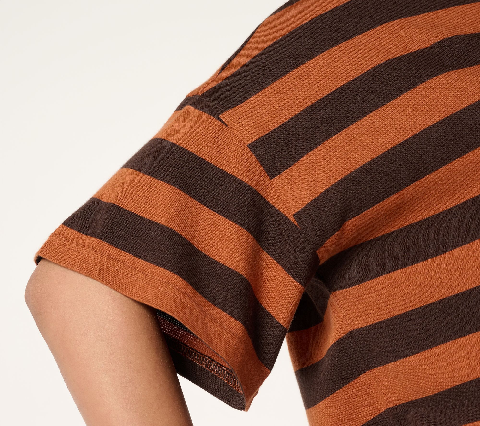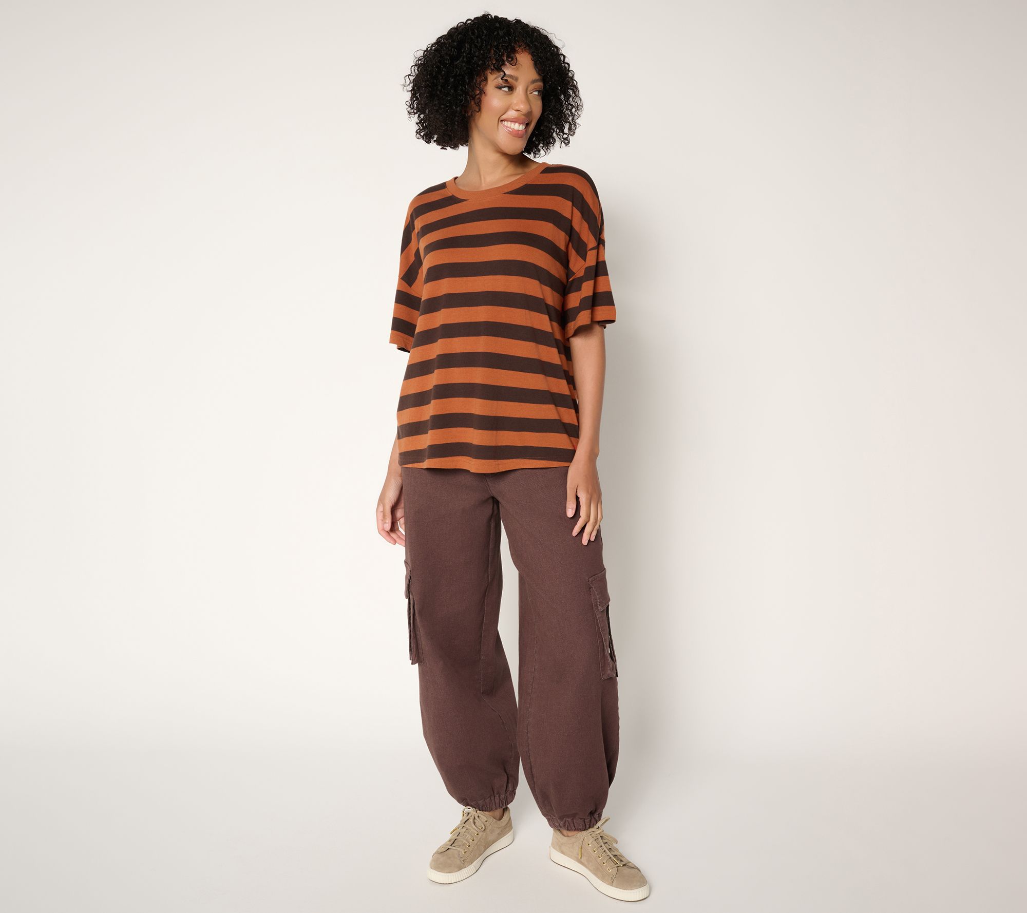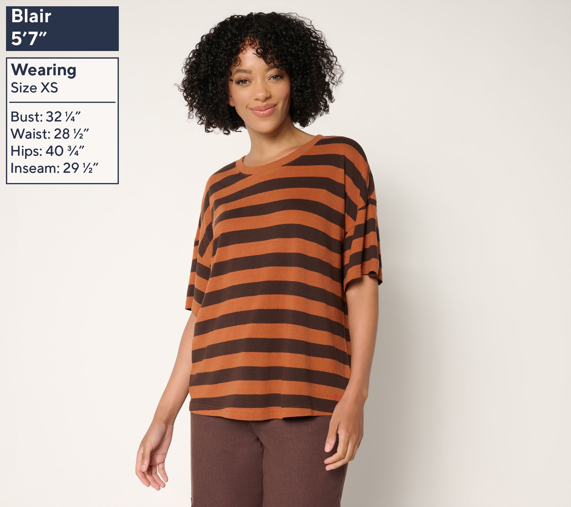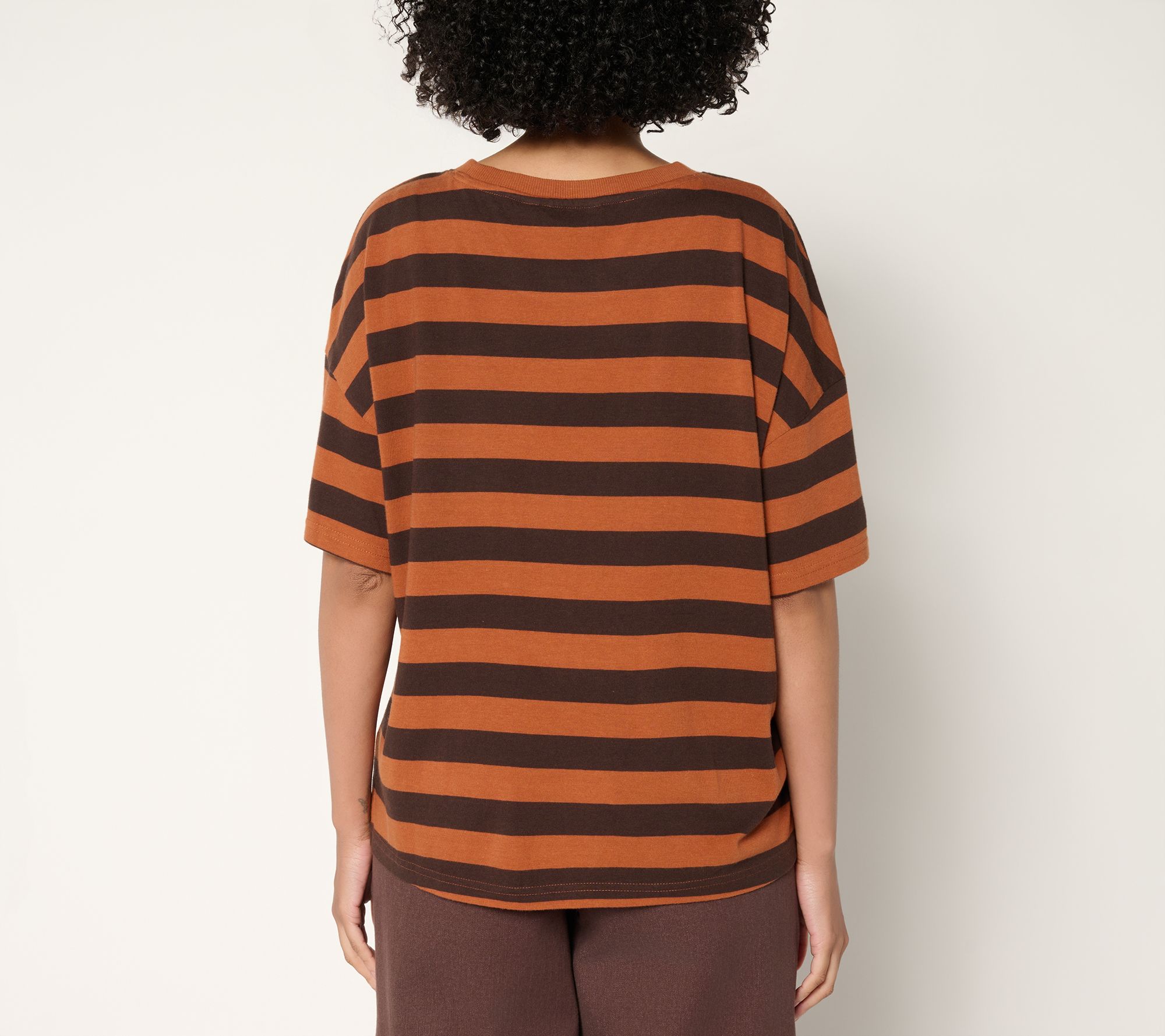 Whether you're meeting up with friends or lounging at home, this striped cotton knit tee brings effortless ease to your day. Designed with a relaxed, boxy shape, crew neckline, and drop shoulders, it adds a laid-back touch to jeans or leggings while keeping you cool and comfortable. From Peace Love World.