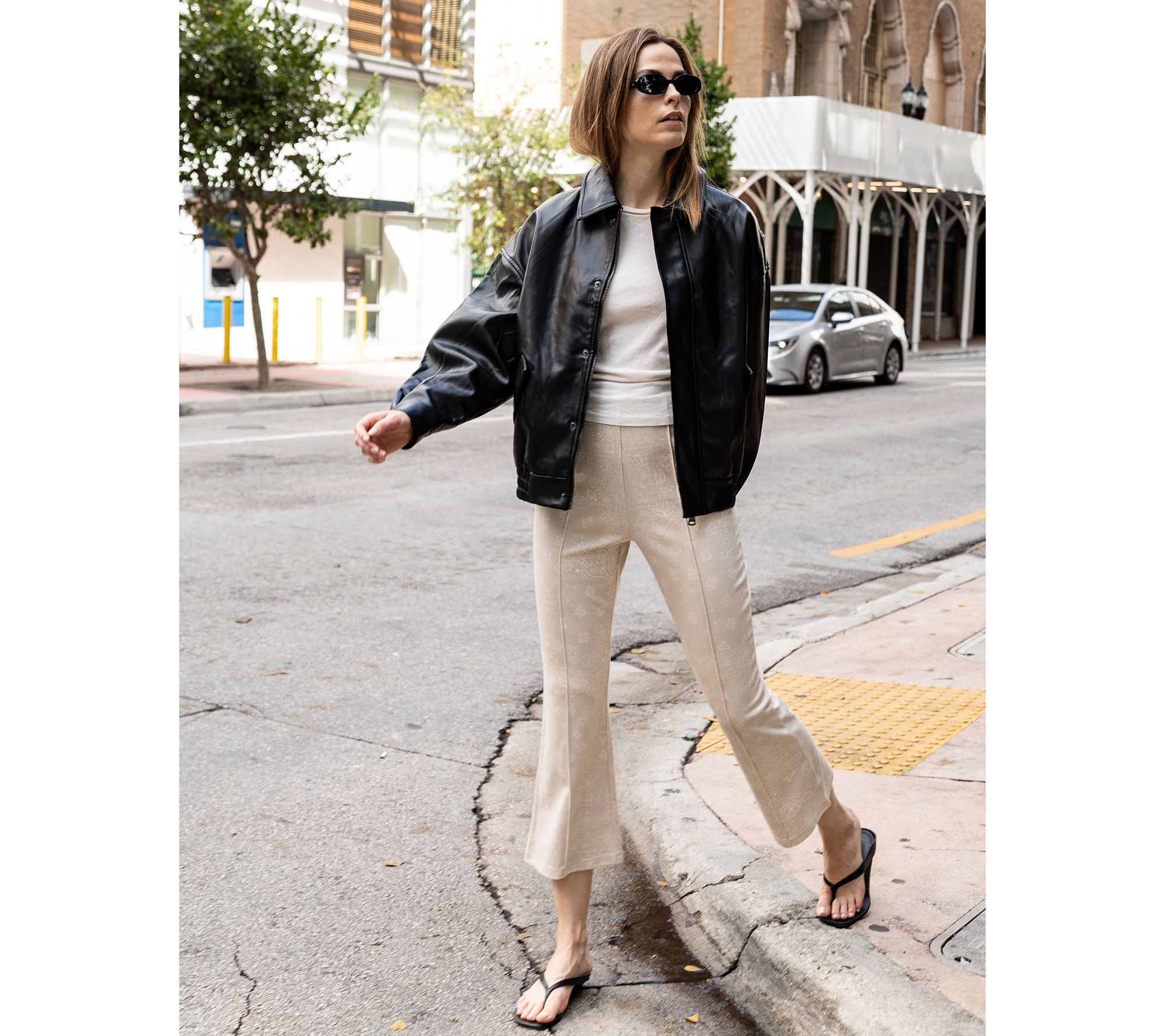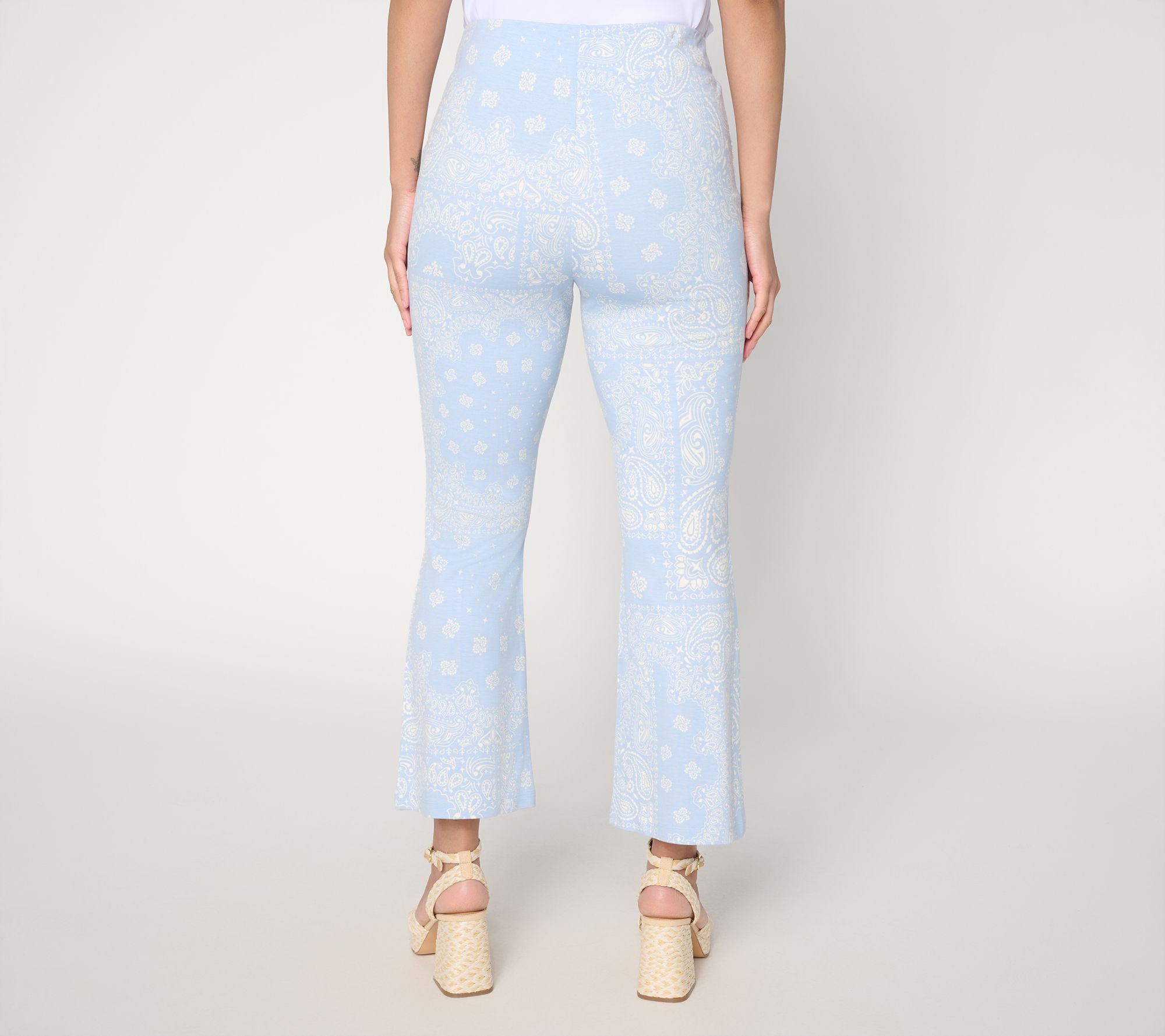 Designed to sweeten social engagements or add a lively twist to daily routines, these printed pull-on crop pants deliver flair and figure-flattering comfort. The Hollywood waistband and front pintucks create a smooth, tailored effect, while the flared leg and stretchy-smooth fabric make moving through your day a breeze. From Peace Love World.