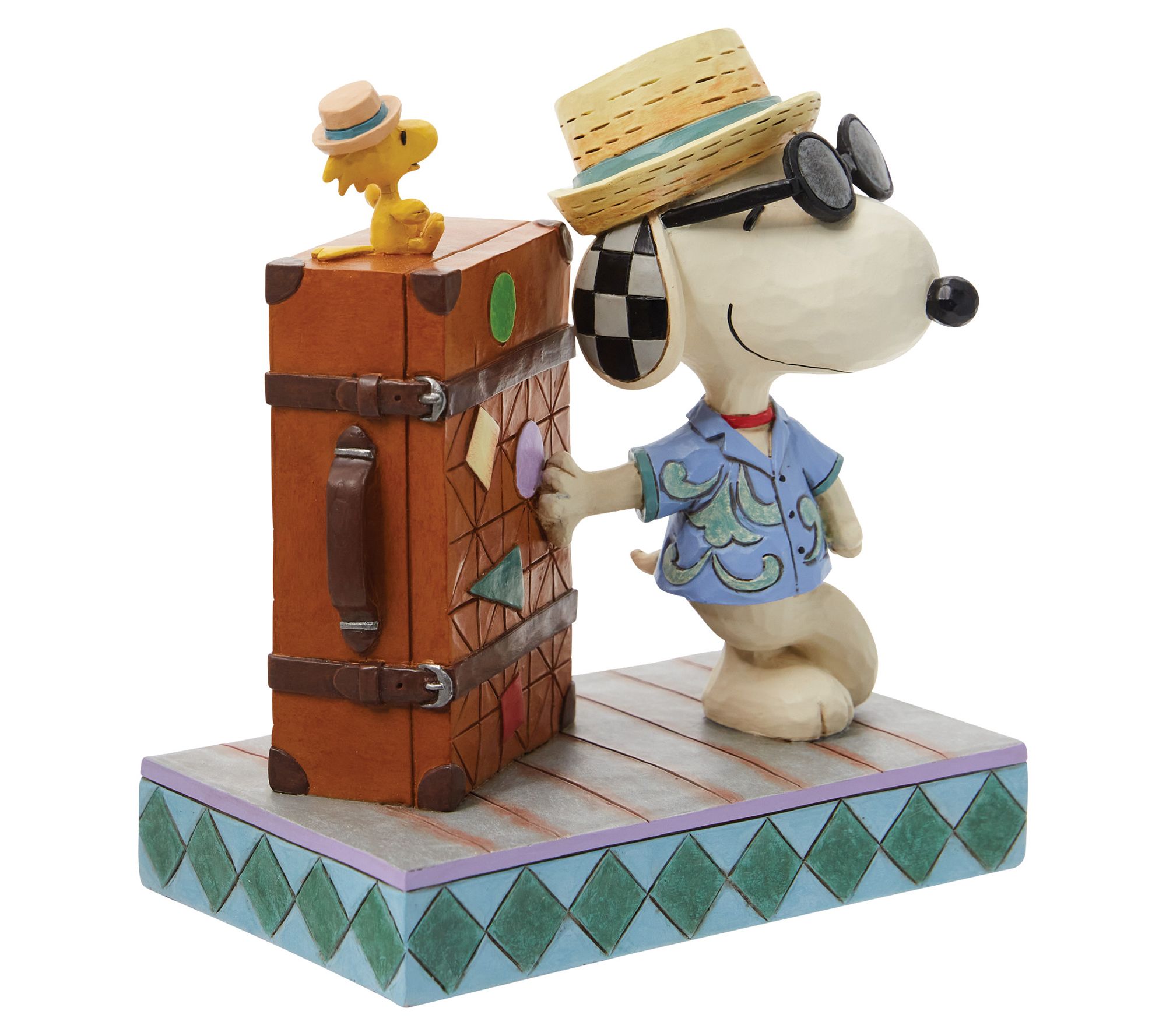 Embark on a whimsical journey with this fun figurine, capturing the essence of adventure with Snoopy and Woodstock donning straw hats and shades, ready to explore the world. This charming piece, adorned with a patchwork suitcase, brings a touch of whimsy and wanderlust to any space. From Jim Shore.