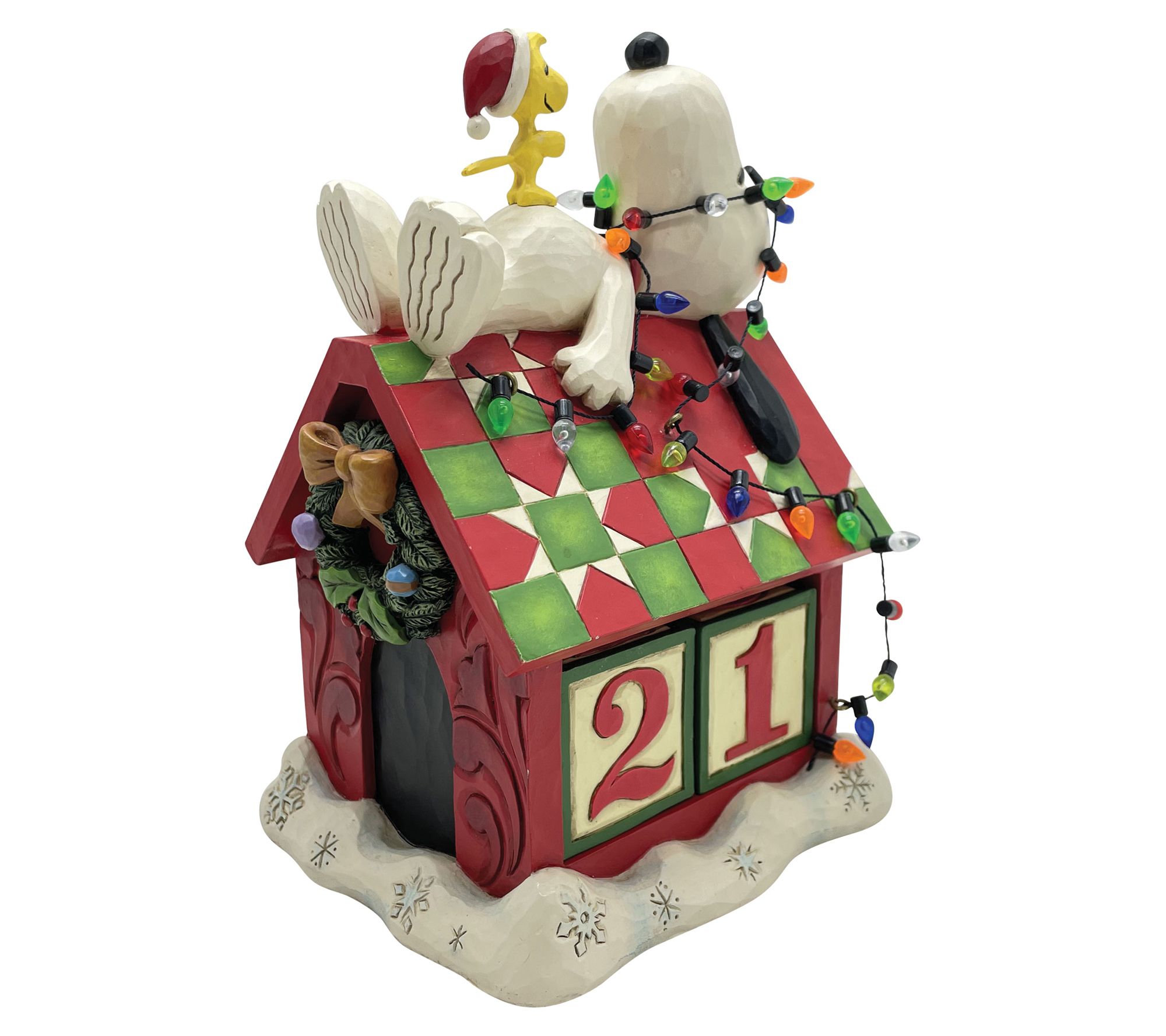 Celebrate the season with Peanuts by Jim Shore's Snoopy's Countdown Calendar, capturing a charming scene of Snoopy asleep on his doghouse while Woodstock decorates. This delightful piece combines the joy of holiday anticipation with the whimsy of beloved characters. From the Peanuts Collection by Jim Shore.