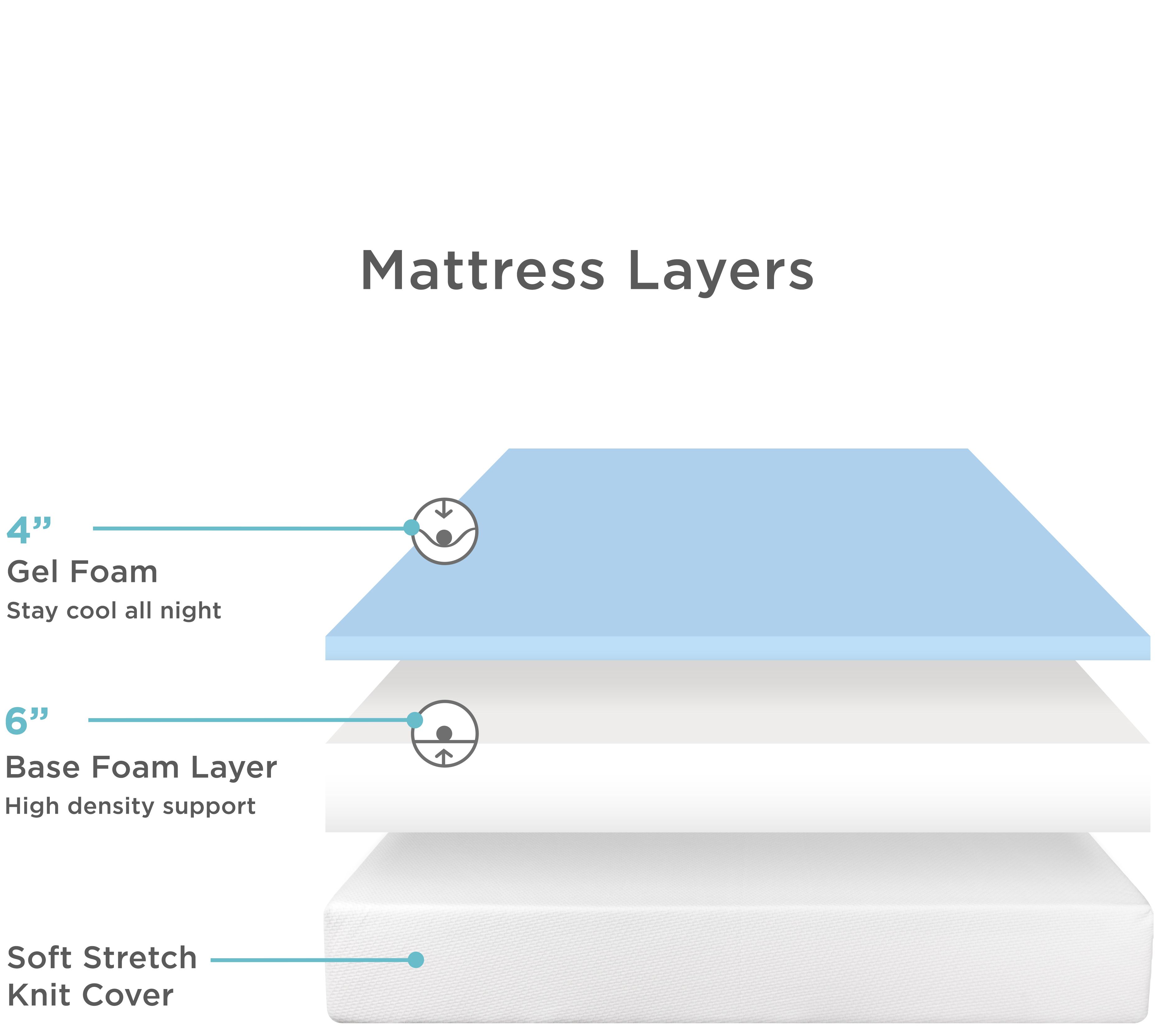 Love the way you sleep atop this gel foam mattress by PedicSolutions. The lightweight mattress pairs a 6" high-density foam base layer and a 4" gel comfort foam top layer with an open-cell structure for support and breathability. Its open-cell structure retains less heat than closed-cell foam, so you can wake feeling refreshed and invigorated. From PedicSolutions.