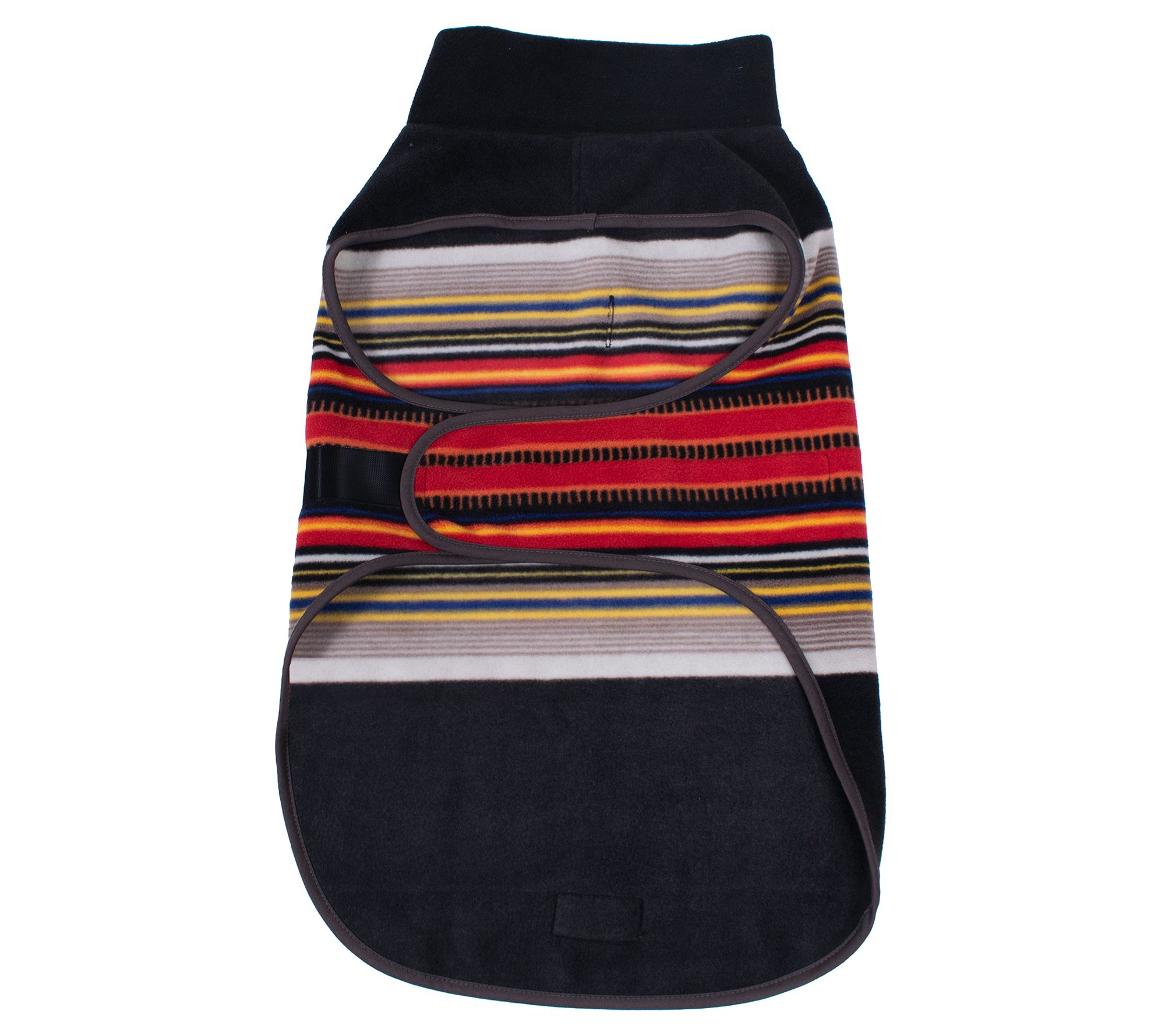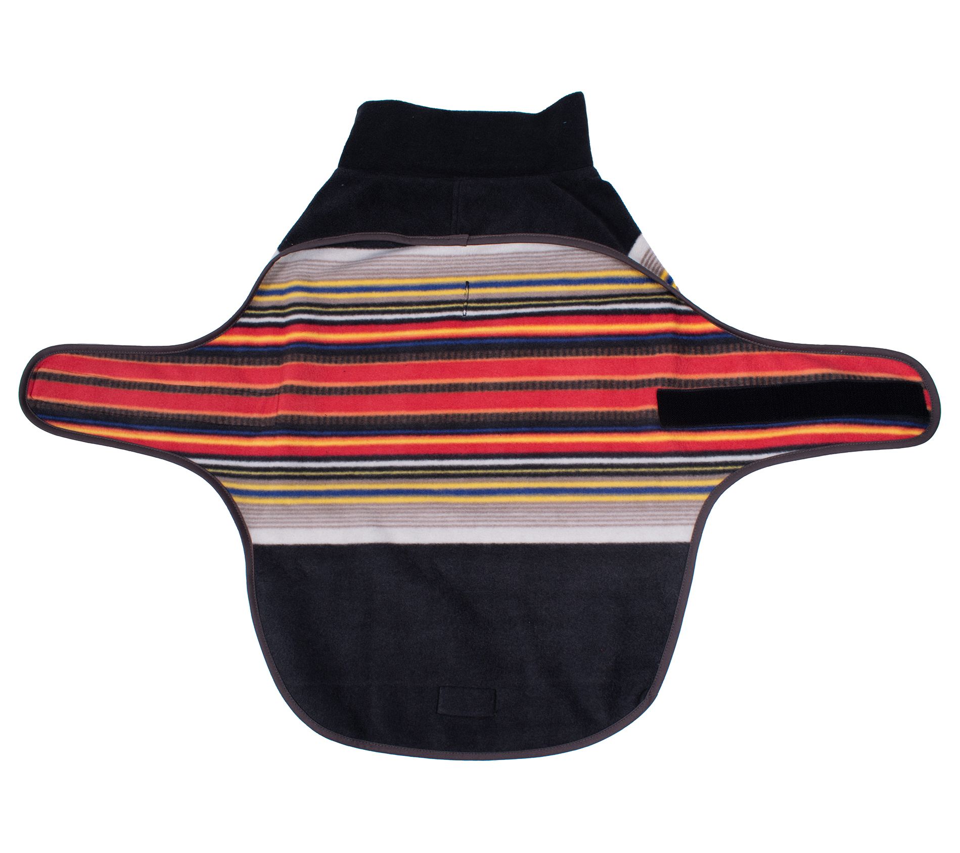 The Pendleton X-large National Park dog vest is perfect for those brisk days. With bold colored stripes on a polar fleece background, this fitted vest features an over-the-head design and a hook-and-loop belt closure for easy adjustability. Plus, it has a cutout to hook your leash to your dog's harness or collar. From Pendleton.