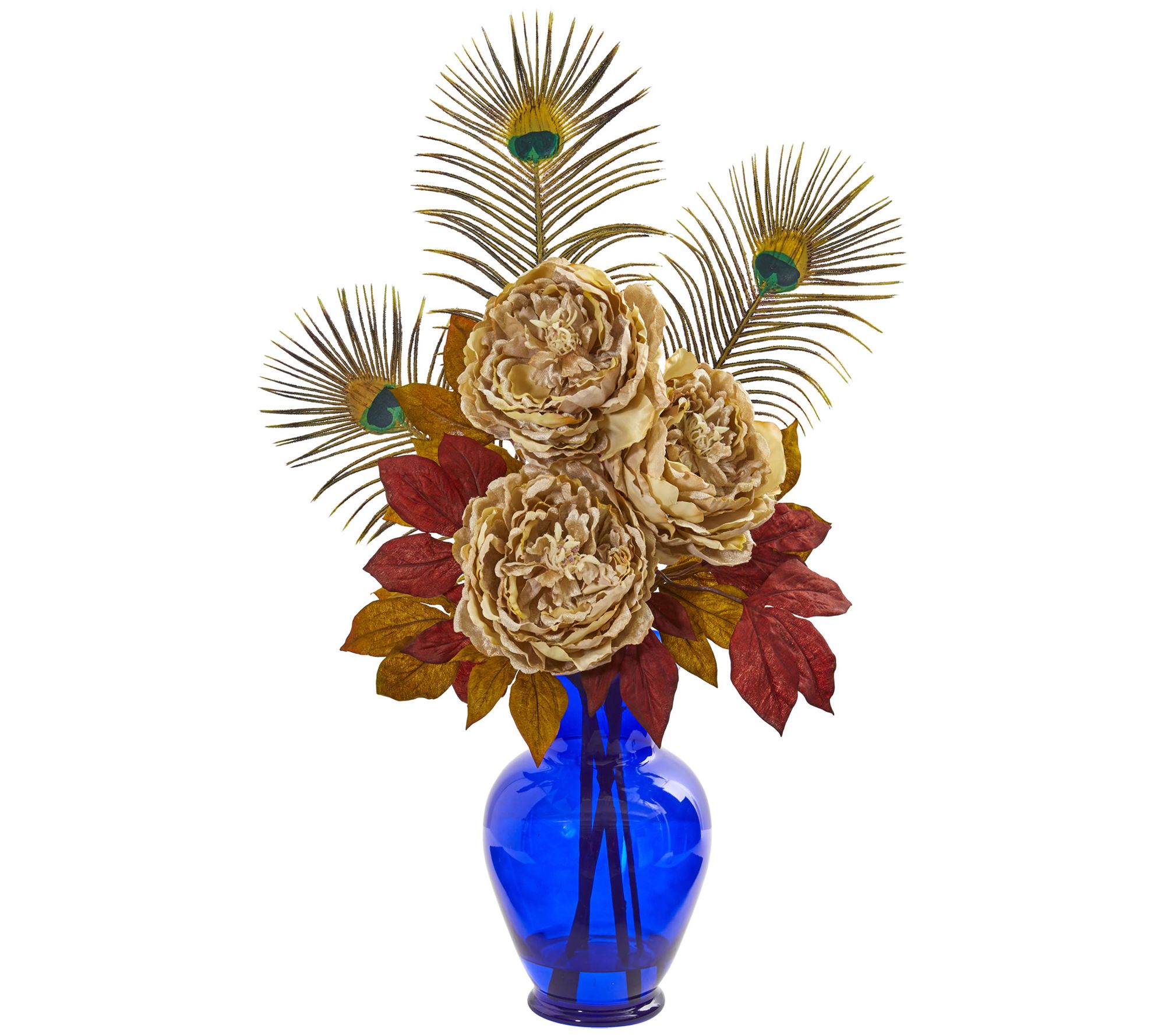Peony Arrangement in a Blue Vase by Nearly Natural