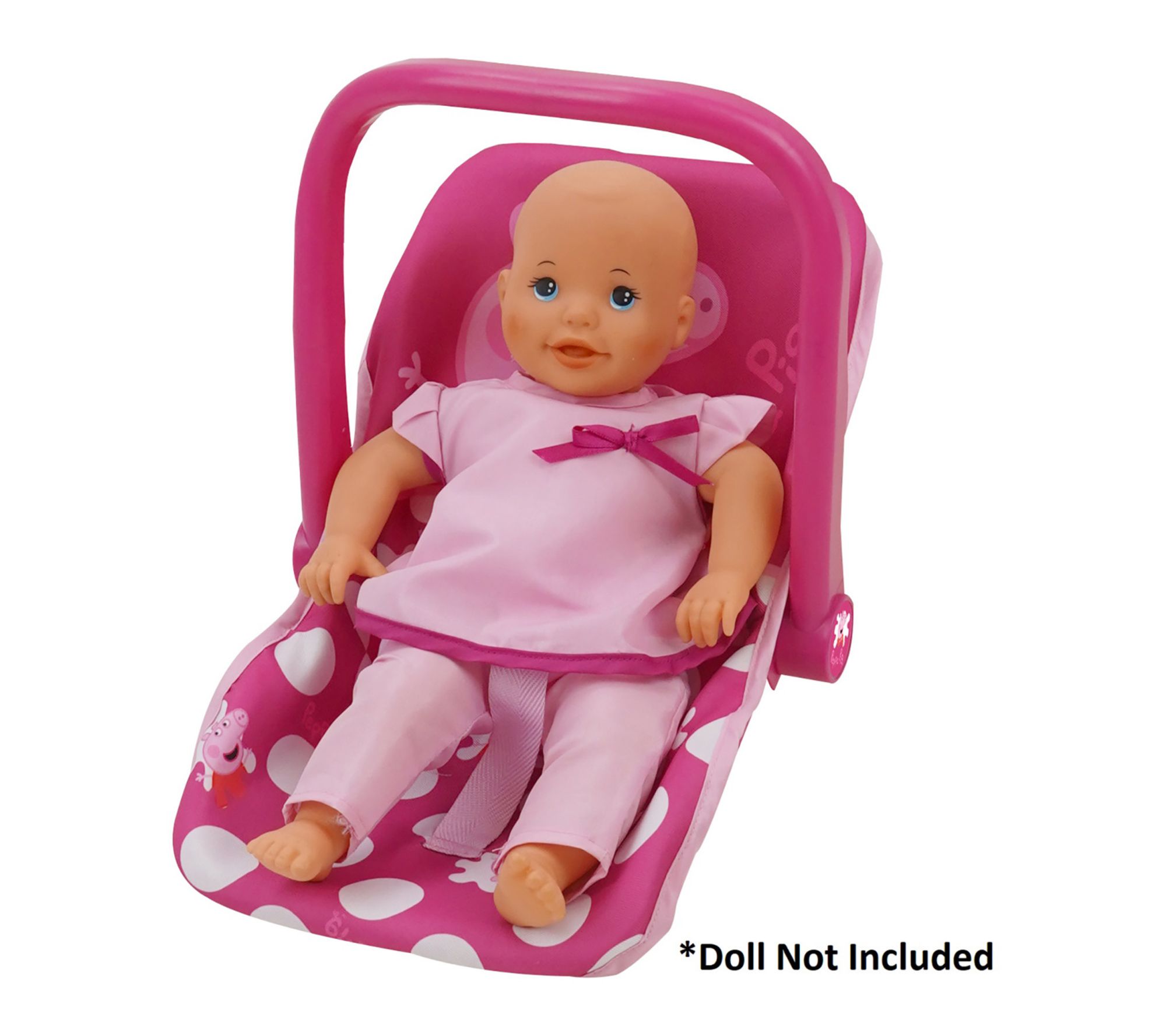 Little ones will delight in using this Peppa Pig Baby Doll Car Seat for role-play adventures with their favorite dolls or stuffed animals. Designed with a three-point safety seat belt, it keeps playtime secure while the handle easily transitions to a feeding chair or bouncer. Featuring a cheerful pink and white polka dot pattern with removable, easy-to-clean fabric, this versatile accessory fits dolls up to eighteen inches for on-the-go and at-home fun. From Peppa Pig.