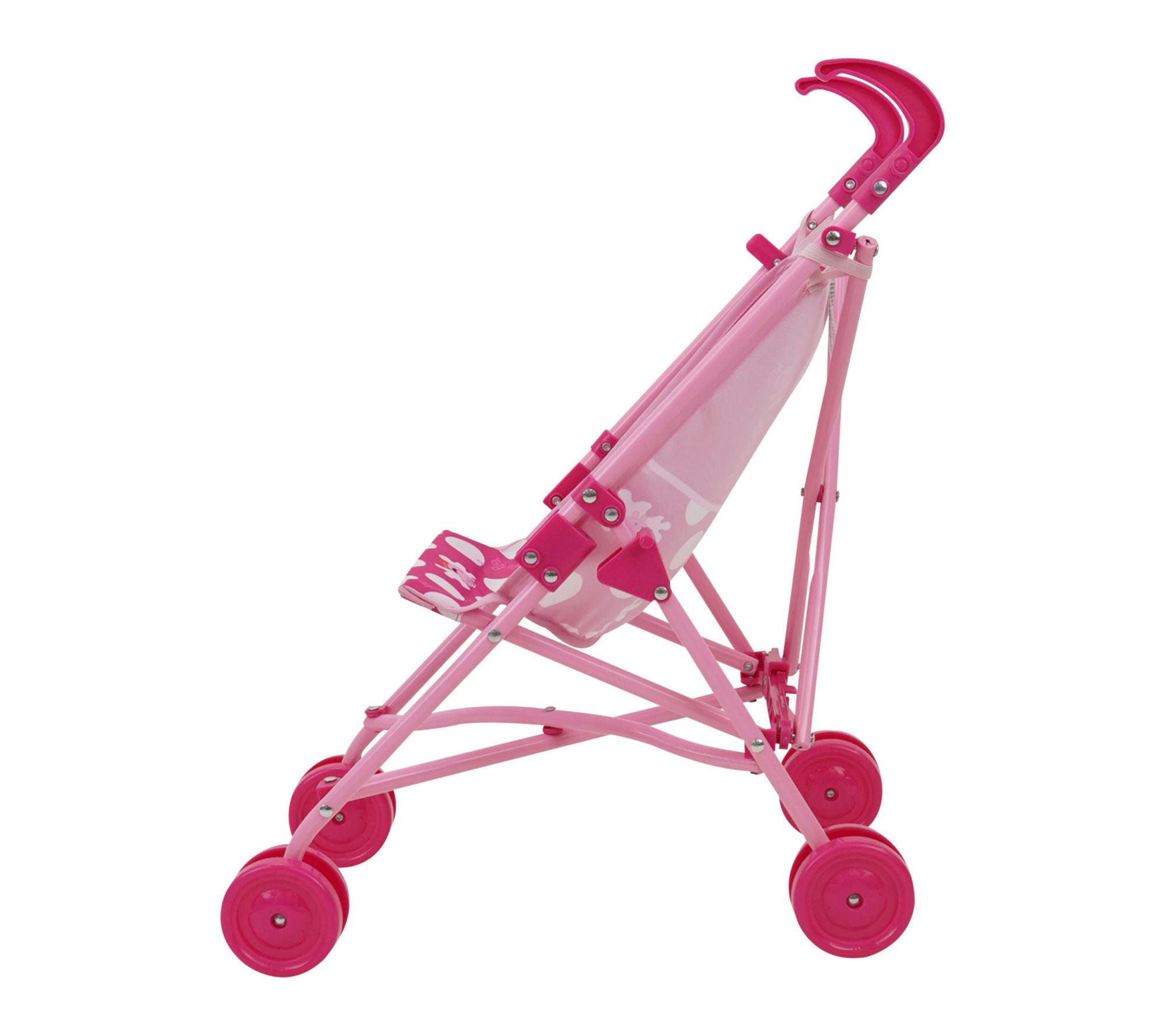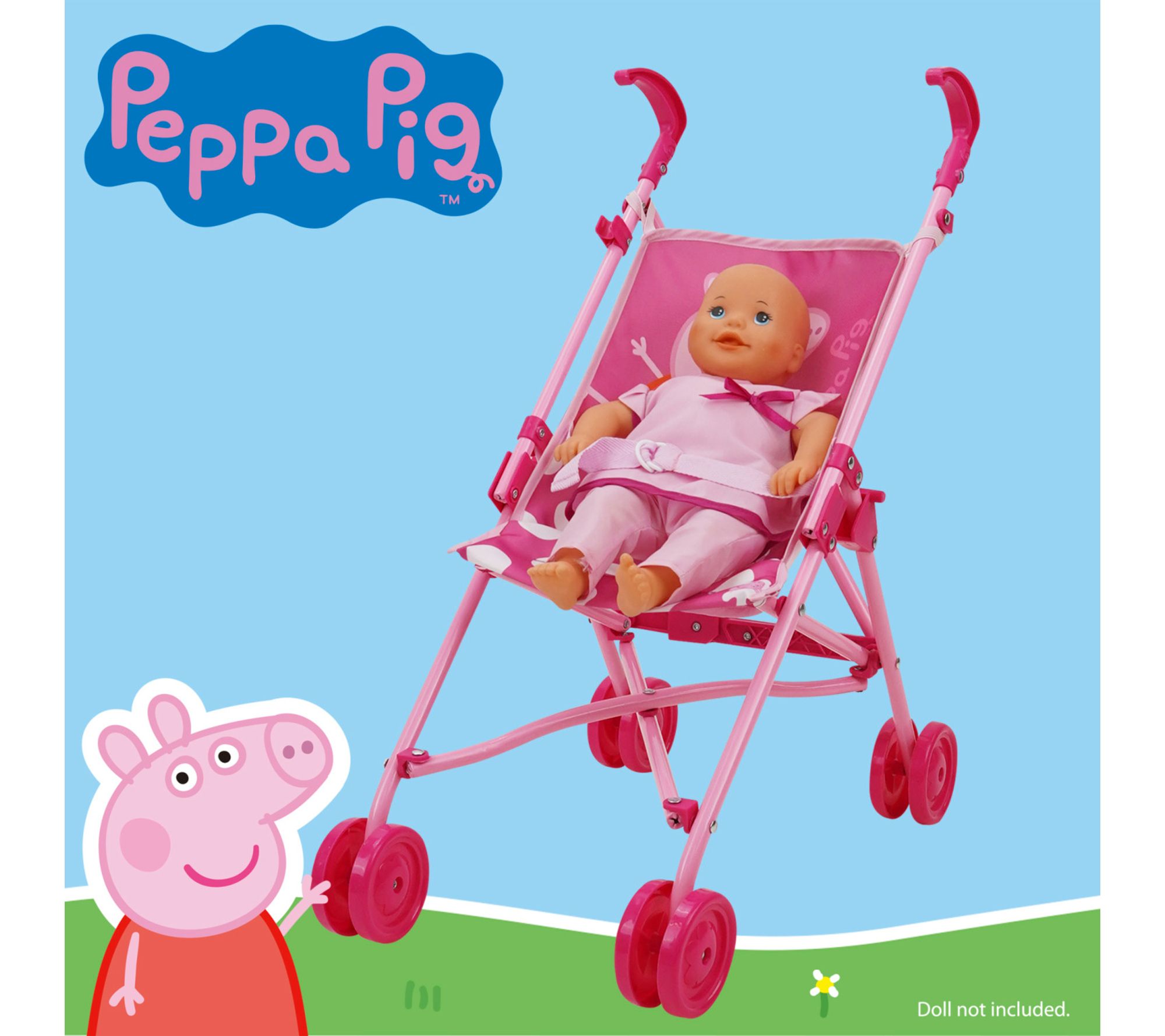 Brighten playtime and encourage real-world role play with this Peppa Pig doll umbrella stroller. Outings become more interactive as children secure their favorite doll or stuffed animal with the adjustable seat belt, unfold the lightweight frame, and wheel through adventures at home or away. Cheerful pink and white dots with Peppa Pig details add a playful touch to every imaginative journey. From Peppa Pig.