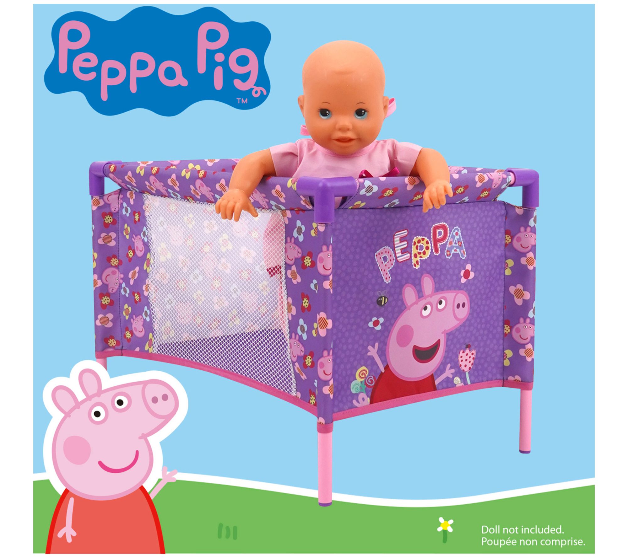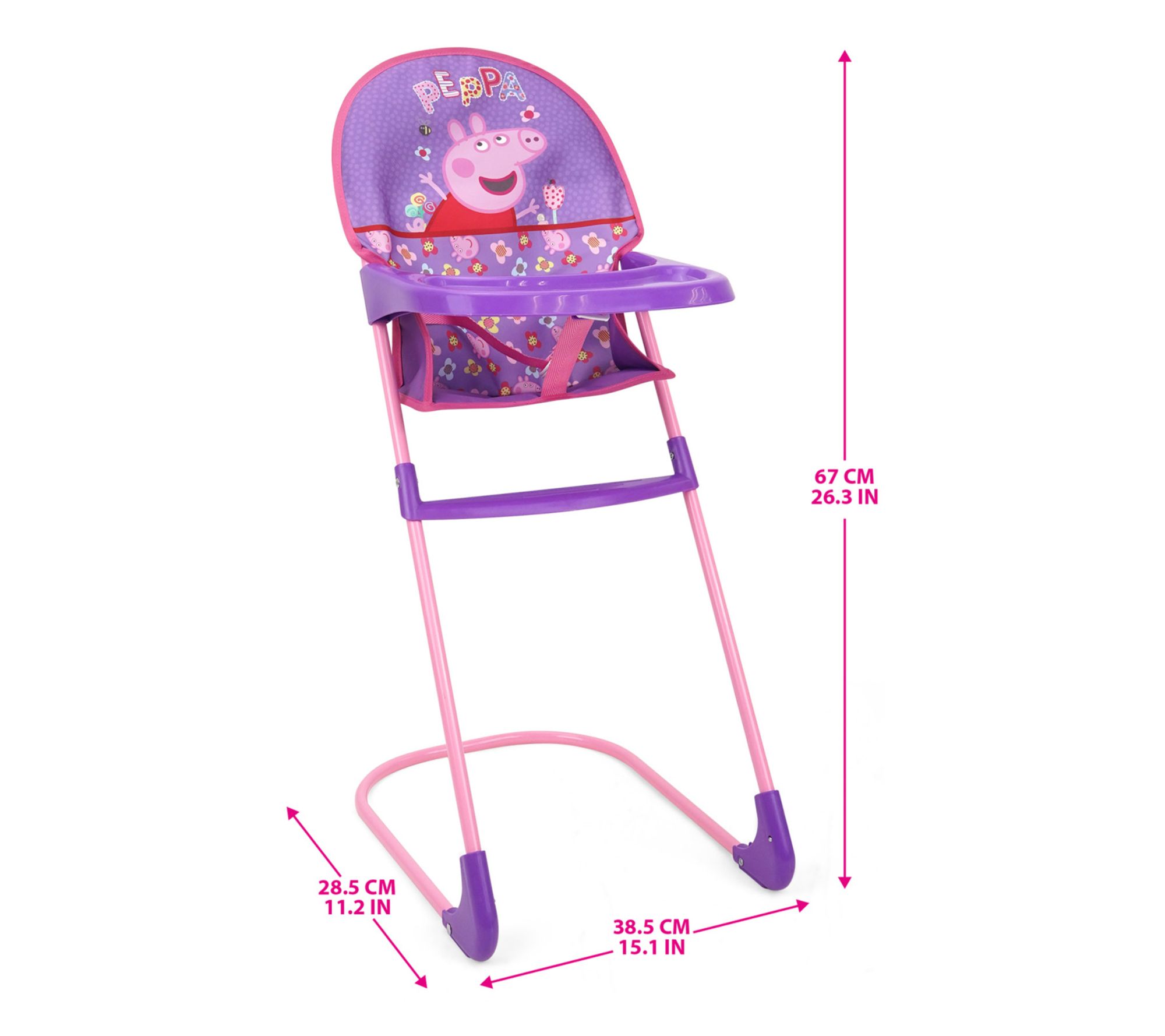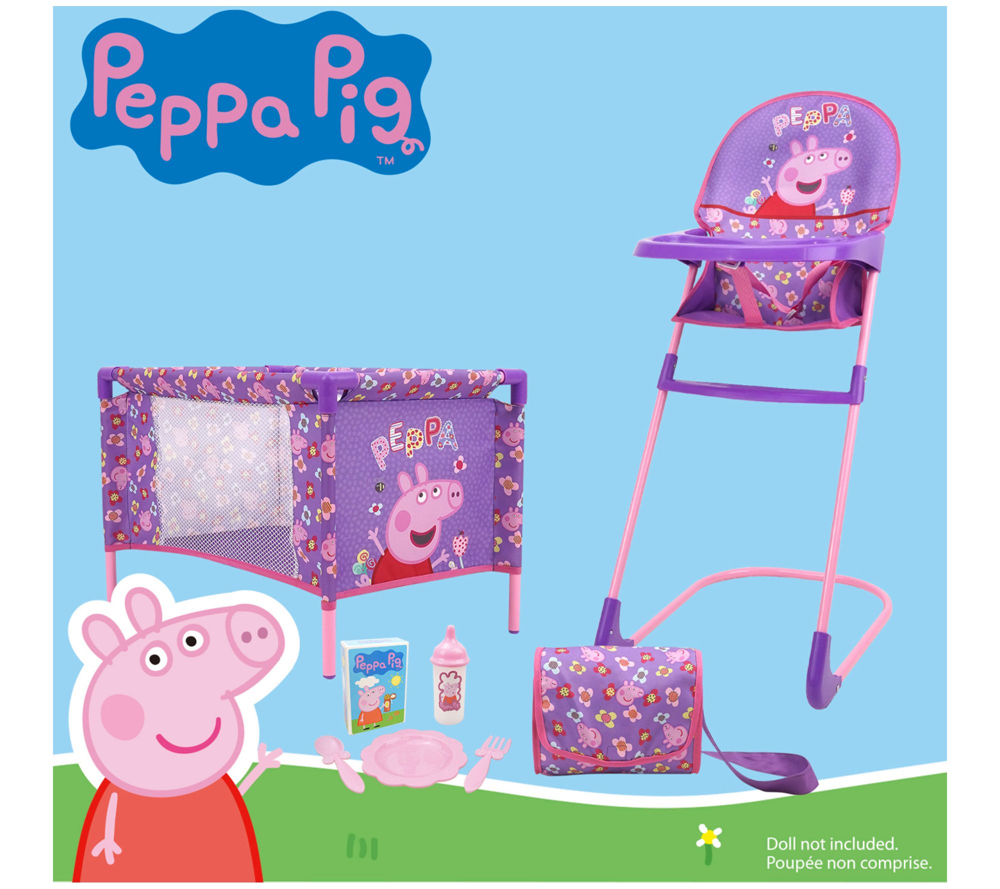 Let your child's imagination soar with the Peppa Pig eight-piece toy set. This delightful collection includes a doll play yard, highchair, handbag, and feeding accessories, perfect for nurturing play.