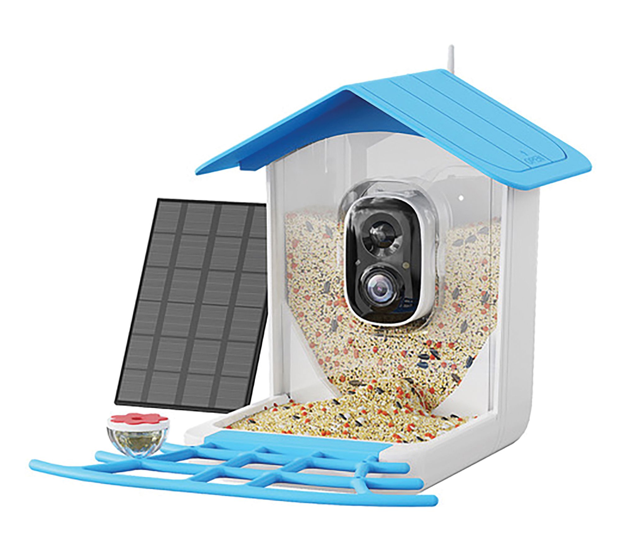 Includes smart bird feeder with camera, solar panel, hummingbird honey box, and four fruit forks