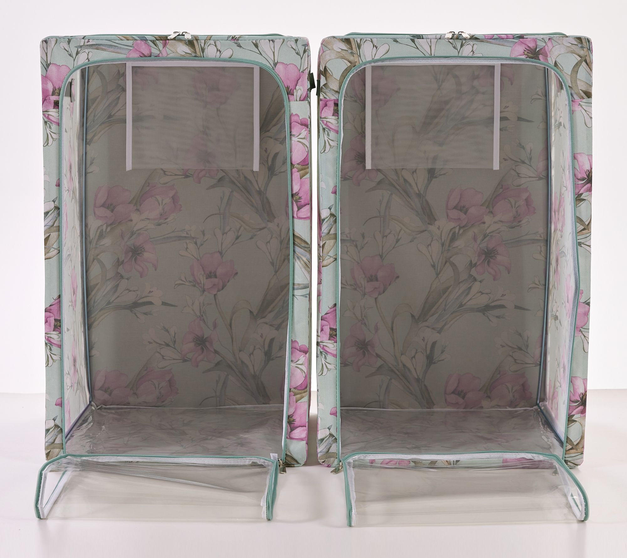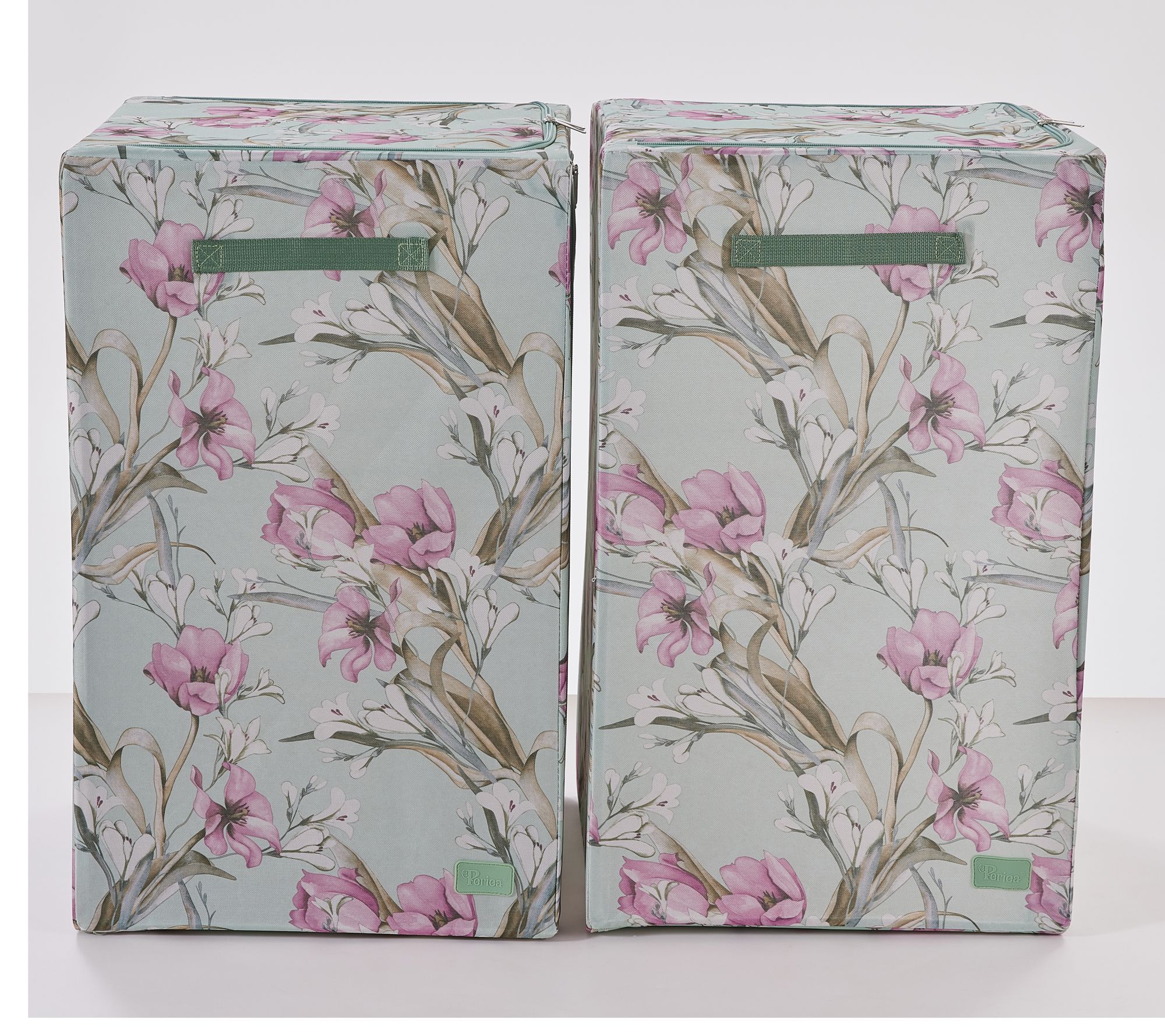Laundry day runs smoothly with this set of two collapsible laundry hampers -- ideal for collecting and transporting clothes from the bedroom, bathroom, or laundry room. Sturdy side handles and a zippered top and front make carrying and accessing items a breeze, while the clear viewing panel makes sorting a snap. When chores are done, simply fold them flat for simple storage. From Periea.