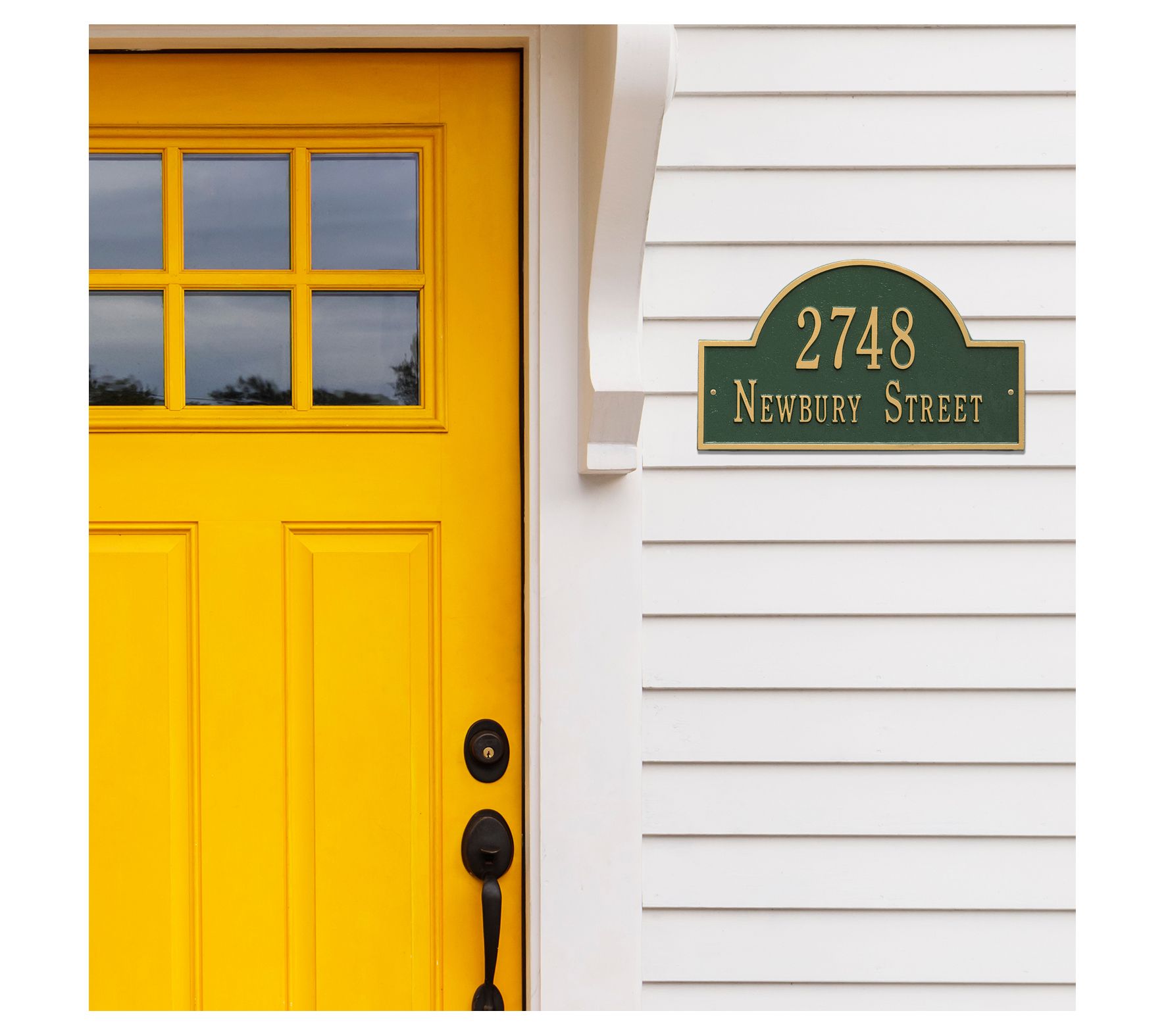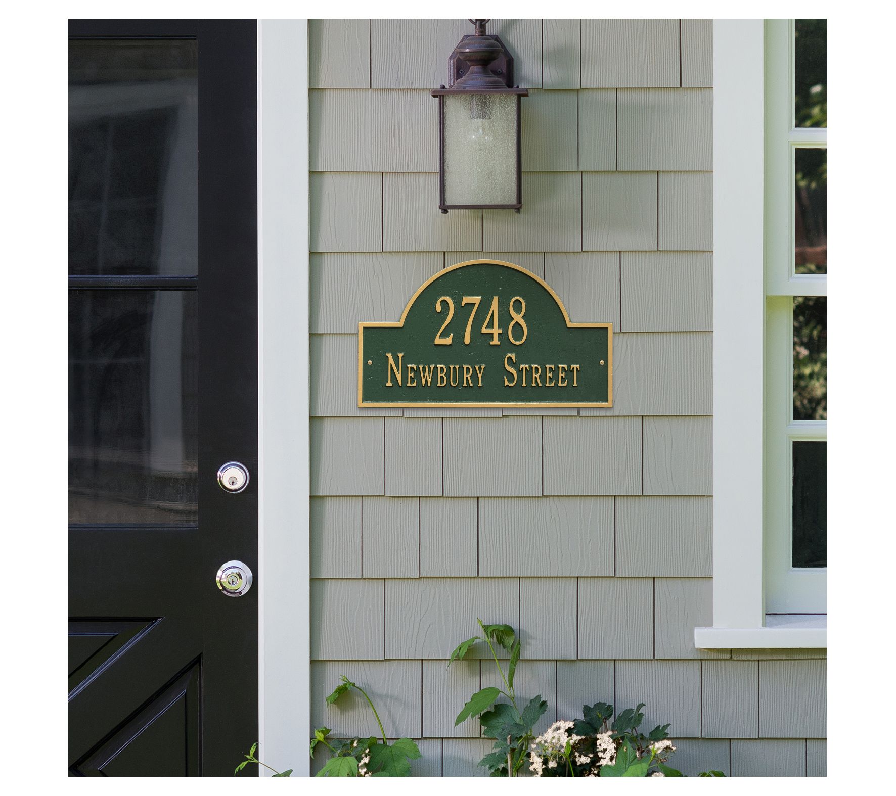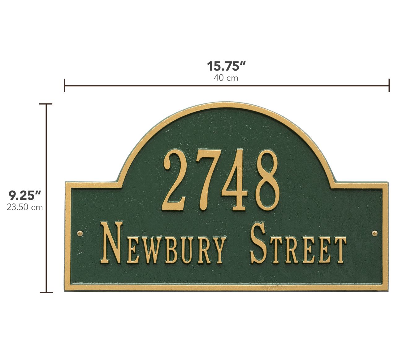 Display your address with distinction. This sign is crafted from cast aluminum and given a weather-resistant finish. Fit up to five 3" characters within the arch on the top line and up to 17 1-1/4" characters on the bottom line.