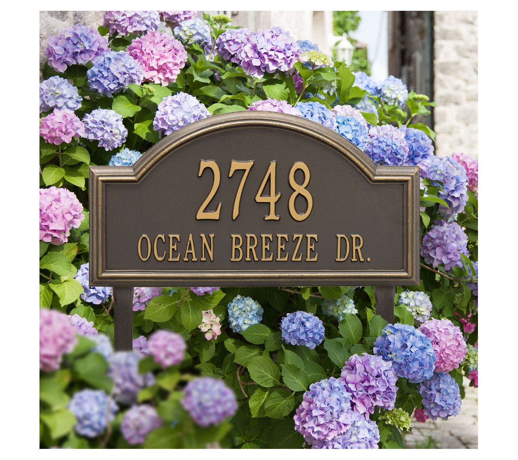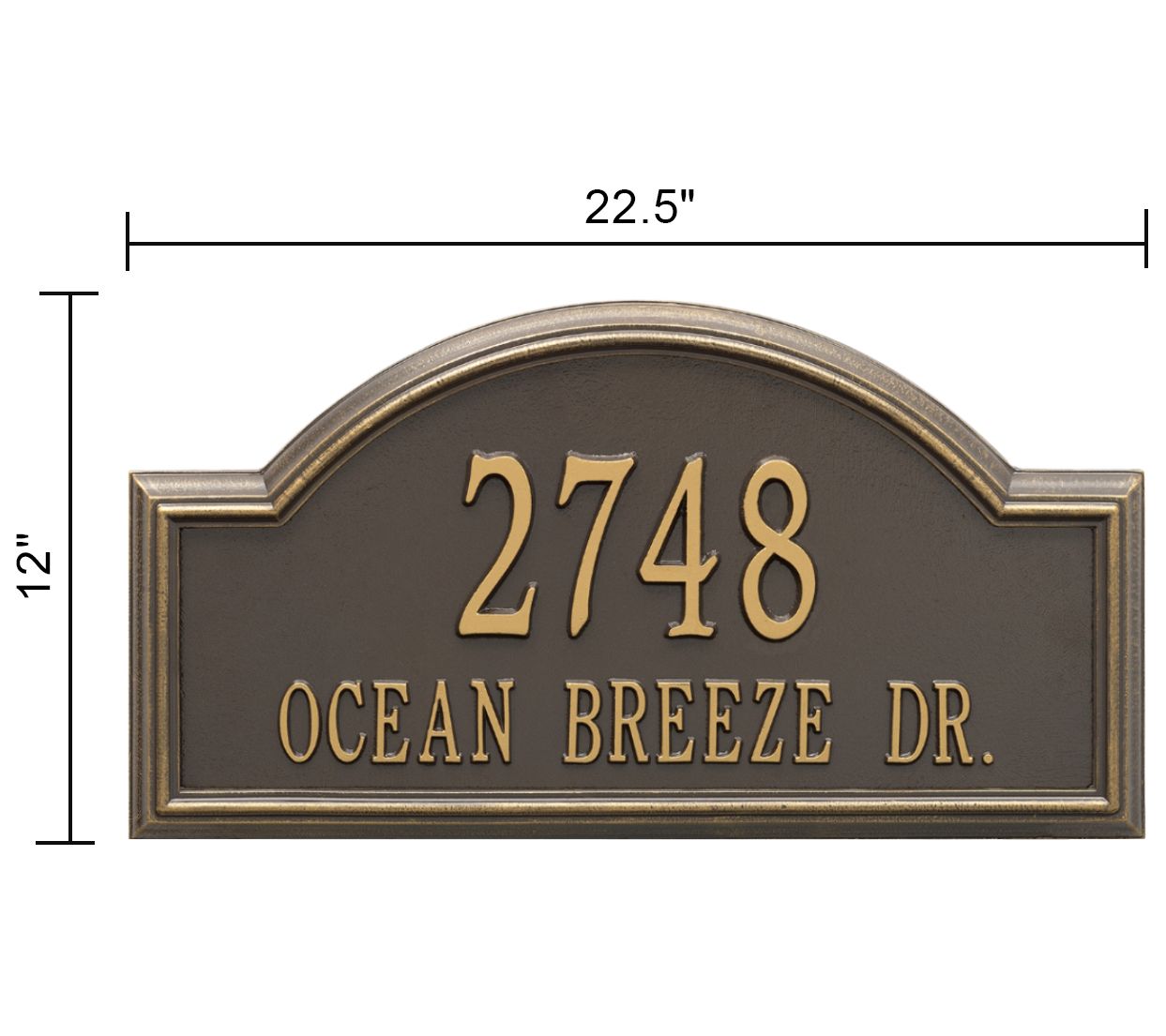 Announce your address with this arched Providence estate lawn sign. The generously sized sign is crafted from cast aluminum and given a weather-resistant finish. Fit up to five 4" characters on the top line and up to 17 1-3/4" characters on the bottom line.