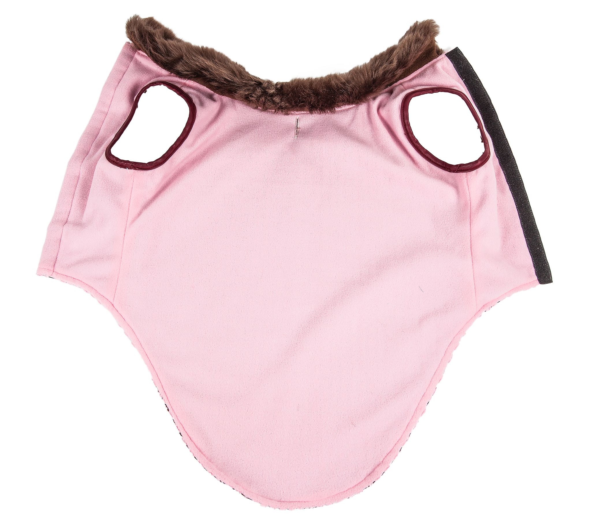 • Features: faux fur collar, leash slit neckline, Velcro belly closures