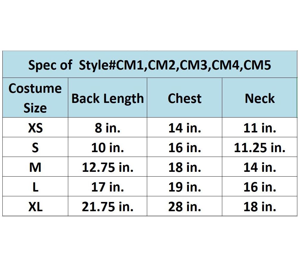 • Sizing length measured from neck to tail area: X-Small fits dogs up to 8"L; Small fits dogs from 10" to 12"L; Medium fits dogs 14" to 16"L; Large fits dogs 18" to 20"L; X-Large fits dogs 22" to 24"L