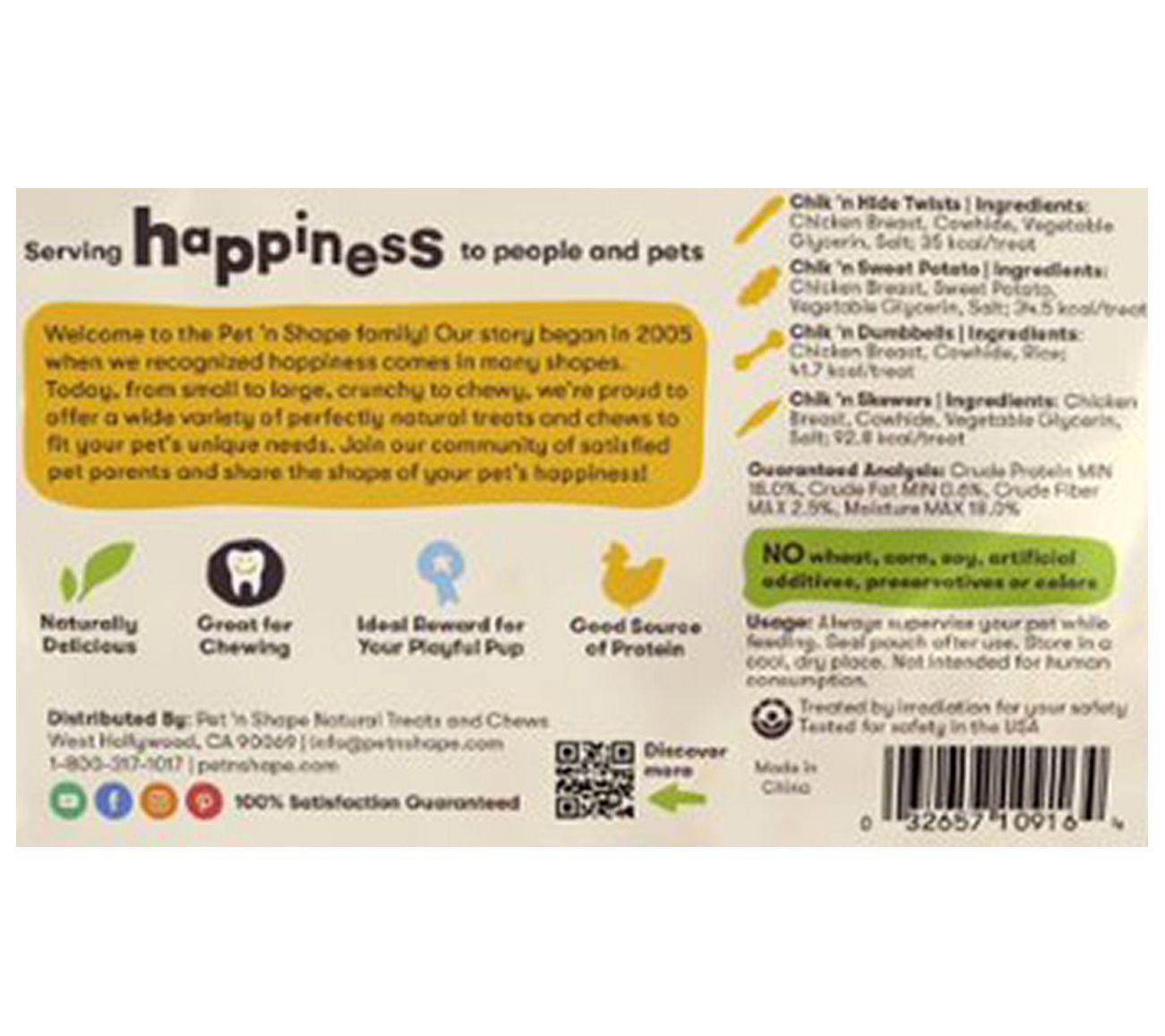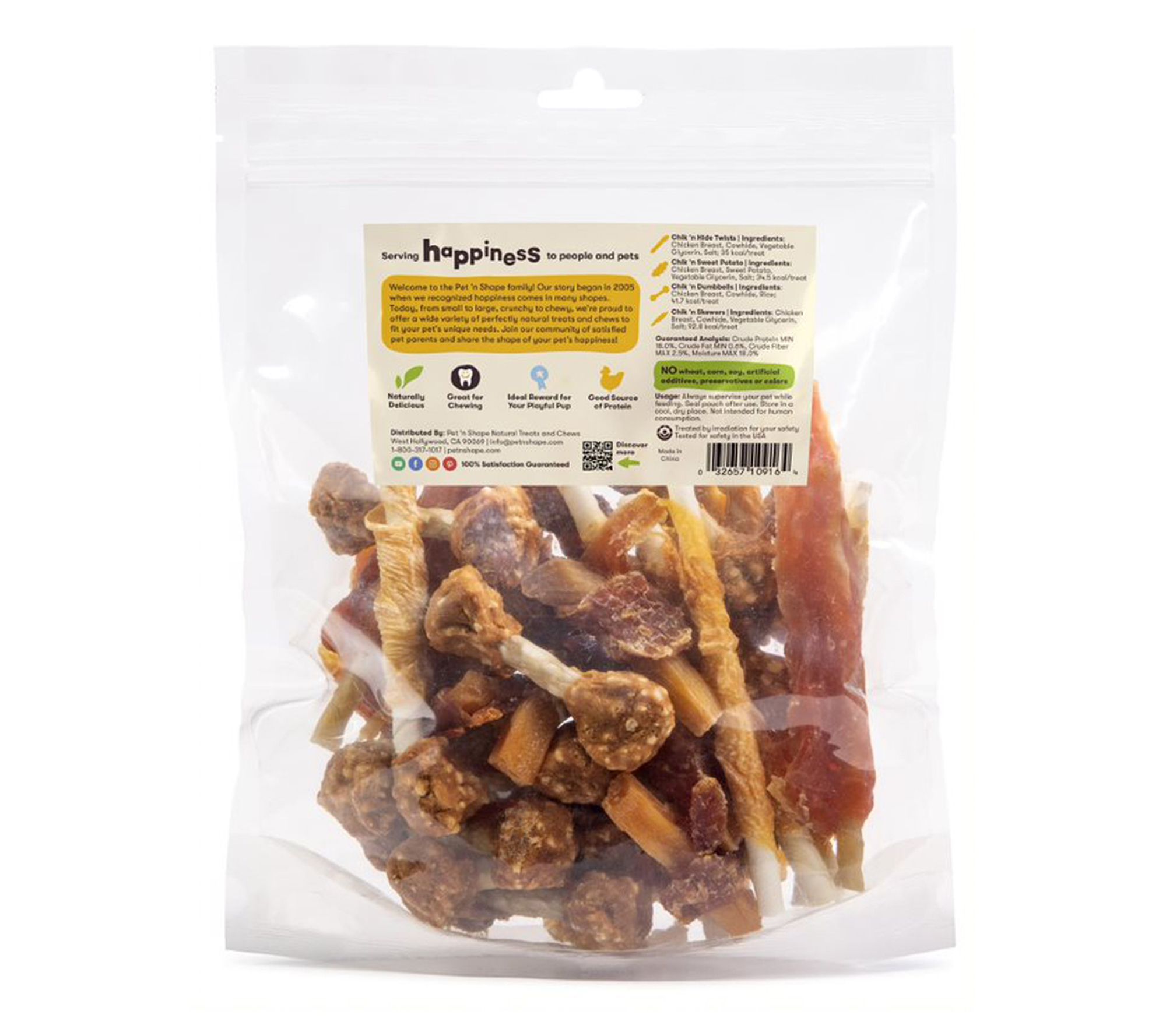 Two paws up! This Chik 'n Mix variety pack is filled with popular treats your dog will love, like Chik 'n Skewers, Chik 'n Sweet Potato, Chik 'n Dumbbells, and Chik 'n Hide Twists. Find out which one is your pup's favorite! From Pet 'n Shape.