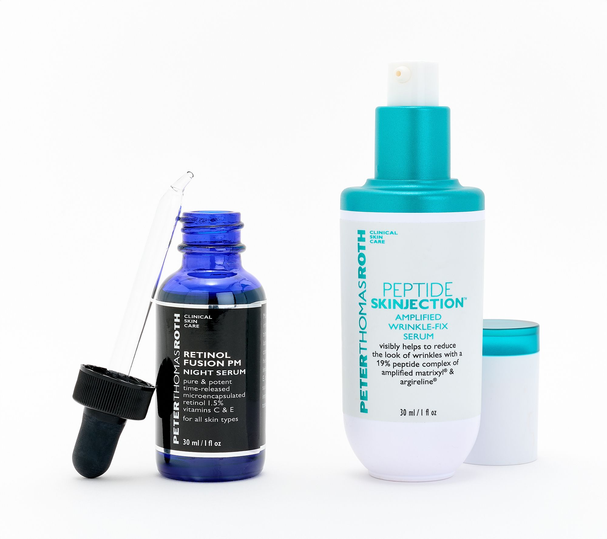 Together at last! Refresh your skin-care routine with the day and night serum set from Peter Thomas Roth. Peptide Skinjection Serum helps improve the look of fine lines and wrinkles. It contains contains a 19% peptide and argirelox complex. Retinol Fusion PM Serum contains technology that microencapsulates the retinol, allowing it to be time-released and gradually deliver retinol overnight. The serum helps improve the appearance of fine lines, wrinkles, and skin texture. Formulated with vitamins C and E, this moisturizing formula suits all skin types. Skin is left looking refreshed.