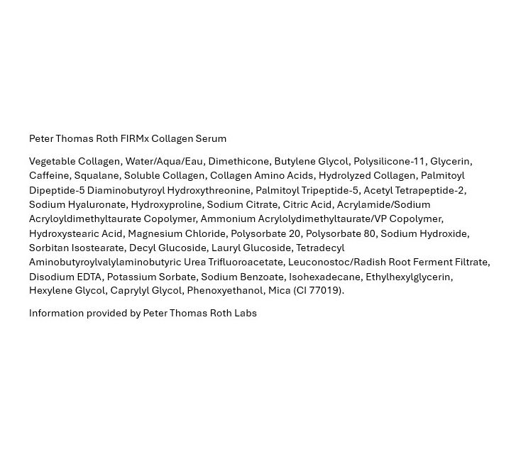 Peter Thomas Roth FIRMx Collagen Serum is formulated with collagen and contains vegetable collagen, hydrolyzed collagen, hydroxyproline, peptides, and collagen amino acids. Also containing uplevity tetrapeptide, hyaluronic acid complex, and squalane, the serum helps to leave skin looking hydrated and supple.