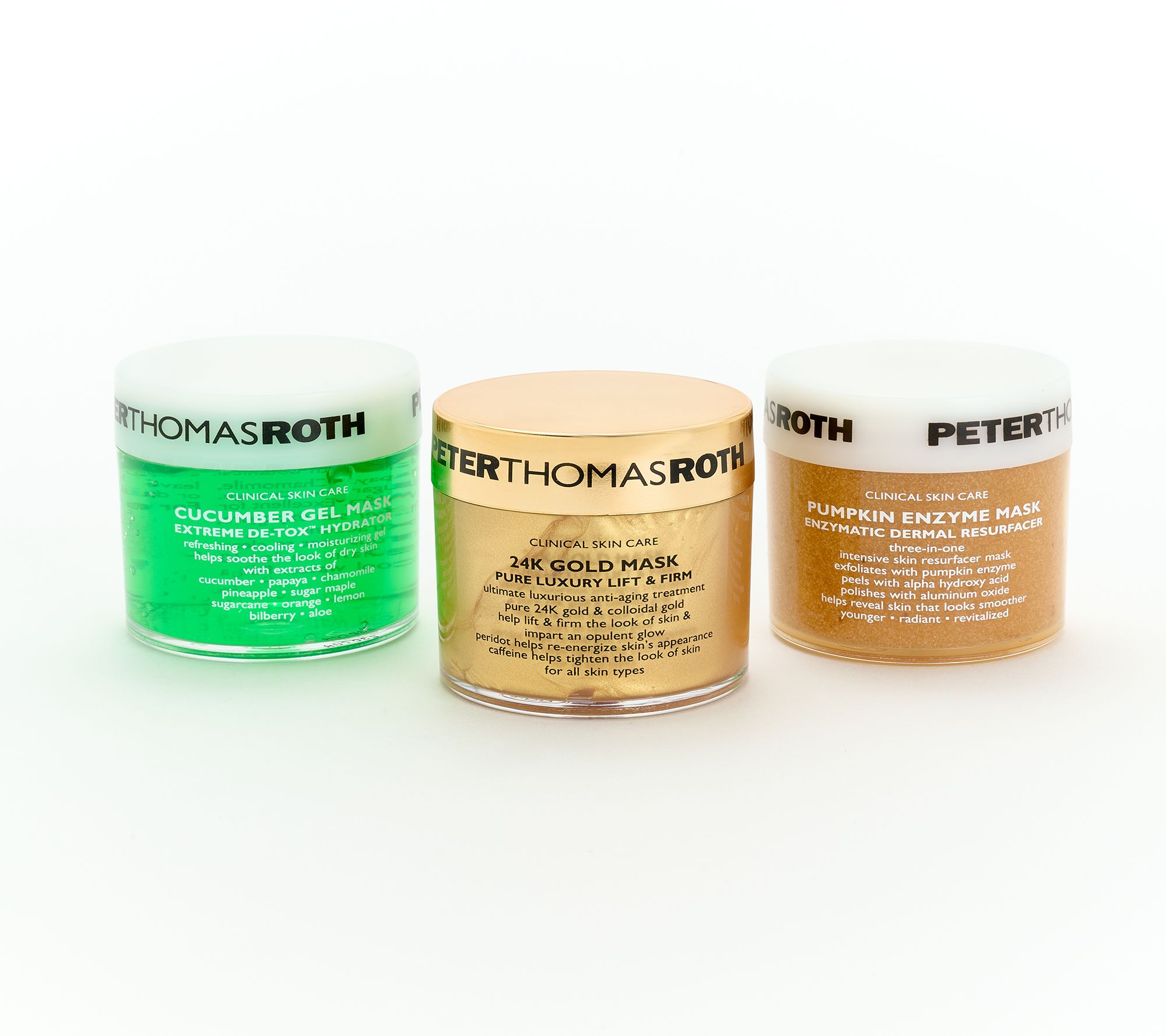 Complete your masking mission of brighter, smoother-looking skin with this three-piece kit of Peter Thomas Roth masks. 24K Gold Mask delivers hydration while imparting an opulent glow. Pumpkin Enzyme Mask exfoliates, peels, and polishes to address the look of dullness and signs of aging. Cucumber Gel Mask Extreme De-Tox- Hydrator is a hydrating and calming mask recommended for daily use. From Peter Thomas Roth.