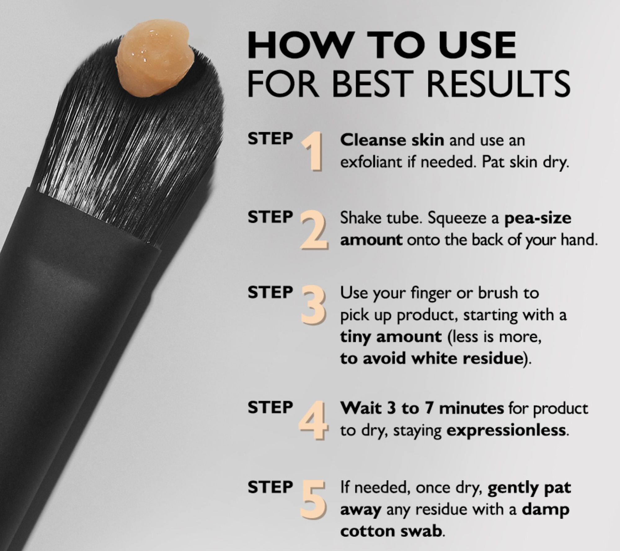 How do I use it: Cleanse thoroughly. (Excess oil or other product residue may lessen tightening effect.) If needed, try gently exfoliating as product may cling to flaky skin and cause white residue. Pat skin dry. Do not use eye cream or moisturizer, as this will reduce tightening effect. Shake tube. To control application, squeeze a pea-sized amount on the back of your hand first. Using your fingertip or dry makeup brush, take product from back of hand as needed, starting with a tiny amount (less is more, to avoid white residue). Spread onto any of the following areas: underneath the eye to reduce puffiness; around the eye to smooth crow's feet; above and below the brow bone (avoid eyelid). If more product is needed, apply quickly while first layer is still wet. Layering onto dry product may result in white residue. Stay expressionless for three to seven minutes so product can properly set and dry. If needed, once dry, pat away any residue with a damp cotton swab.