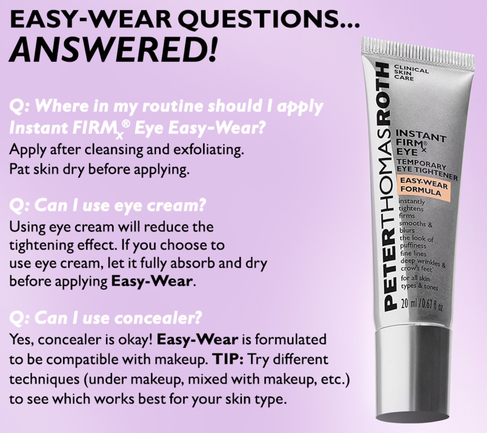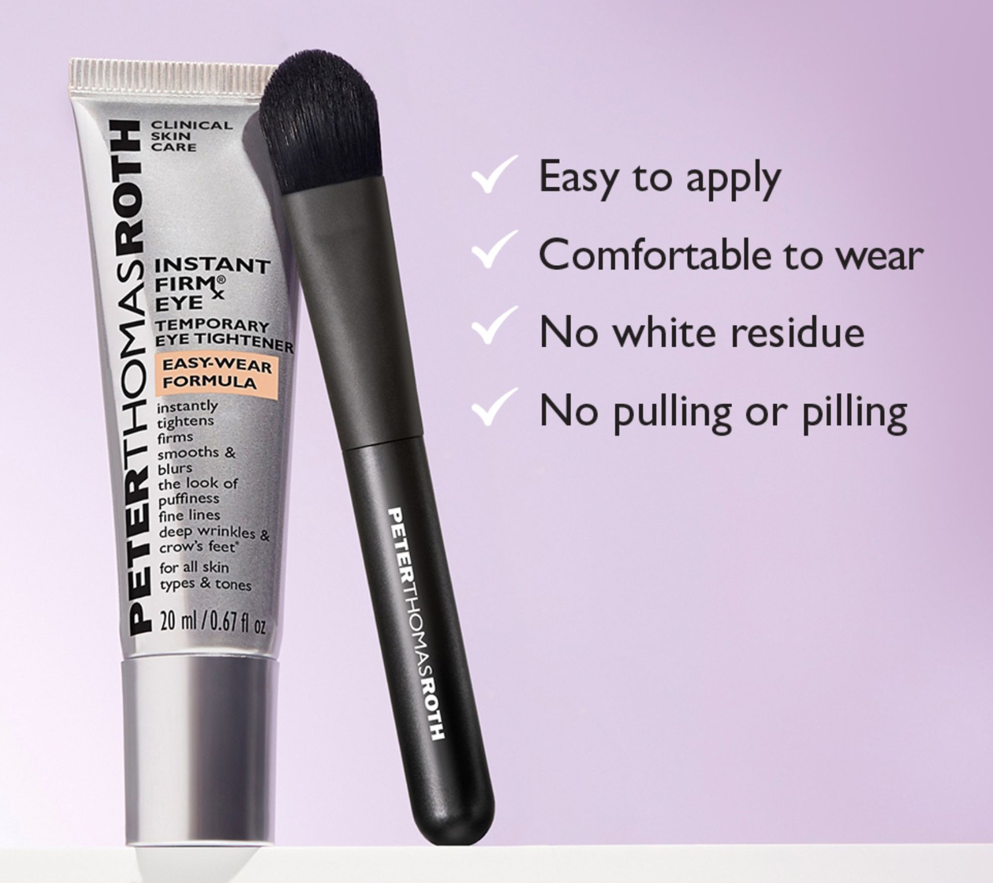 Everything you loved about the original Peter Thomas Roth Instant FIRMx Eye -- and less: less tricky over skincare and under makeup. This sheer, skin-tightening veil is like shapewear for your face, and in an expert grader test was proven to immediately reduce the look of under-eye puffiness, fine lines, deep wrinkles, and crow's feet for a temporary effect. Easy to apply and simple to wear, this formula blends onto all skin types and tones. Eye area is left appearing temporarily and instantly tighter, firmer, and smoother with Firm-A-Tite, a blend of skin-tightening silicates.