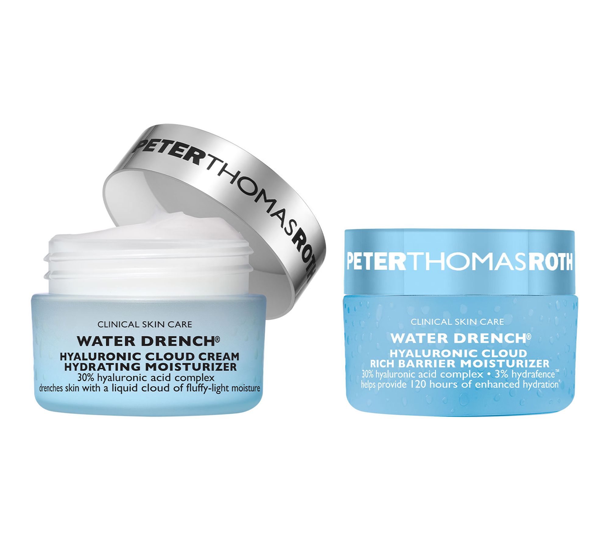 Help provide skin with moisture while traveling and on the go! This special-edition Peter Thomas Roth two-piece kit includes mini-size Water Drench moisturizers for day and night. Use the original Cloud Cream as your day cream for fluffy-light moisture that leaves skin appearing silky, hydrated, and more youthful-looking. Use the Rich Barrier Moisturizer as your night cream for richer moisture.