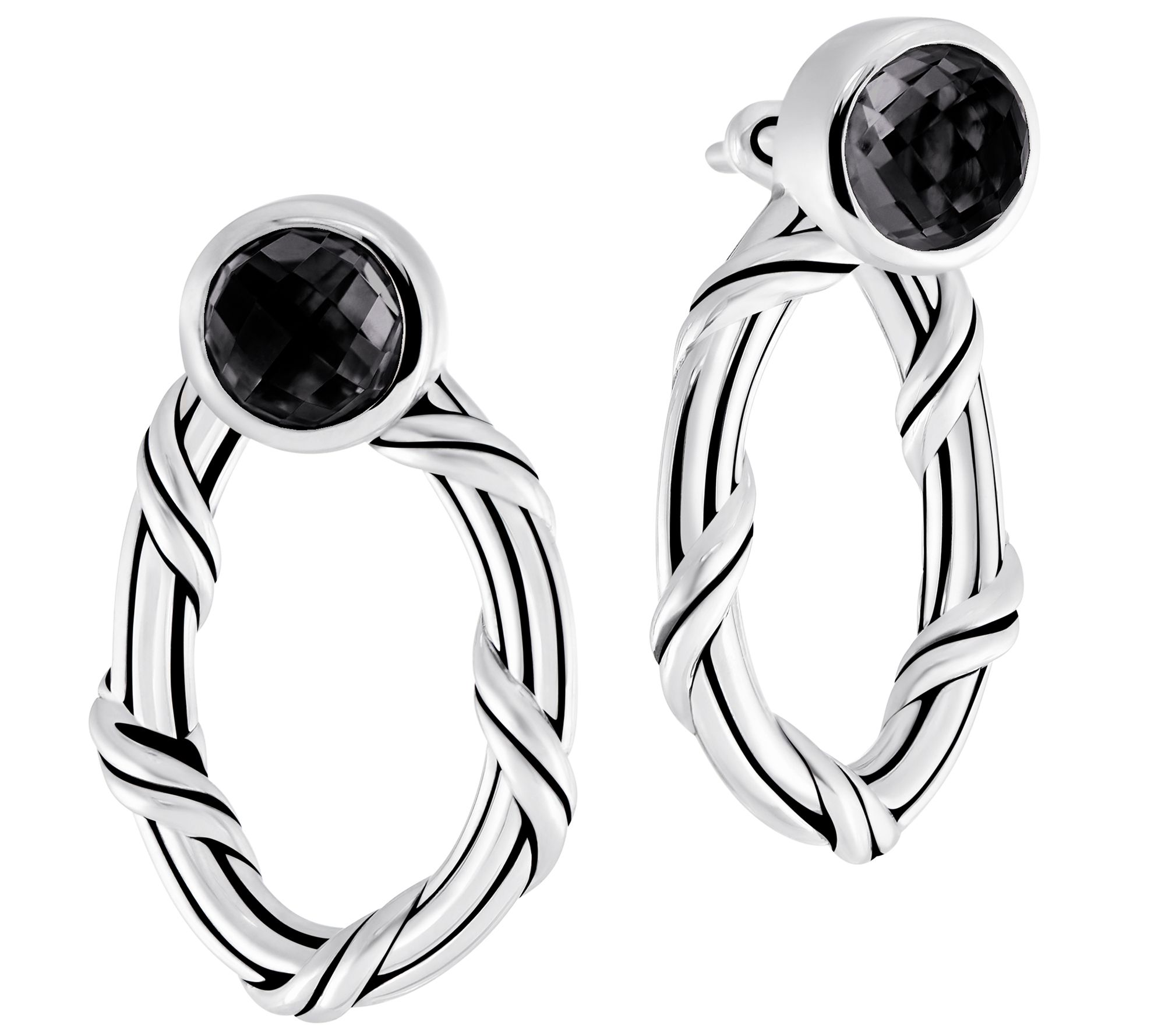 • Ribbon-and-reed hoops with round, faceted, bezel-set onyx; slightly oxidized