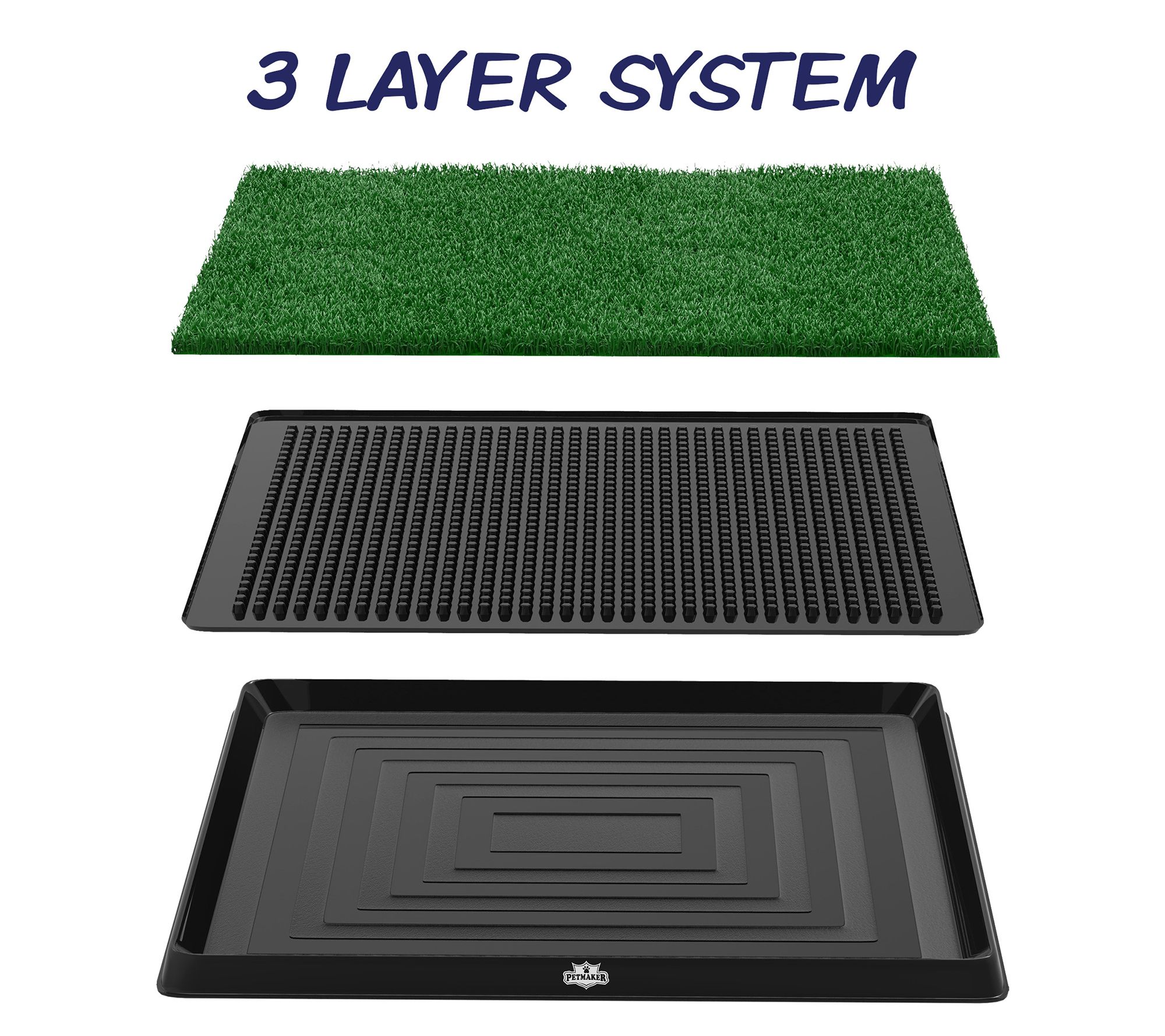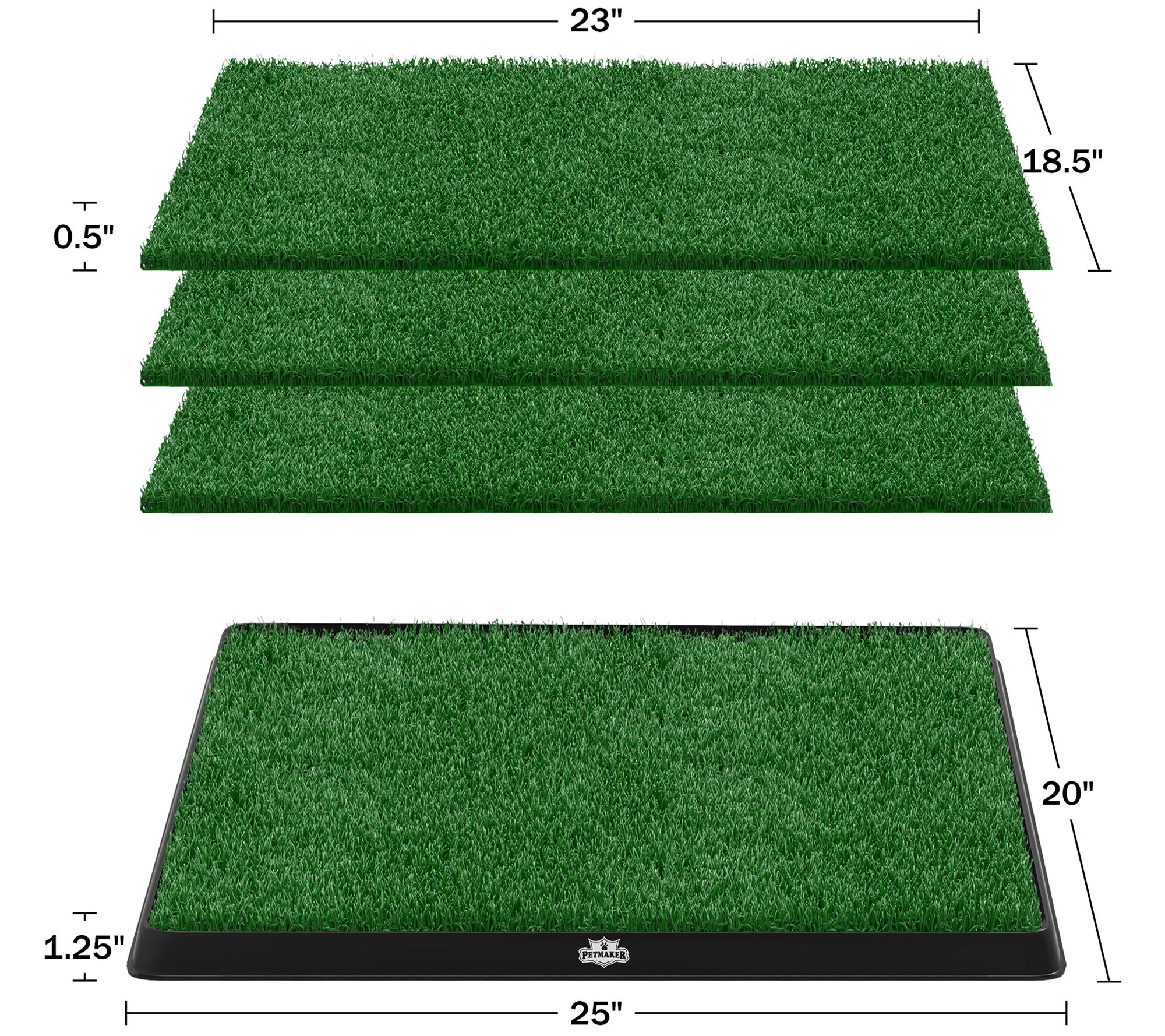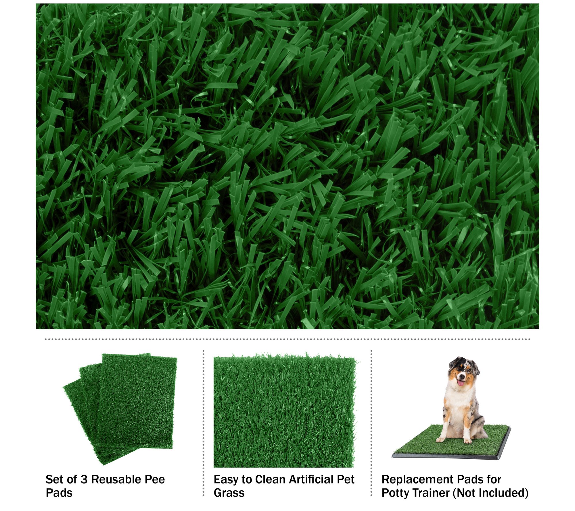 House training your pet is a breeze when you have this three-pack of reusable artificial grass pads with tray. Designed with a three-layer system, these pads feature a plastic drainage insert that directs liquid into the durable collection tray, ensuring a cleaner home. From Petmaker.