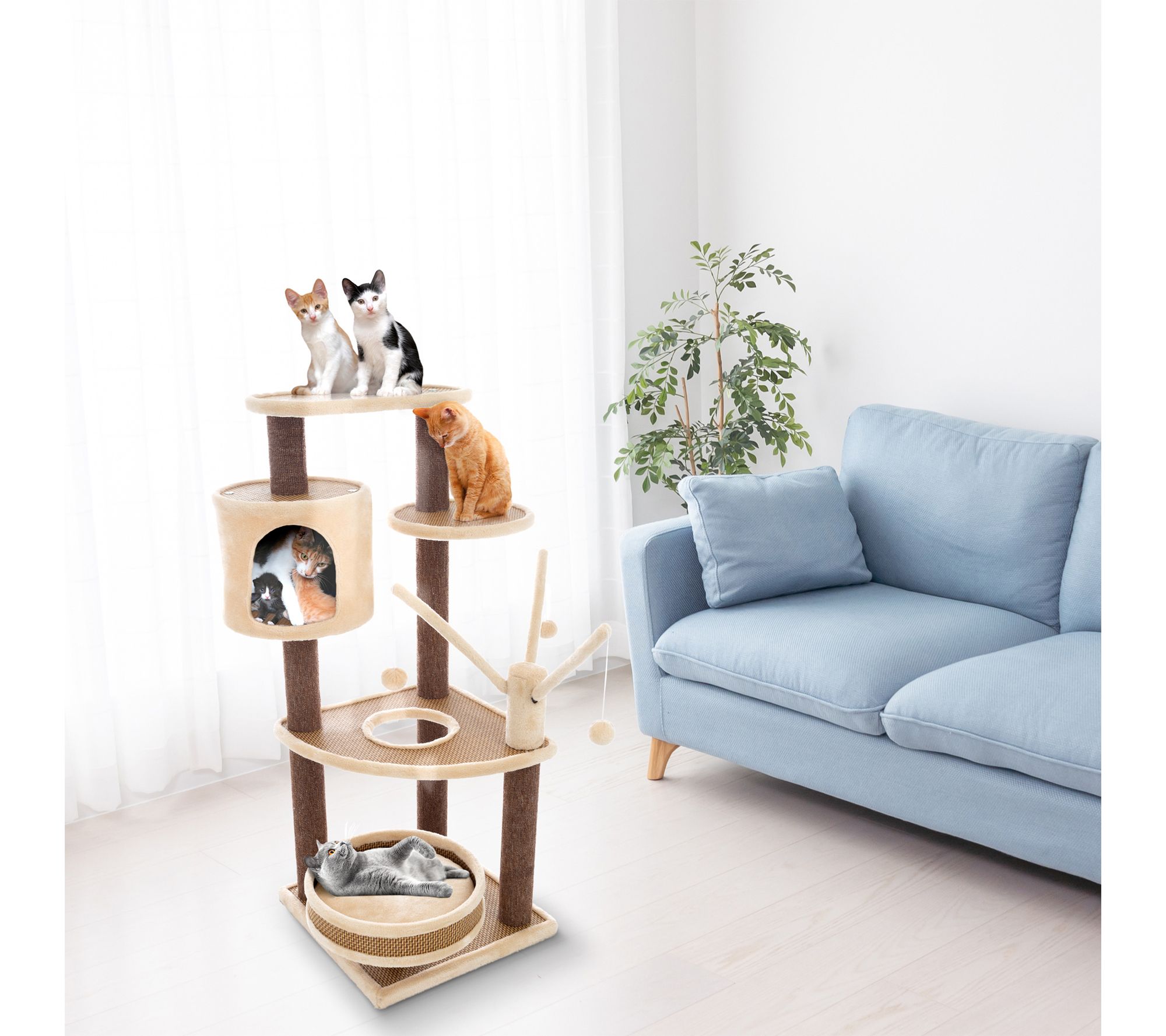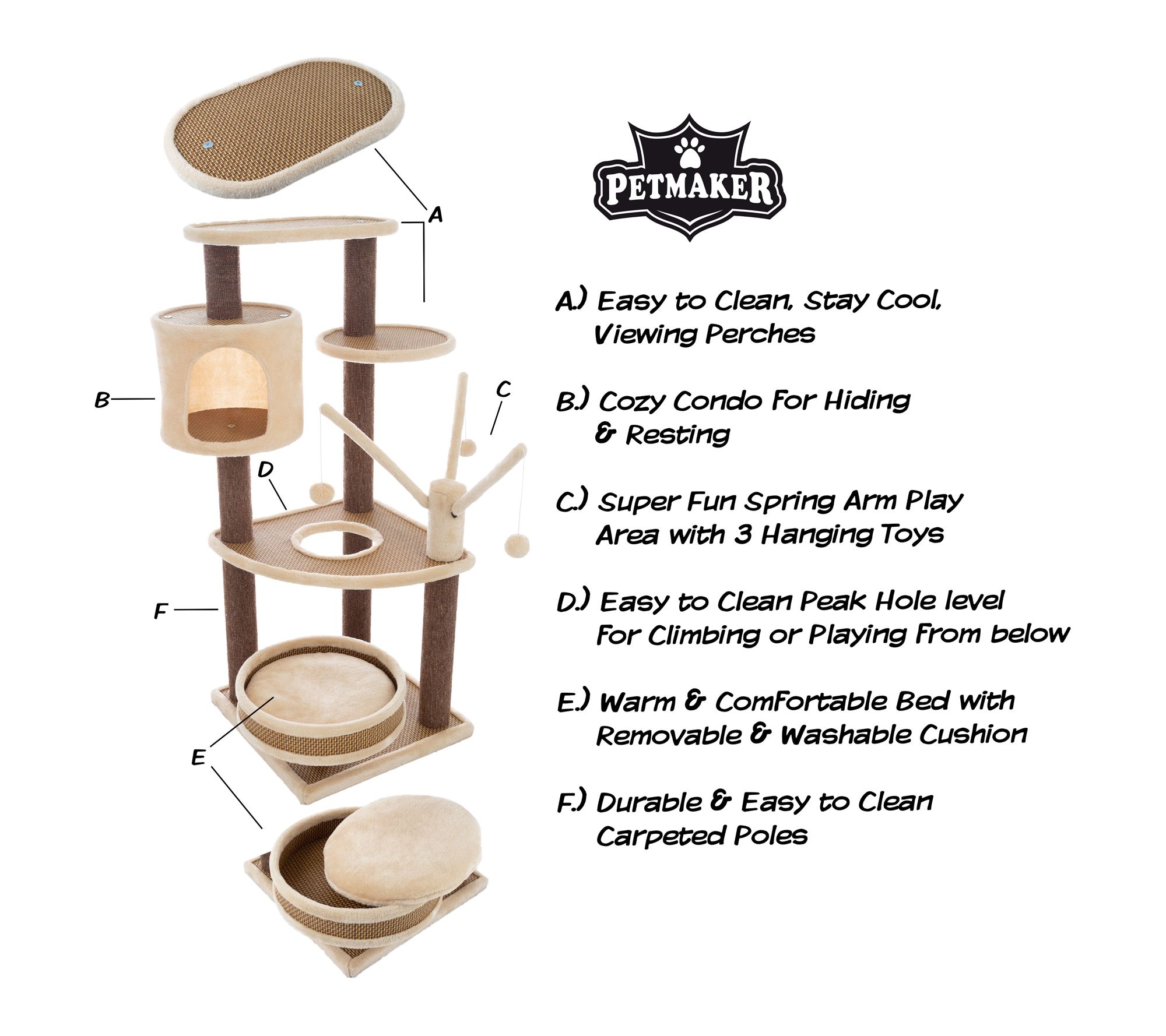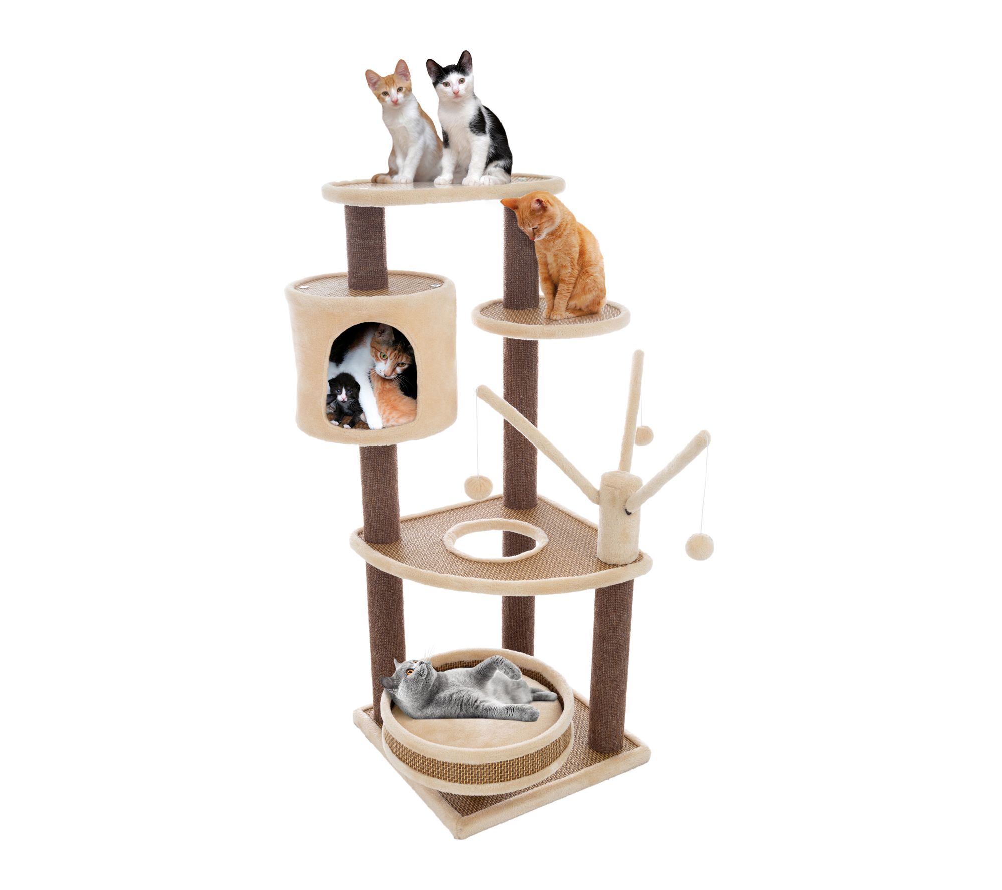 • Includes Cat Tower, Cushioned Pet Bed, Napping Perches, Kitty Condo Hut, Spring Arms with 3 Hanging Toys, Assembly Hardware