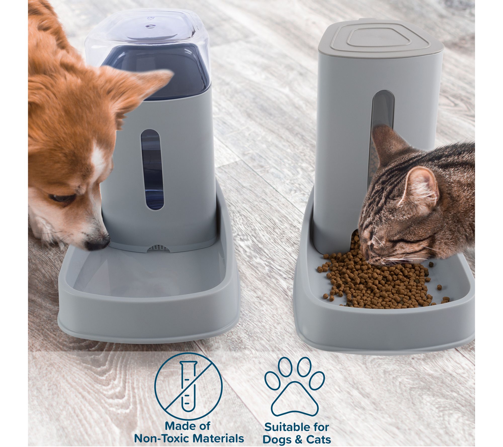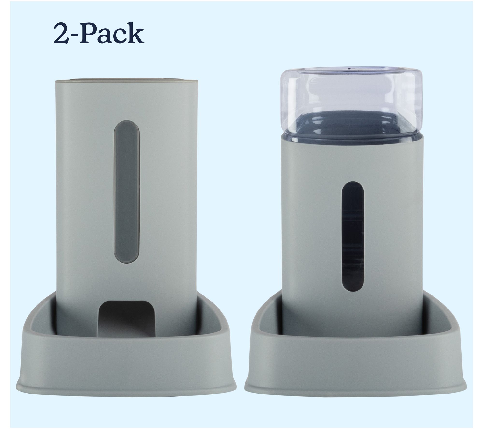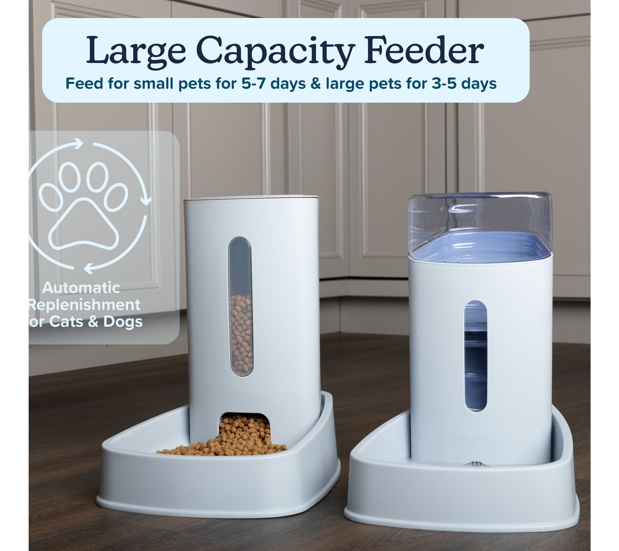 Keep your cats, dogs, or even ferrets fed and happily hydrated with this convenient set of two automatic pet feeders. The gravity-fed bowls provide a steady supply of food and water, so you can enjoy peace of mind when you're away or busy. Each feeder's generous capacity makes it easy to leave your pets cared for. From PETMAKER.