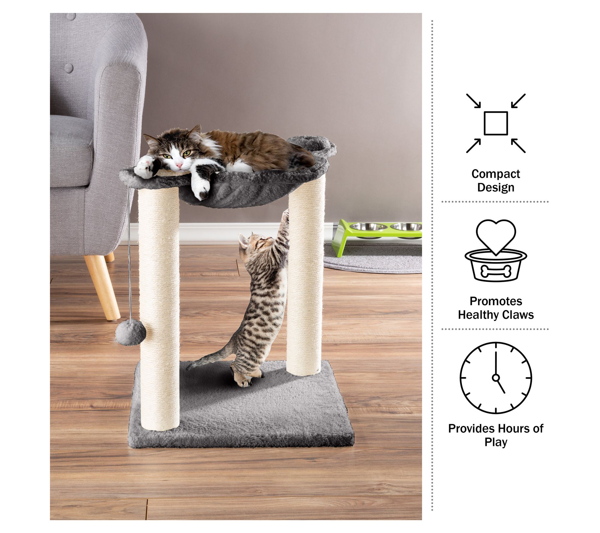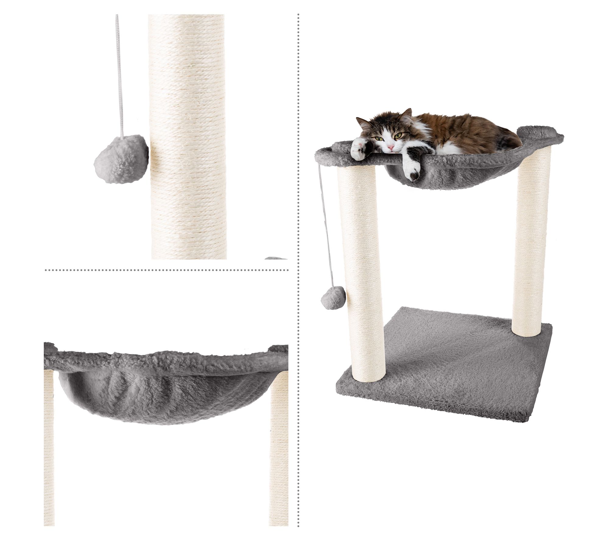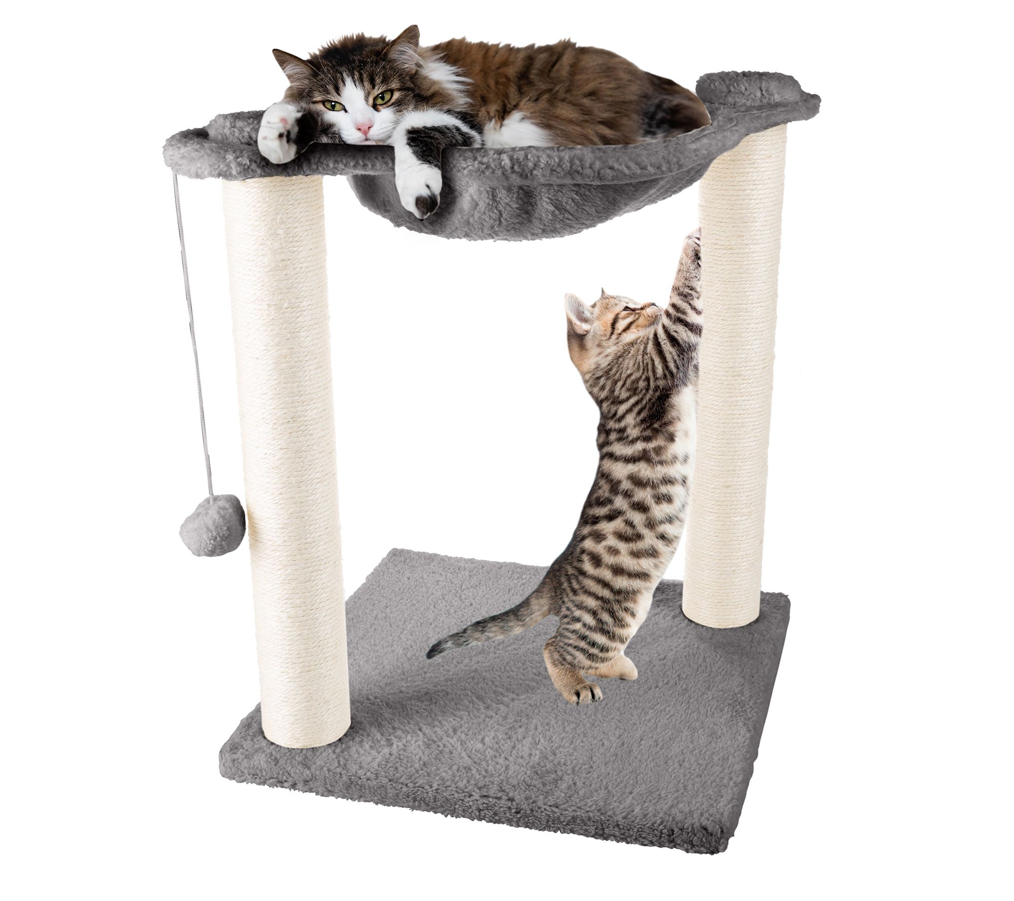 Give your feline friend the ultimate play and relaxation spot with the Petmaker cat hammock with scratching posts. This compact cat tree features sisal rope scratching posts, a hanging toy, and a cozy polyester bed, perfect for both large adult cats and kittens. From Petmaker.