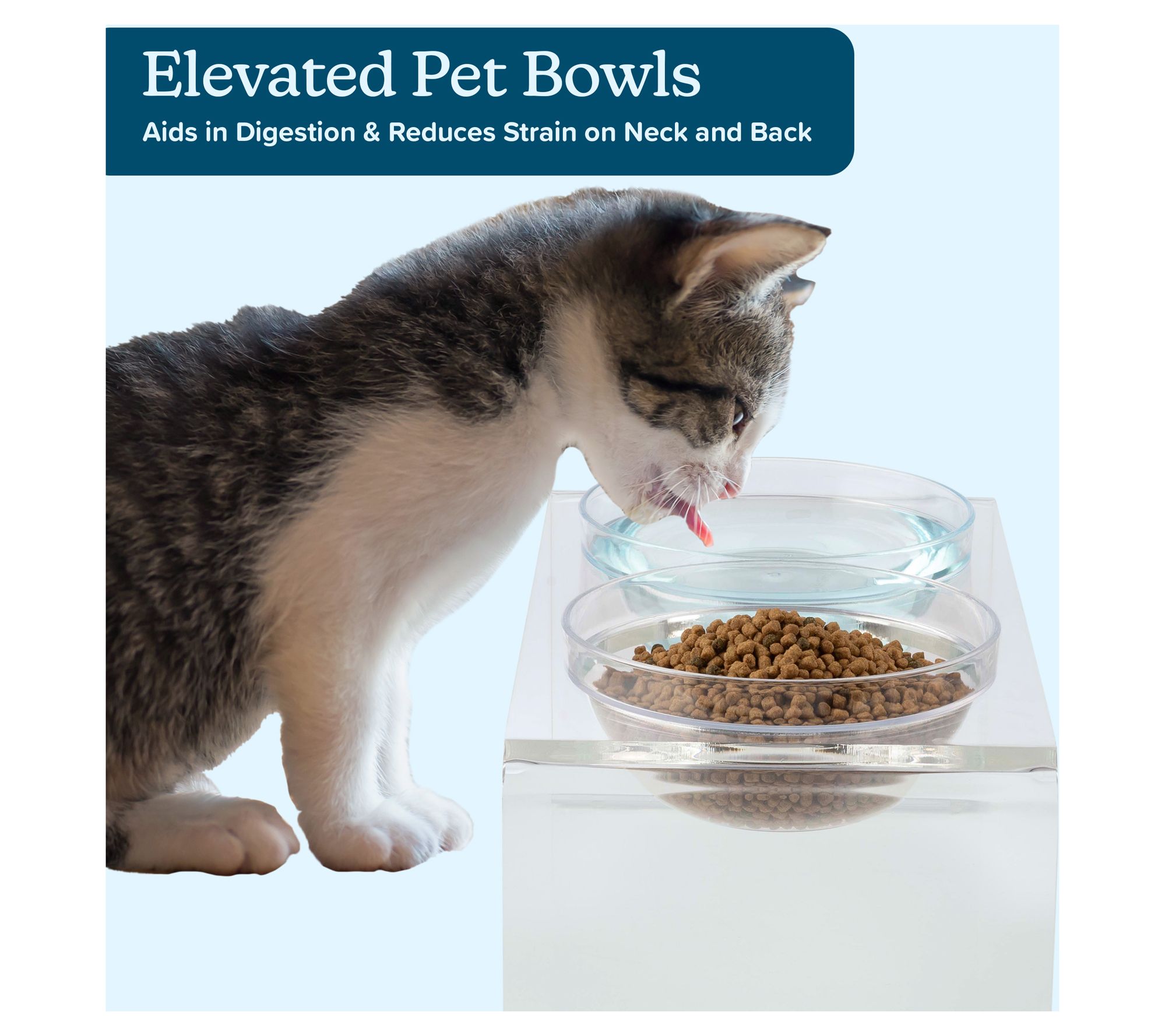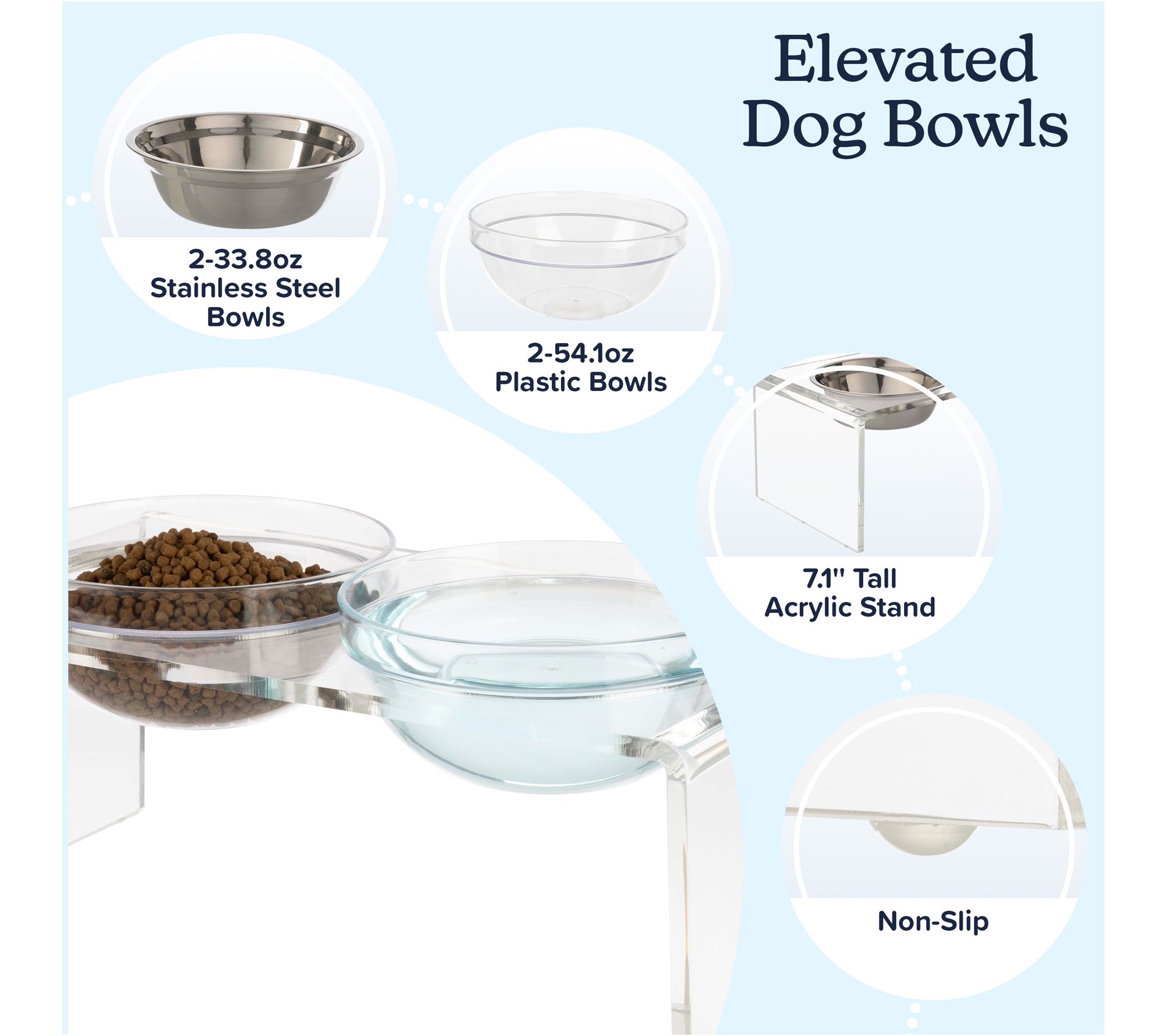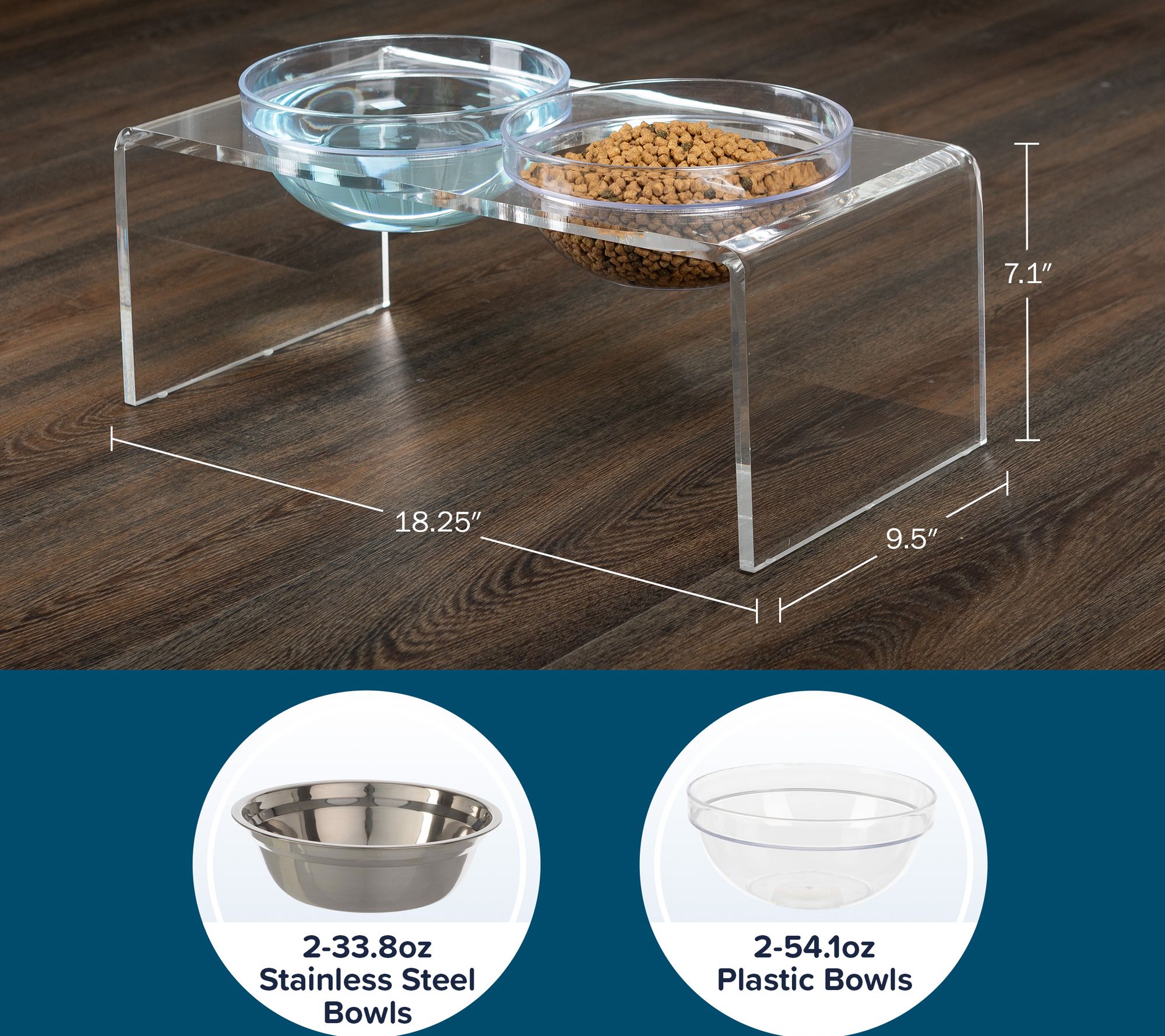 Mealtime gets an upgrade with this elevated pet bowl stand, designed to help your cat or dog enjoy greater comfort and better posture while eating. It includes two stainless steel and two plastic bowls, so you can serve food and water together or offer wet and dry options side by side. The modern, clear acrylic stand keeps bowls secure and looks stylish in any home. From PETMAKER.