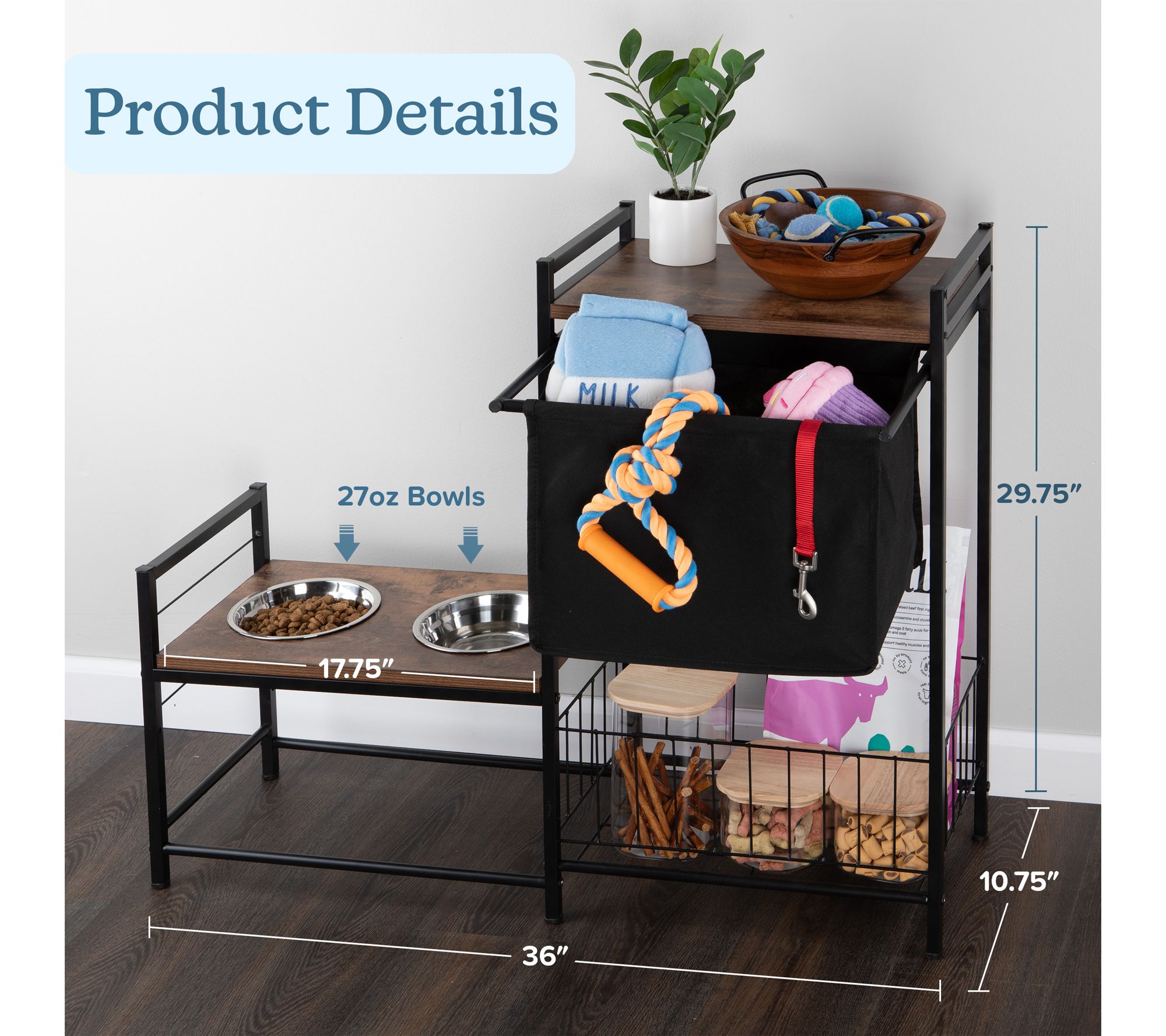 Mealtime feels organized with these bowls and feeder station, offering three adjustable heights to help support your pet's comfort. Store toys and treats right at hand with the built-in shelving, sliding basket, and sturdy wire bin. Cleanup is a breeze, so you and your dog can enjoy more quality time together. From PETMAKER.