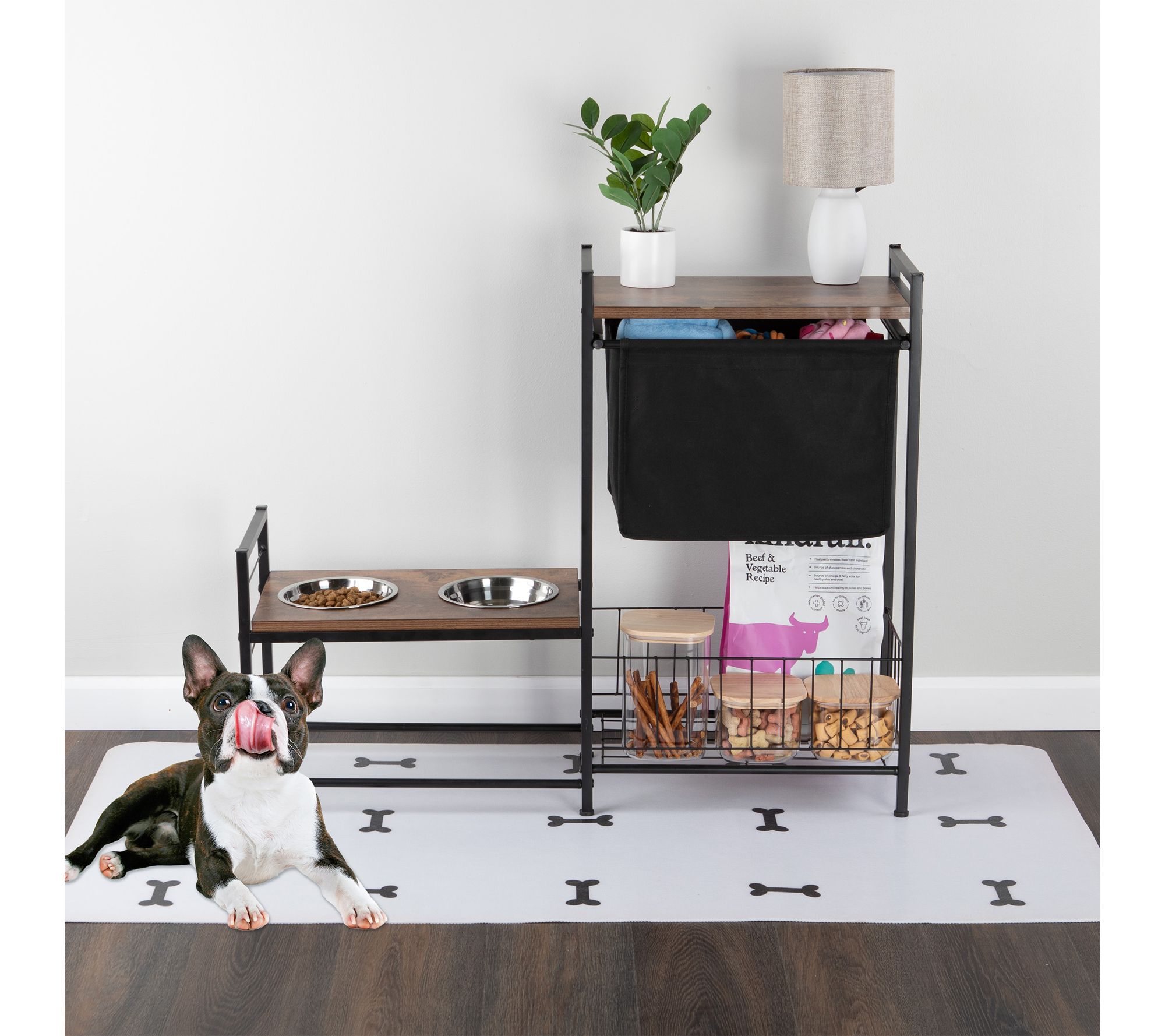 Includes stand, two pet bowls, storage shelf, metal wire basket
