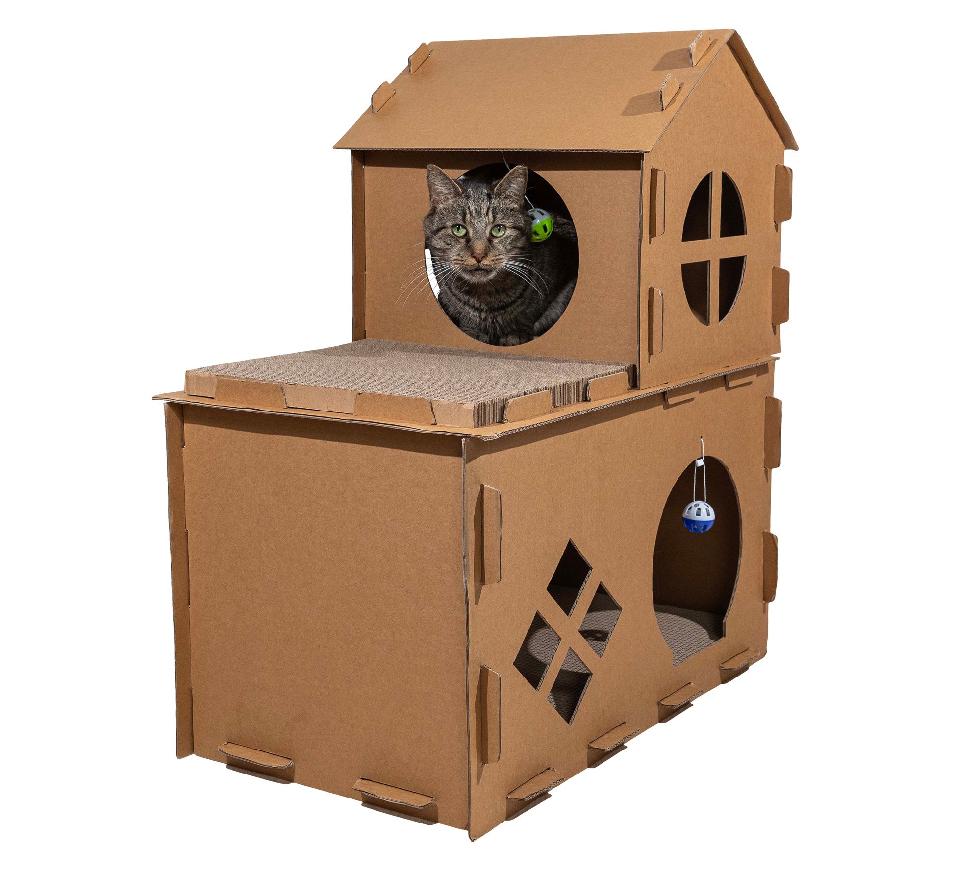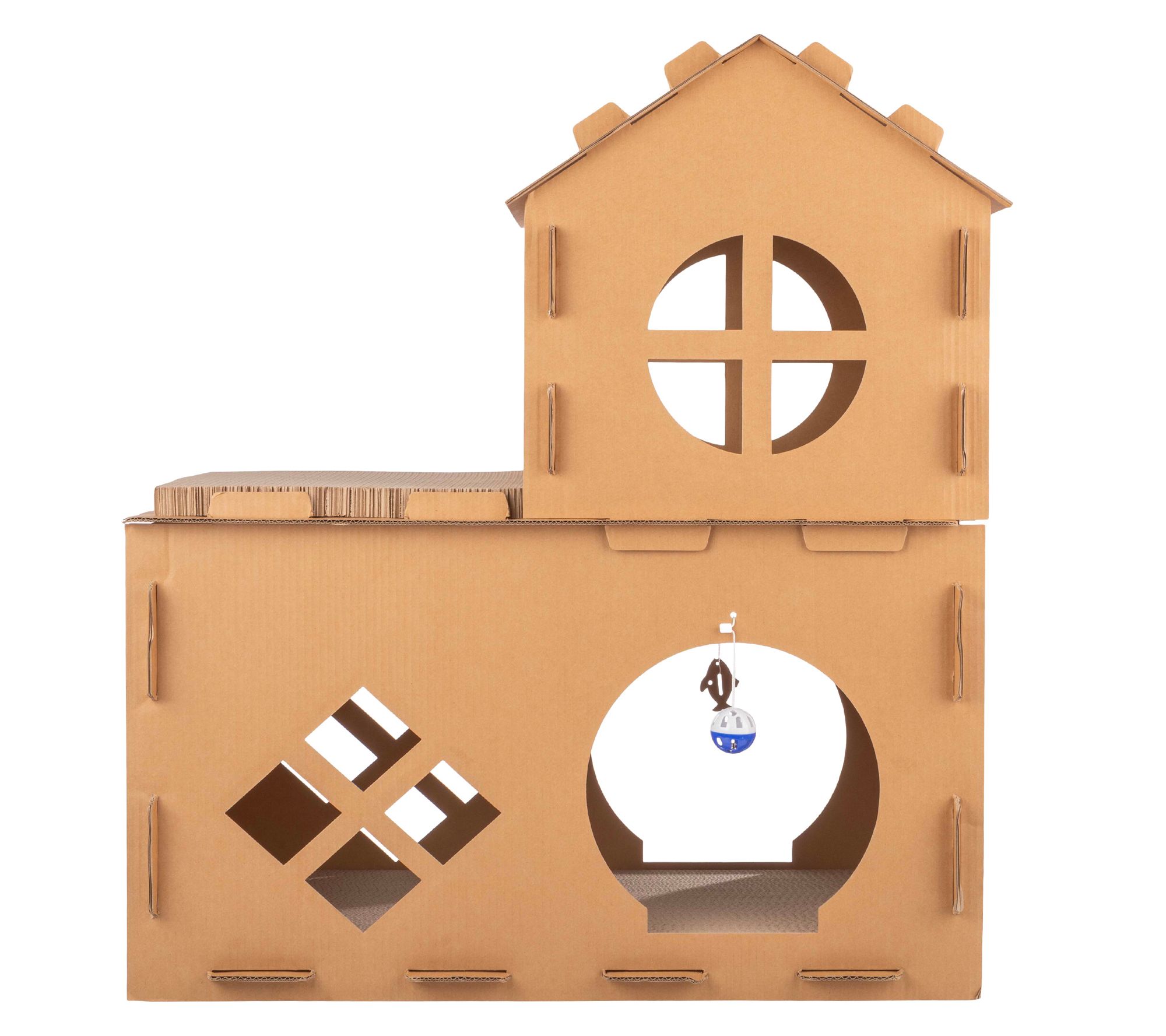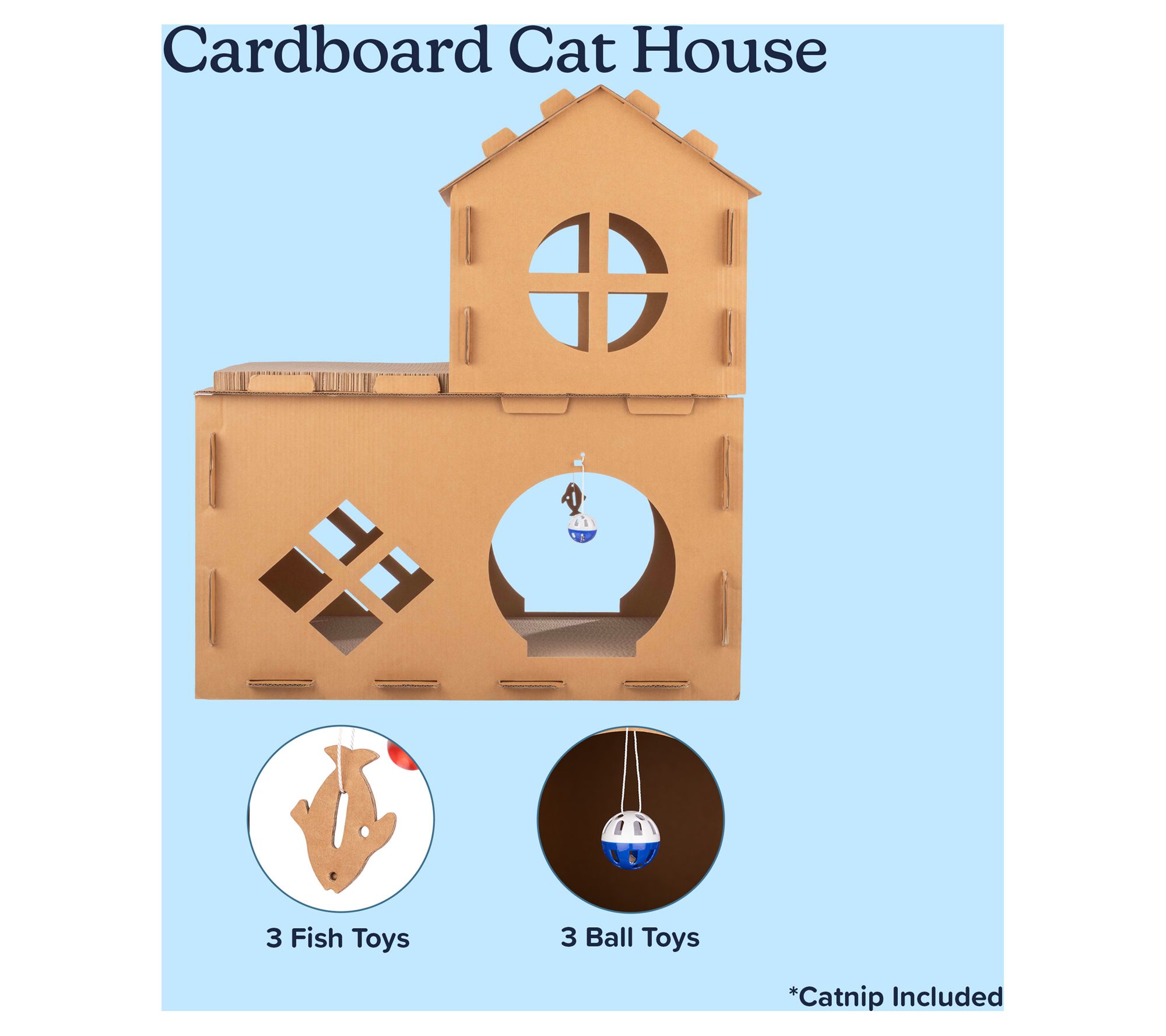 Give your kitty a world of fun and relaxation with this multi-level cardboard cat house, offering a two-story playground complete with scratching pads, ball toys, fish toys, and catnip. Whether climbing, clawing, or lounging, your furry friend will love having their own cozy space to play and unwind. From PETMAKER.