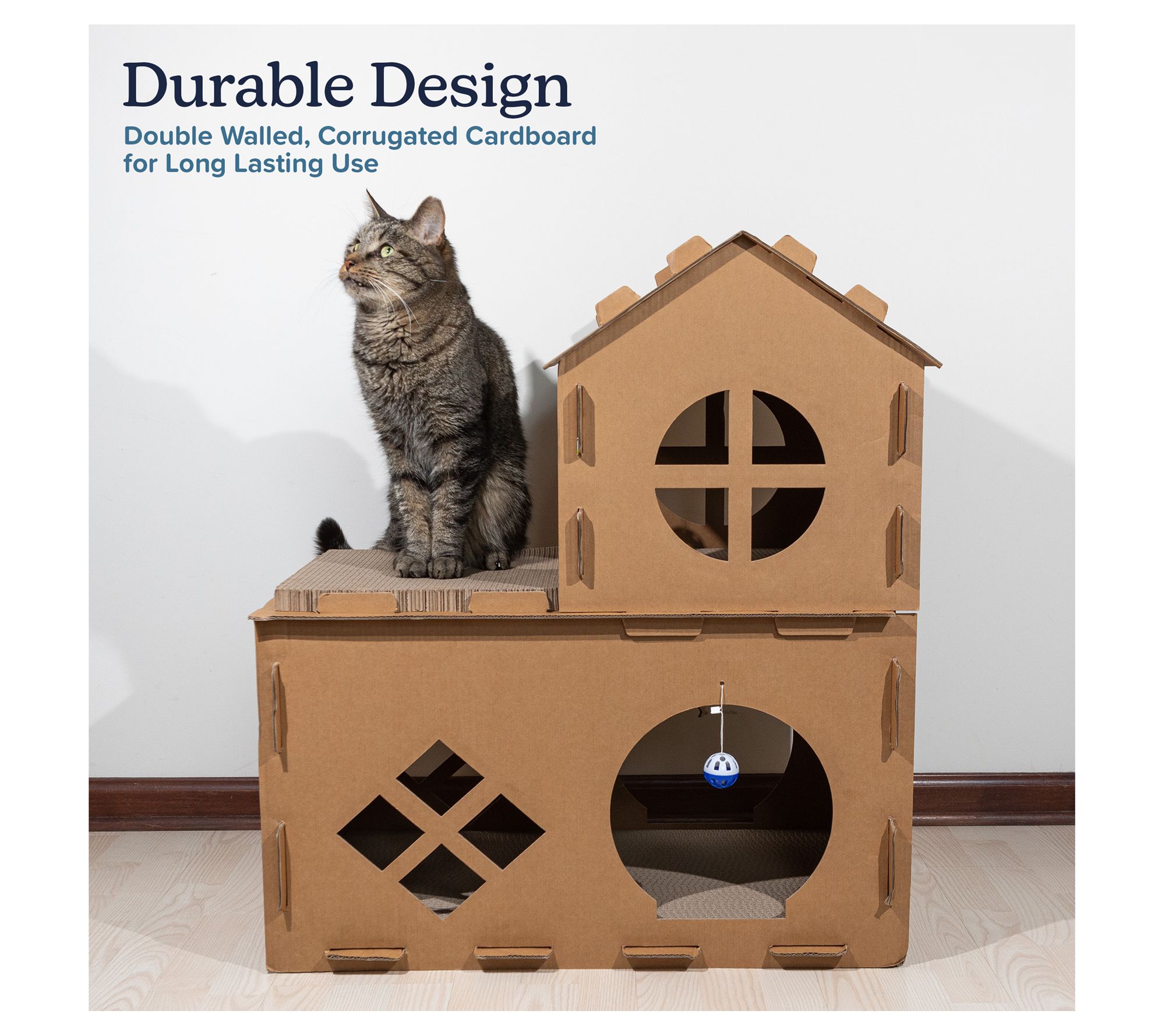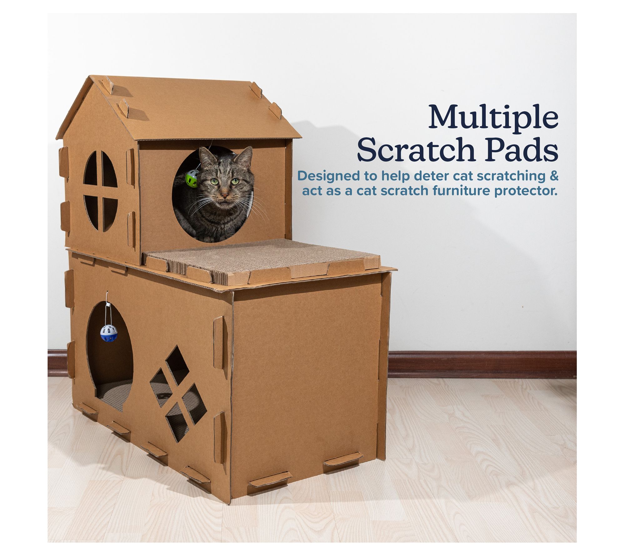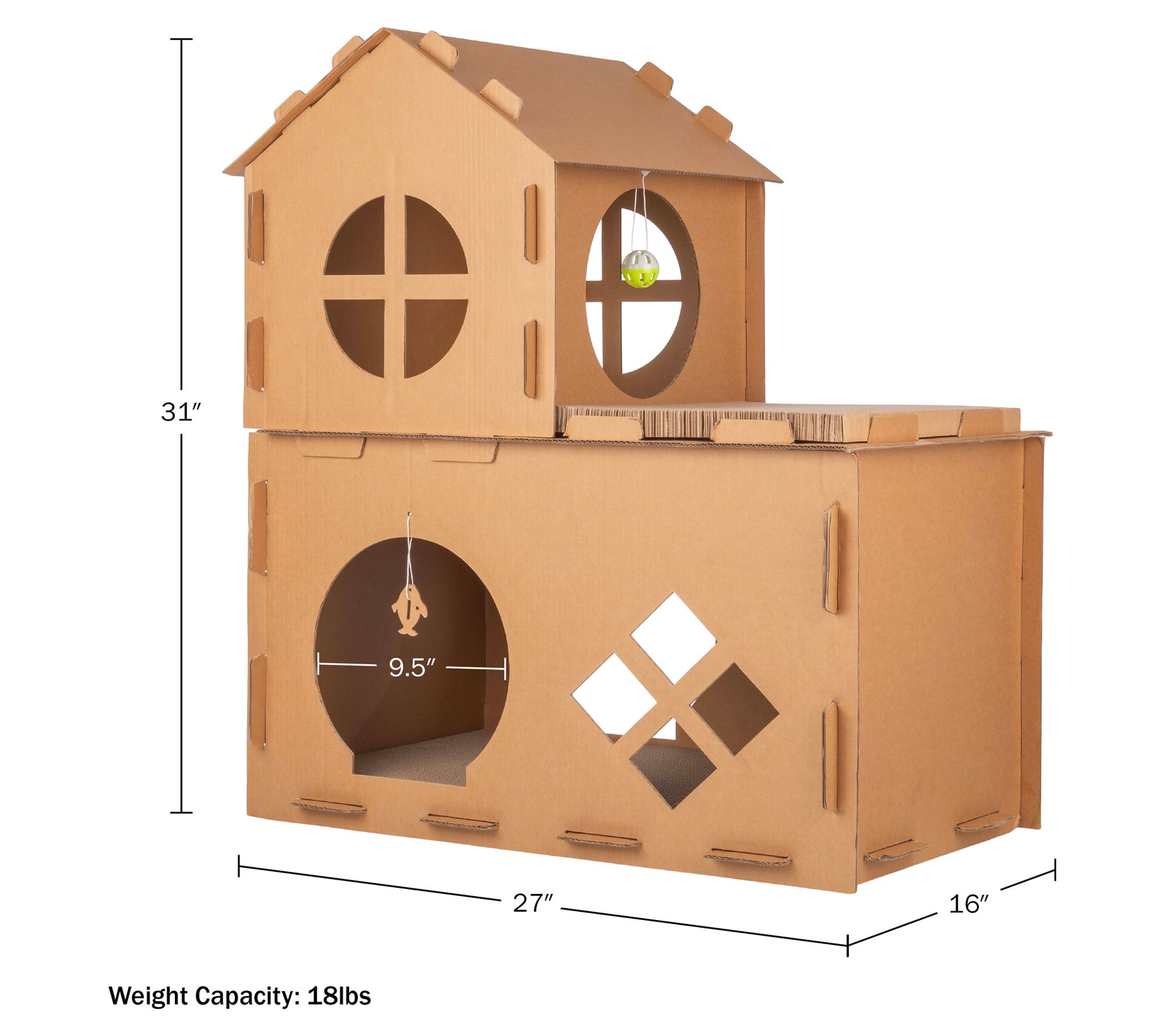 Give your kitty a world of fun and relaxation with this multi-level cardboard cat house, offering a two-story playground complete with scratching pads, ball toys, fish toys, and catnip. Whether climbing, clawing, or lounging, your furry friend will love having their own cozy space to play and unwind. From PETMAKER.