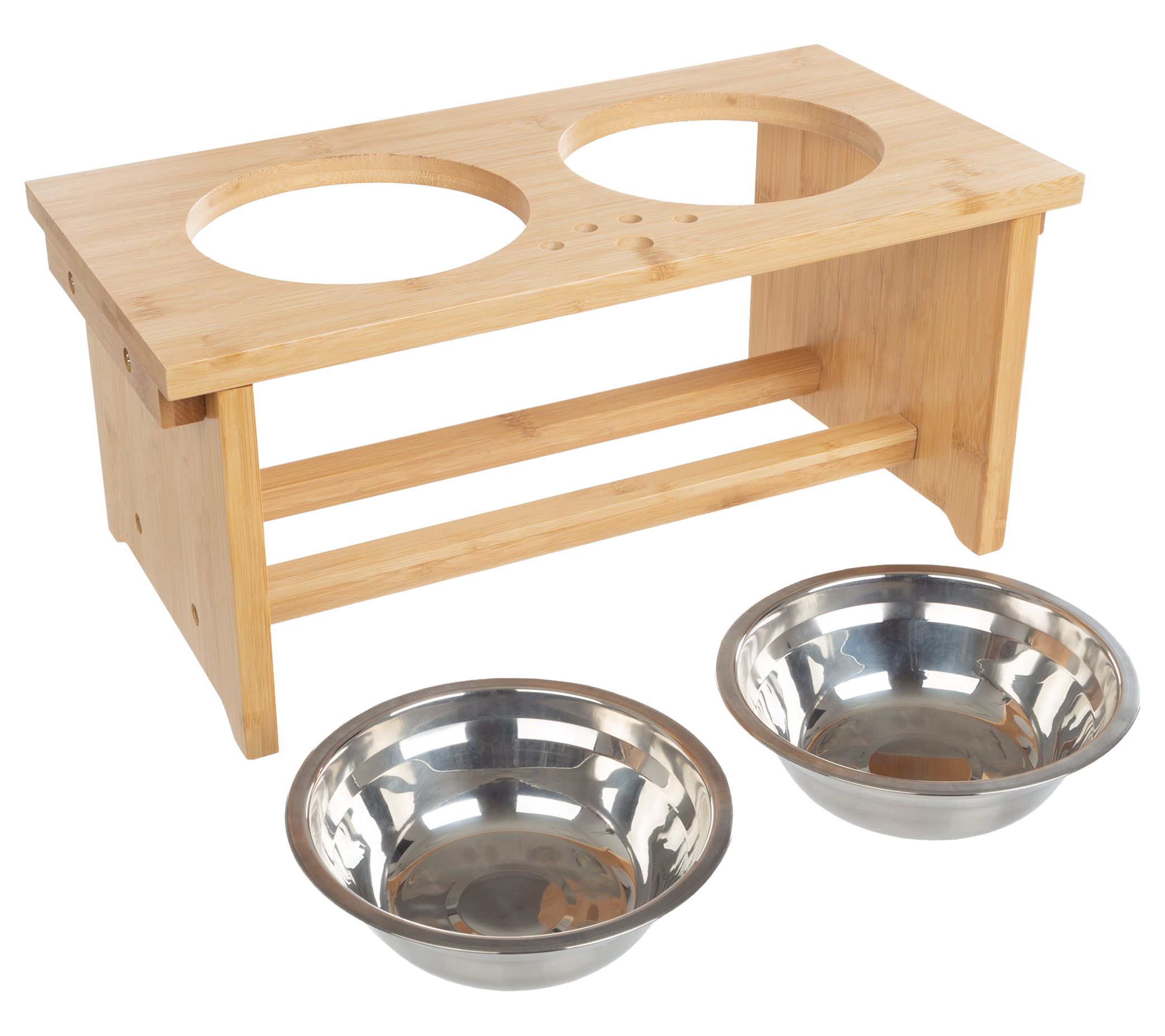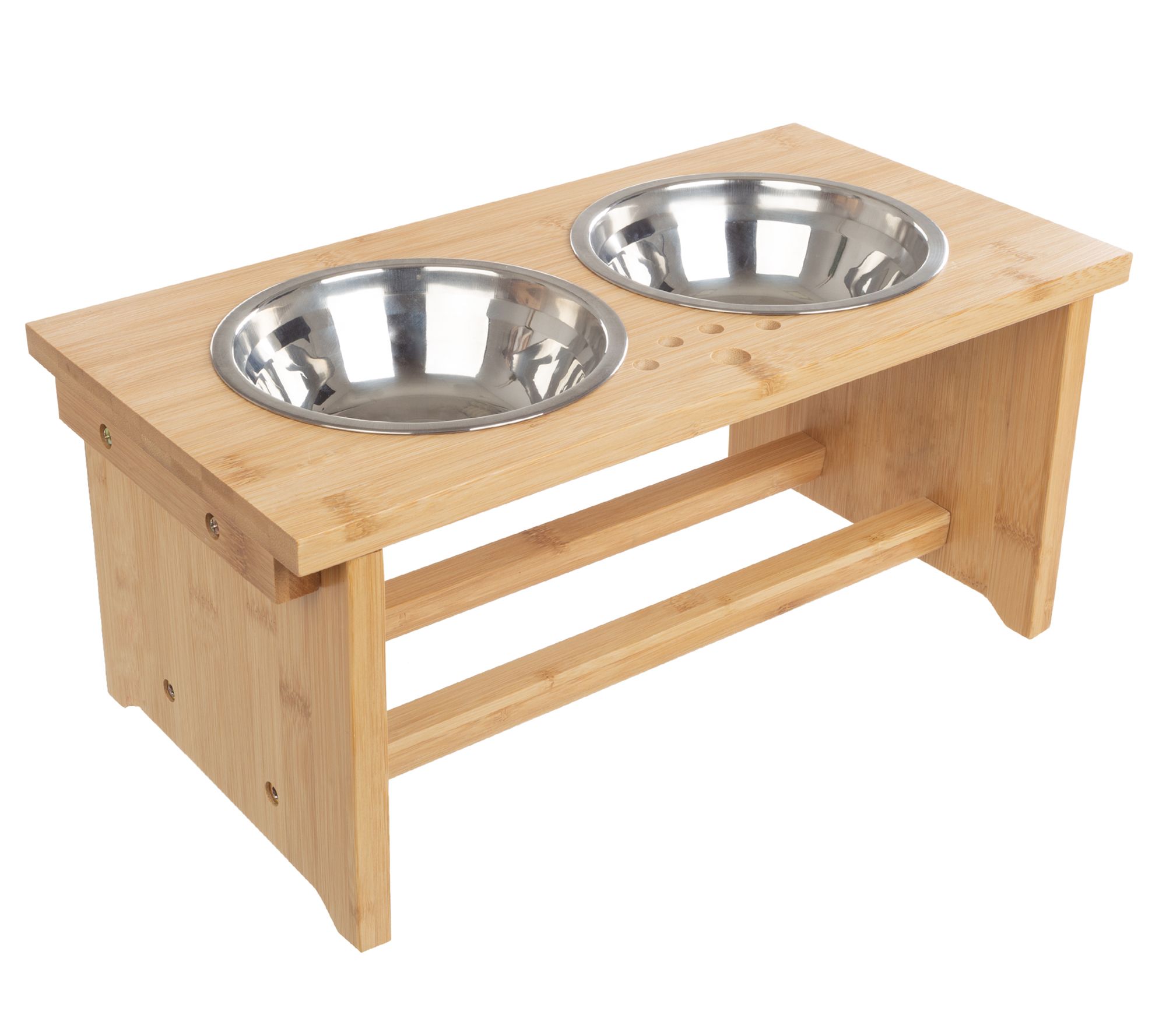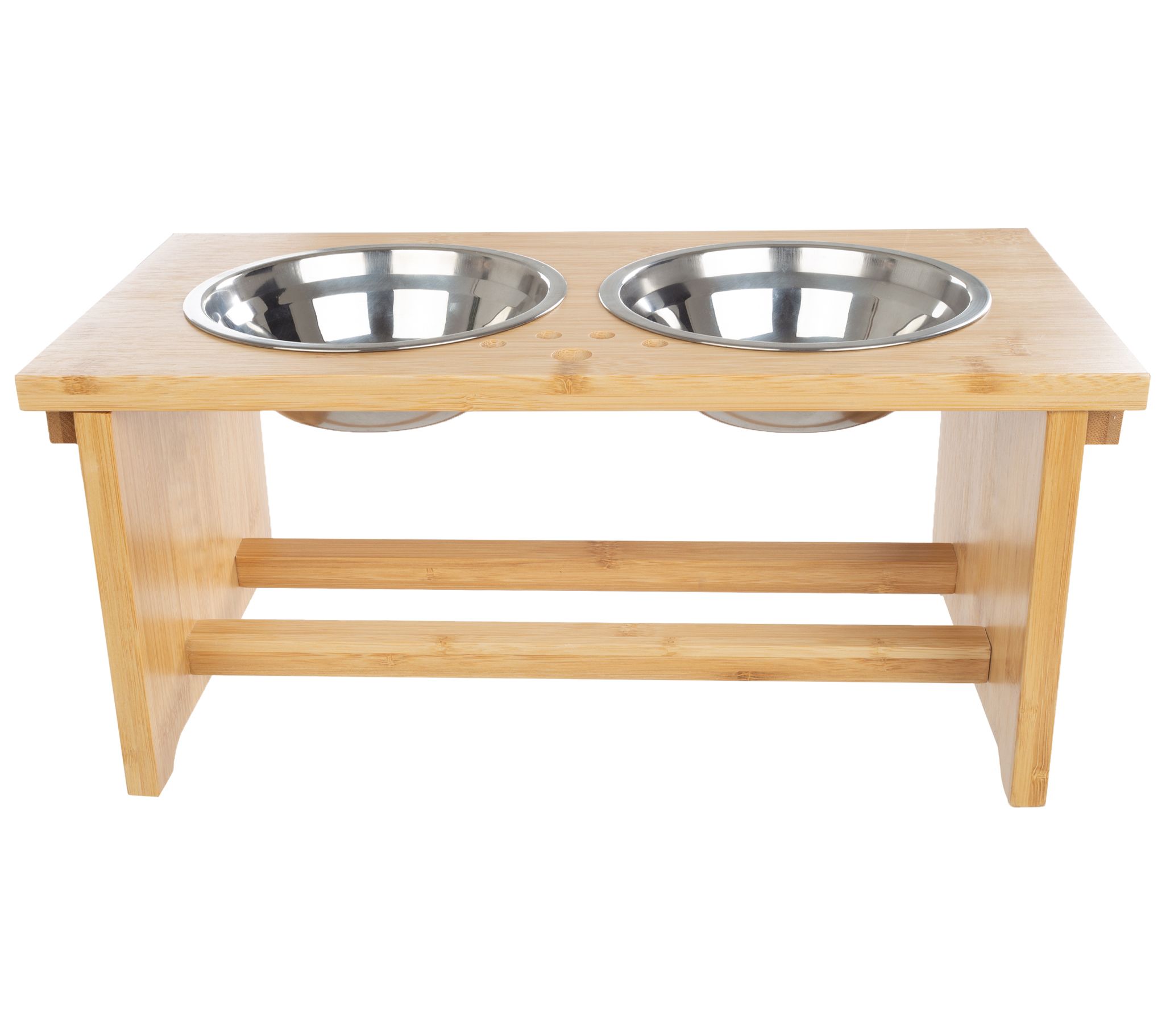 Provide your pet with a comfortable feeding experience with this elevated bowl set. The clever design makes dining more enjoyable, and the durable bamboo stand features grippy feet to reduce spills. From Petmaker.