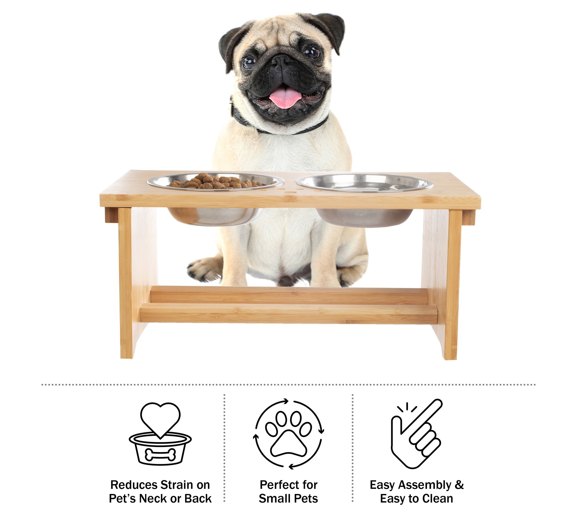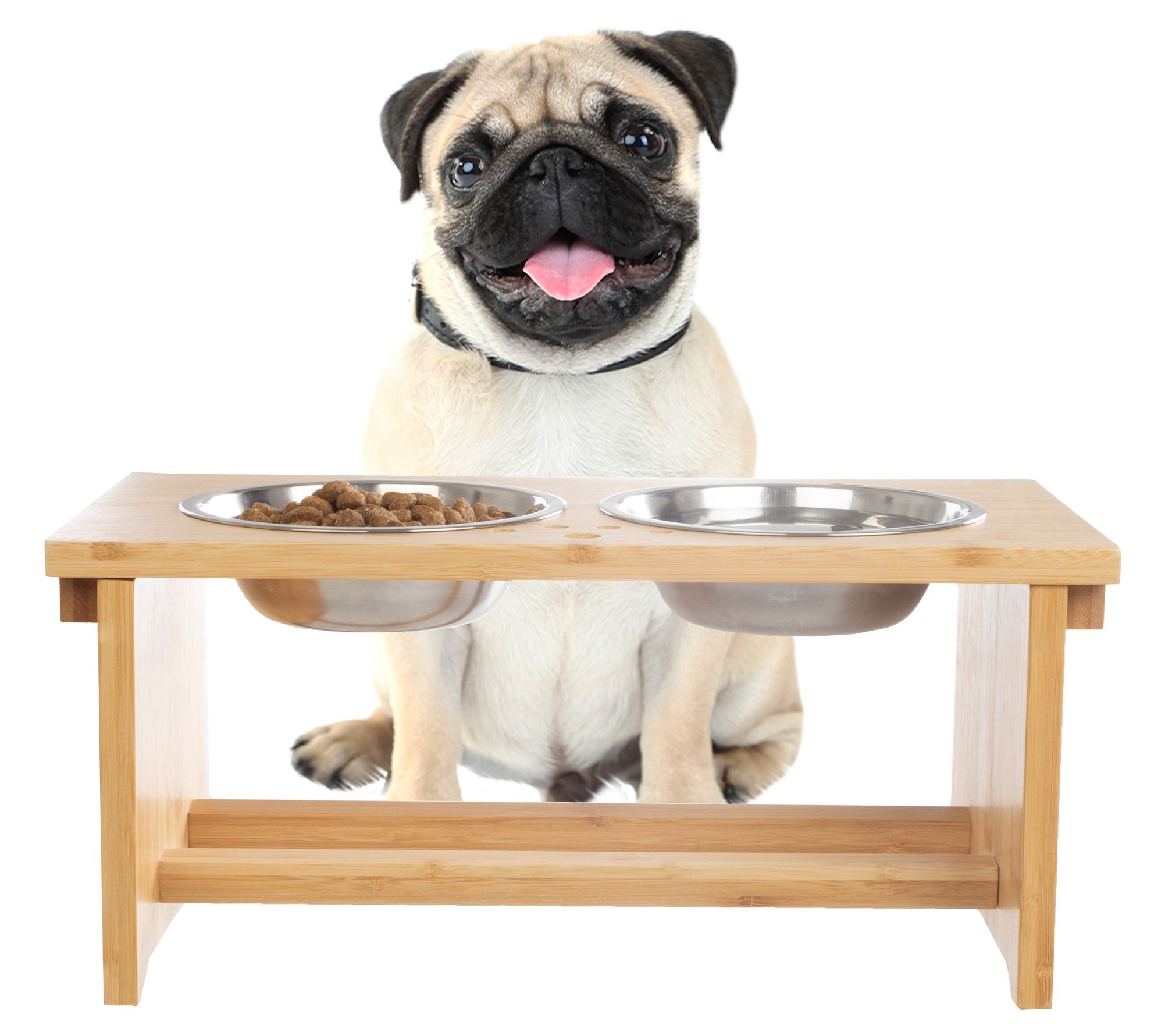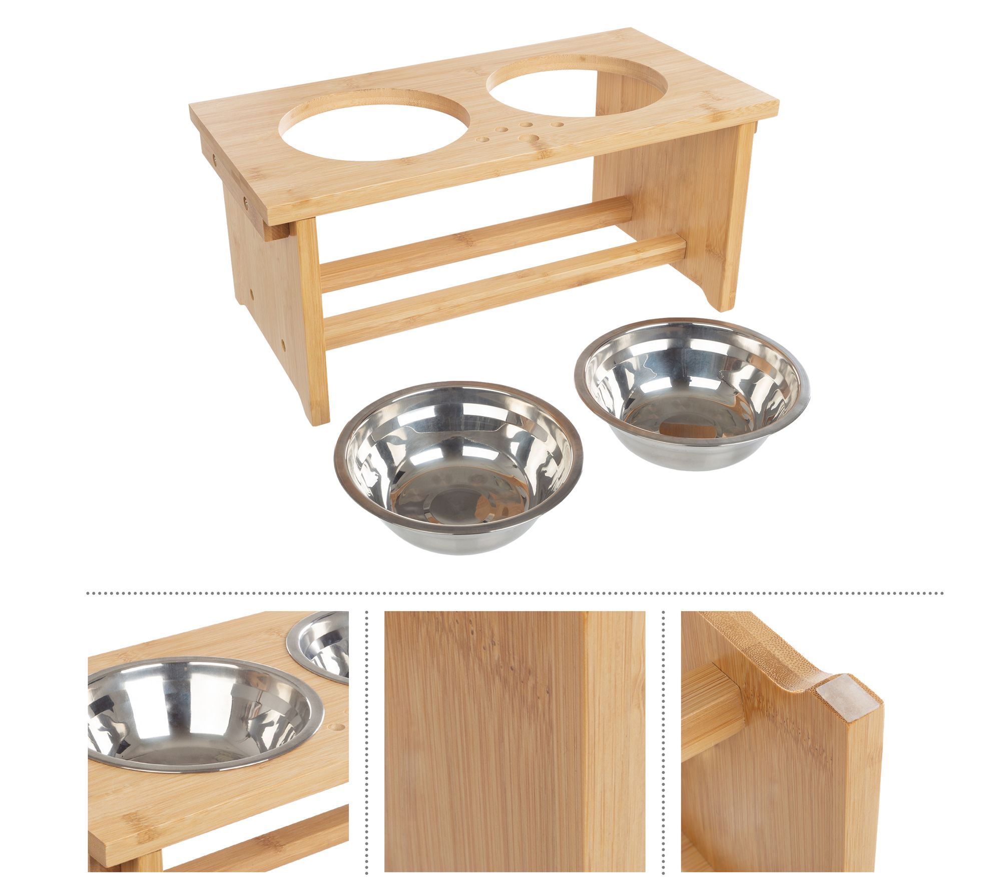 Provide your pet with a comfortable feeding experience with this elevated bowl set. The clever design makes dining more enjoyable, and the durable bamboo stand features grippy feet to reduce spills. From Petmaker.