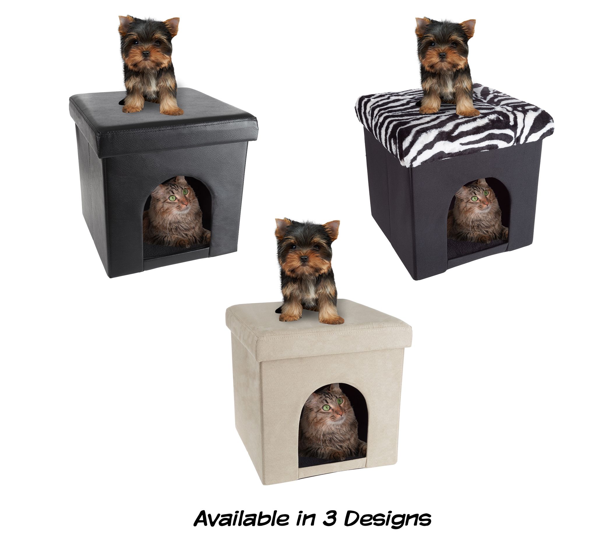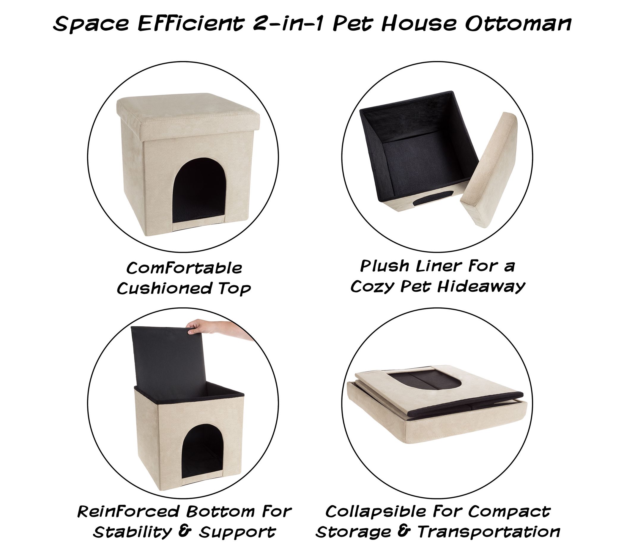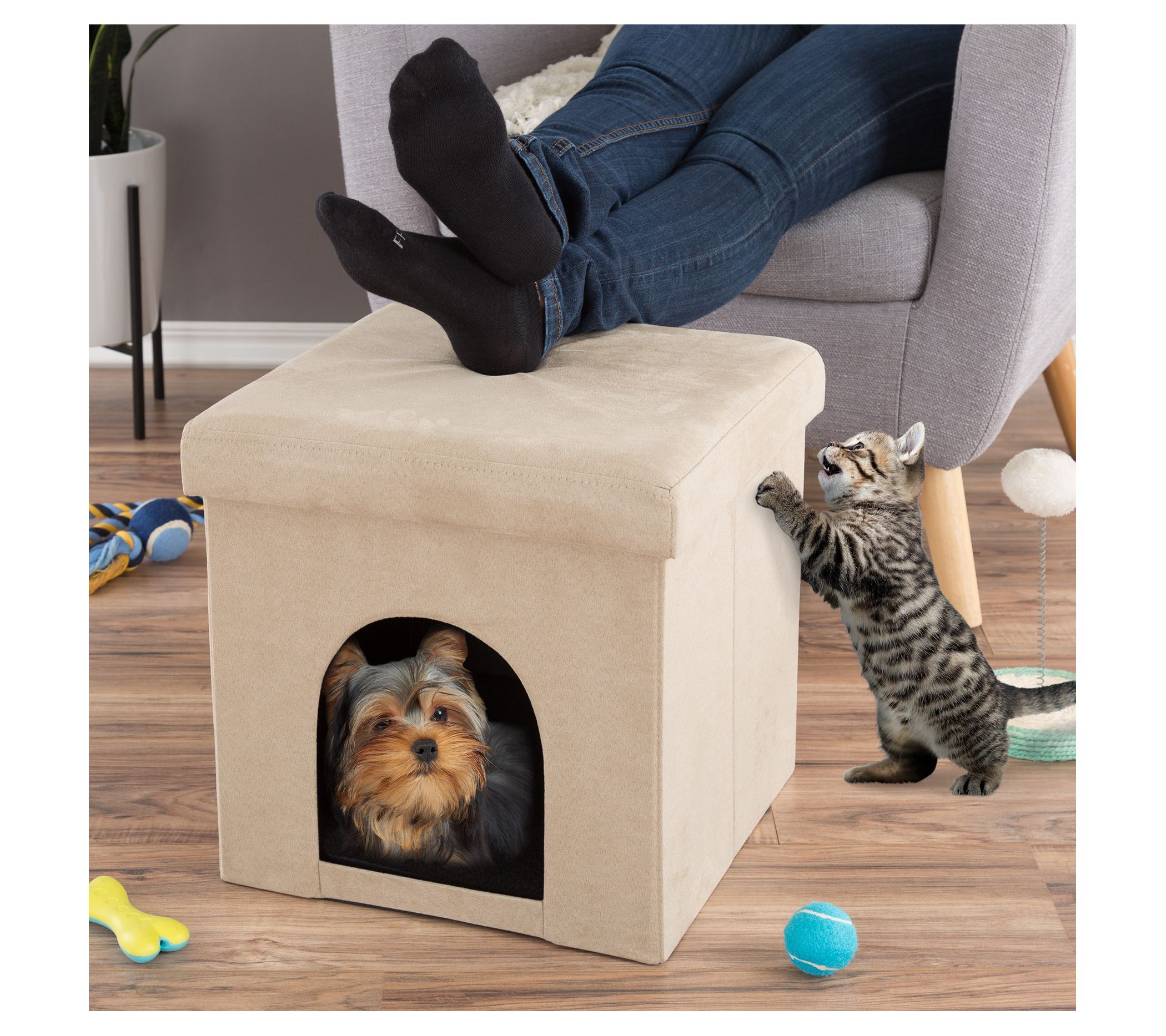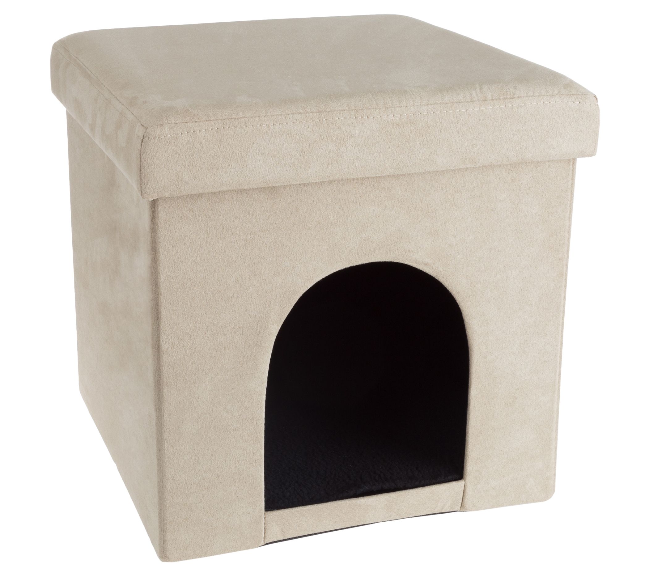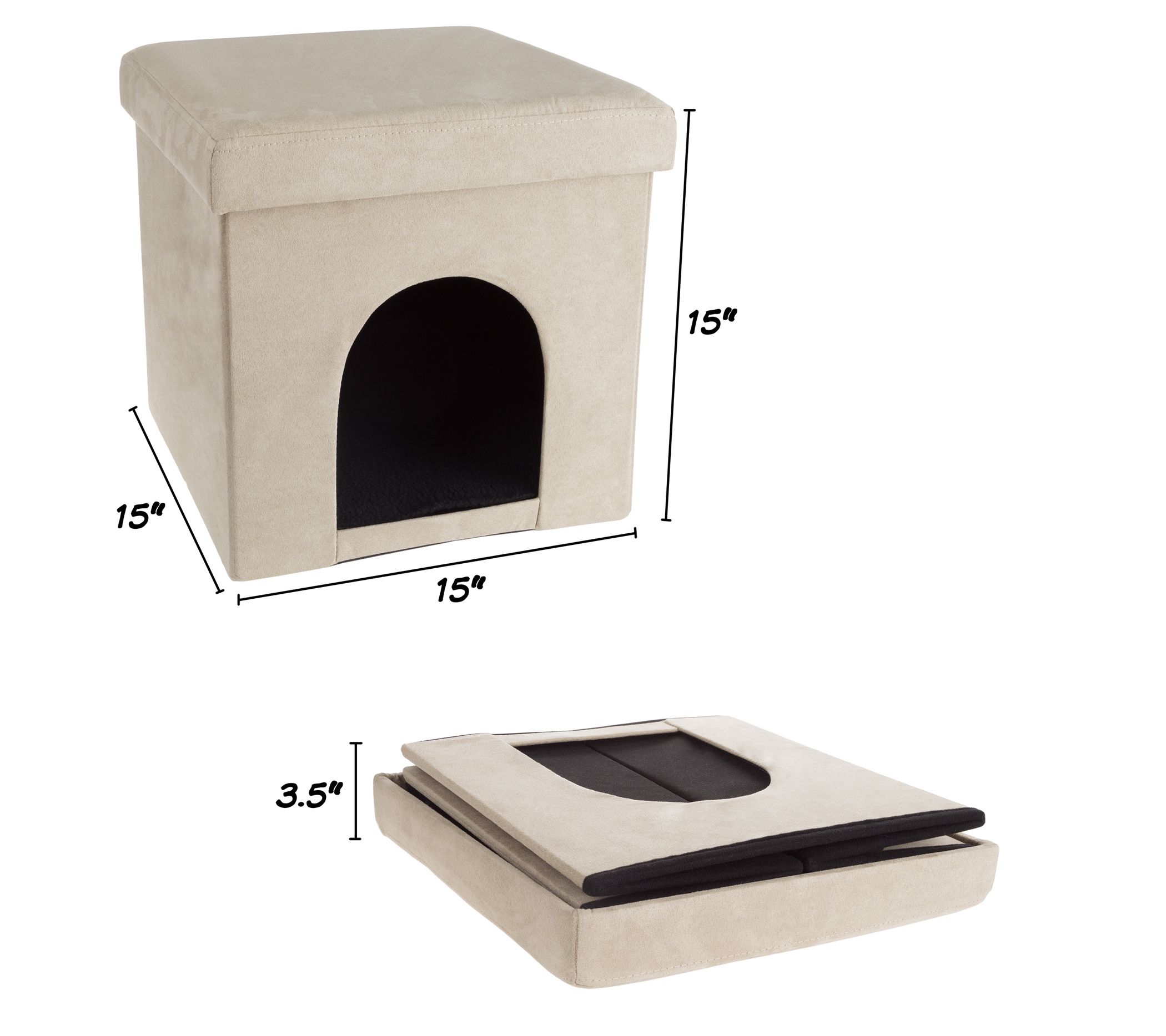 Rest your feet while your pet sleeps comfortably with this pet house ottoman. This multipurpose cat cube functions as a padded footrest while also providing a peaceful hideout for a small dog or a cat house for your feline to nap in. The space-saving design lets this cat hideout collapse when not in use, making it easy to store or carry with you while traveling. From Petmaker.