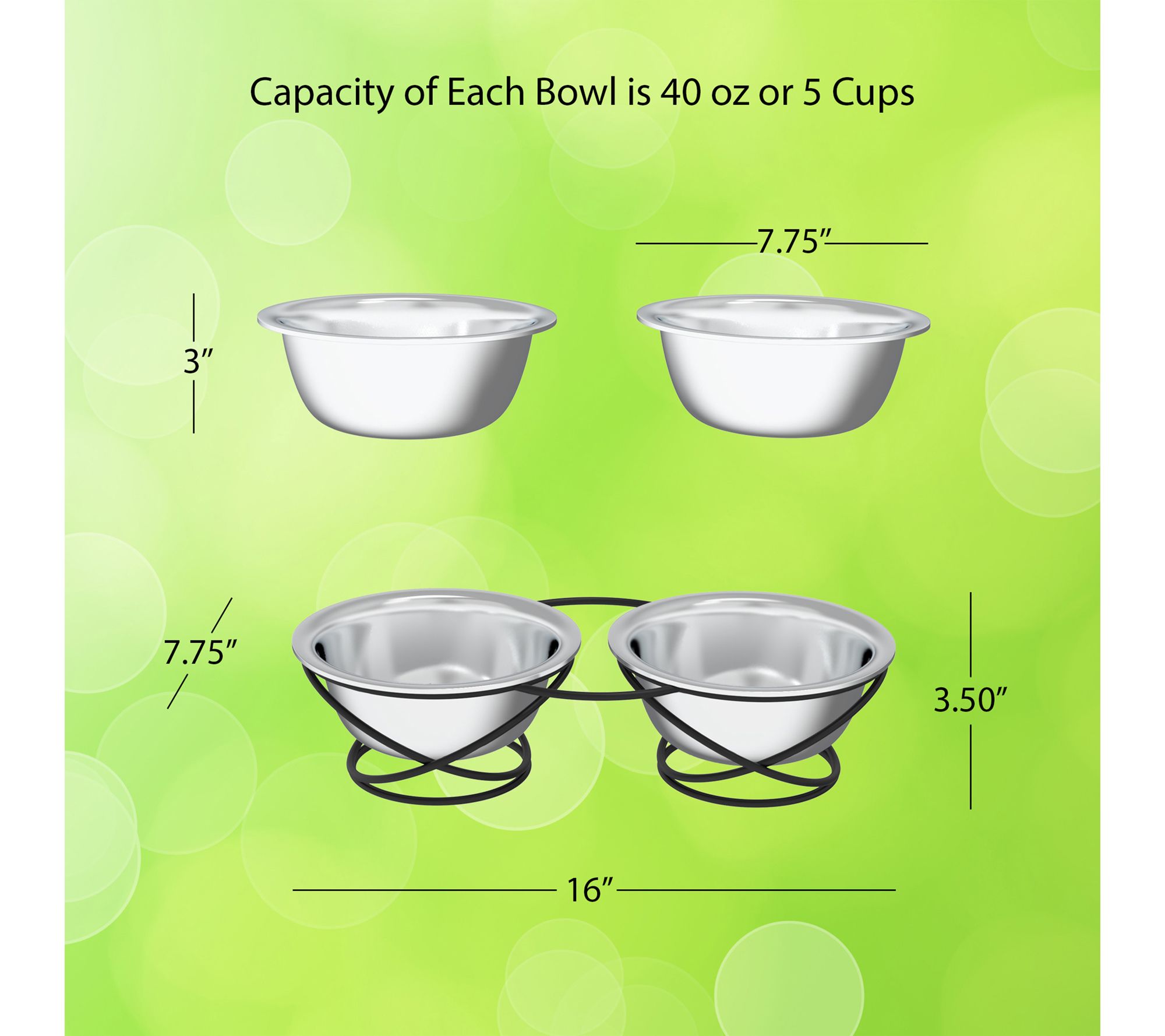 • Measures approximately 16"L x 7.75"W x 3.5"H overall; bowls measure 7.75" diameter x 3"H