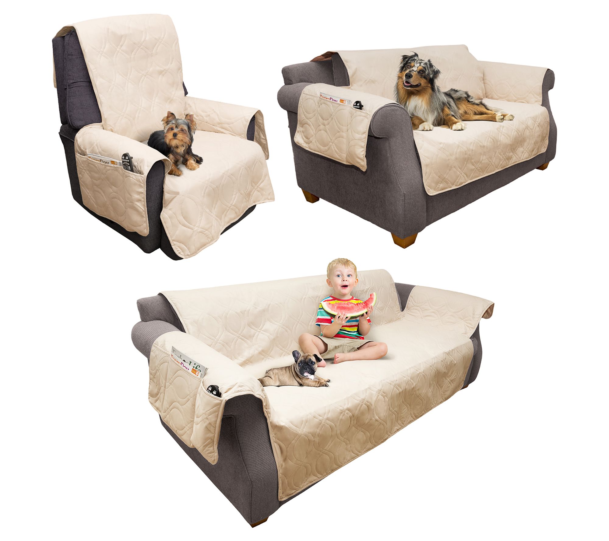 Protect your furniture with this handy couch cover for pets. This stylish and functional cover features a quilted finish and elastic straps to stay securely in place. With three large pockets, it keeps your essentials like remotes and magazines within easy reach. From Petmaker.