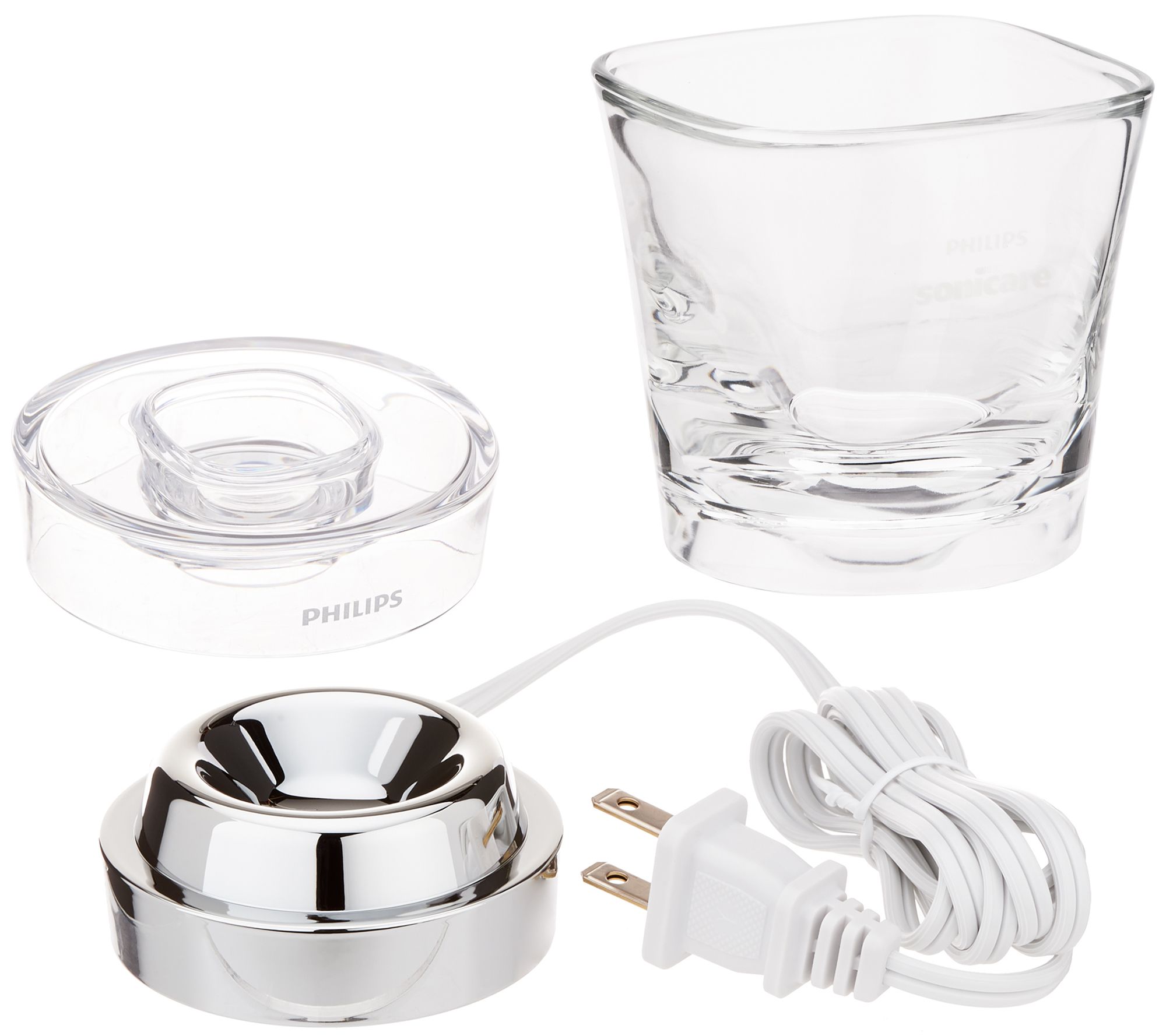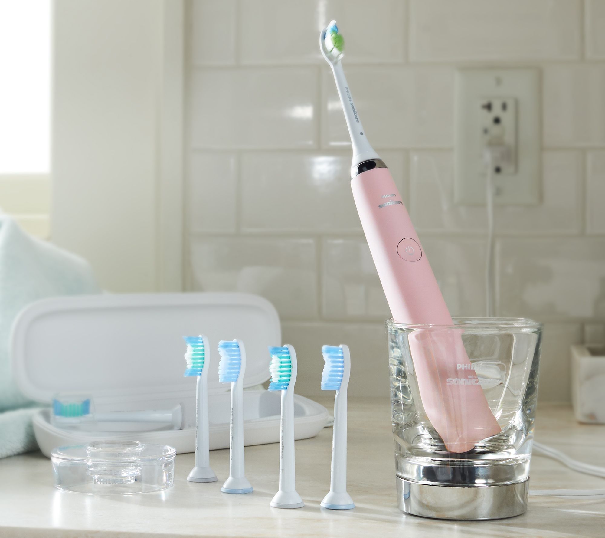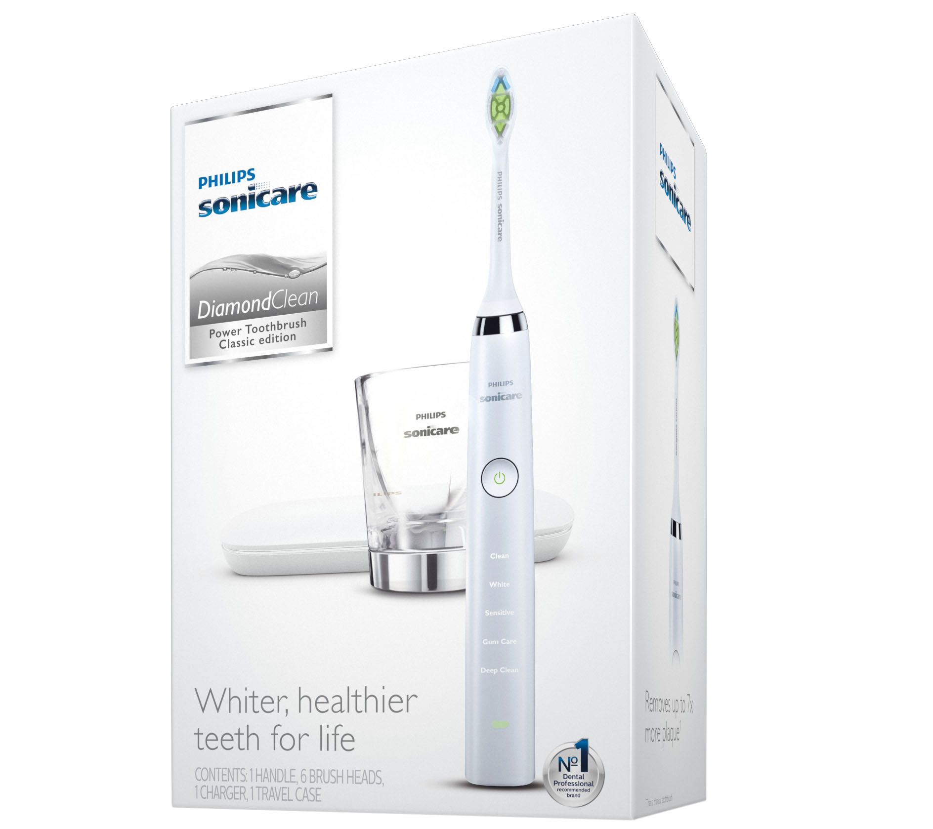 Includes Sonicare DiamondClean toothbrush, one DiamondClean brush head, three simply clean brush heads, two sensitive brush heads, charging glass, charging base, and travel case