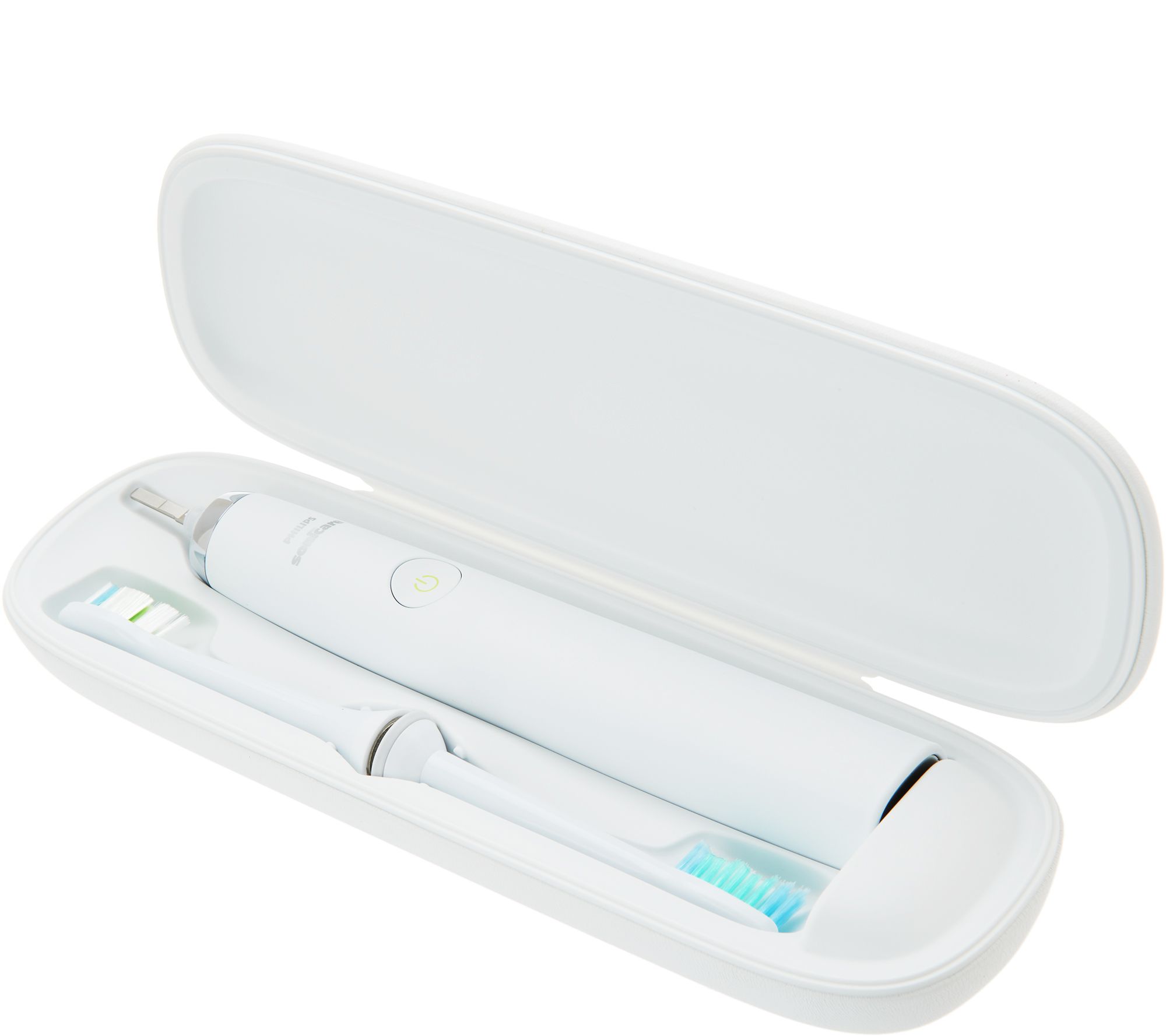 Got two minutes? Take control of your dental health and brighten your smile with the Philips Sonicare DiamondClean toothbrush. Used with the DiamondClean brush head, the Philips Sonicare toothbrush helps remove surface tooth stain within two weeks of use, and in a study, when used as directed, removed significantly more plaque above the gumline than a manual toothbrush. Five mode selections allow you to customize your cleaning, and the convenient clear glass charges and holds your toothbrush for a cleaner countertop. With the handy travel case, you'll always have a reason to smile wherever you go. From Philips.