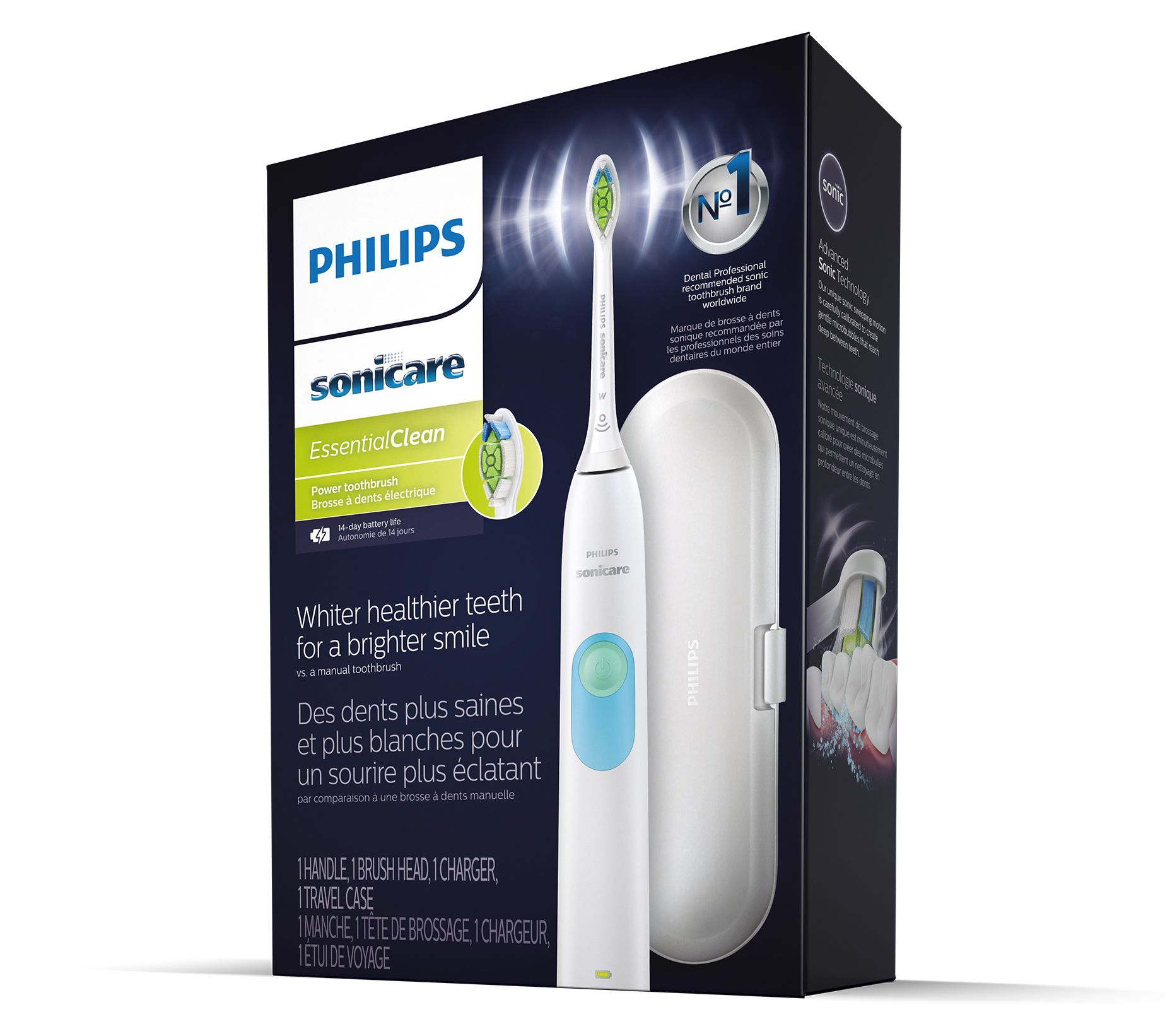 Includes Sonicare EssentialClean handle with built-in NiMH battery, DiamondClean brush head, charging stand, travel case, and $20 manufacturer's mail-in rebate voucher
