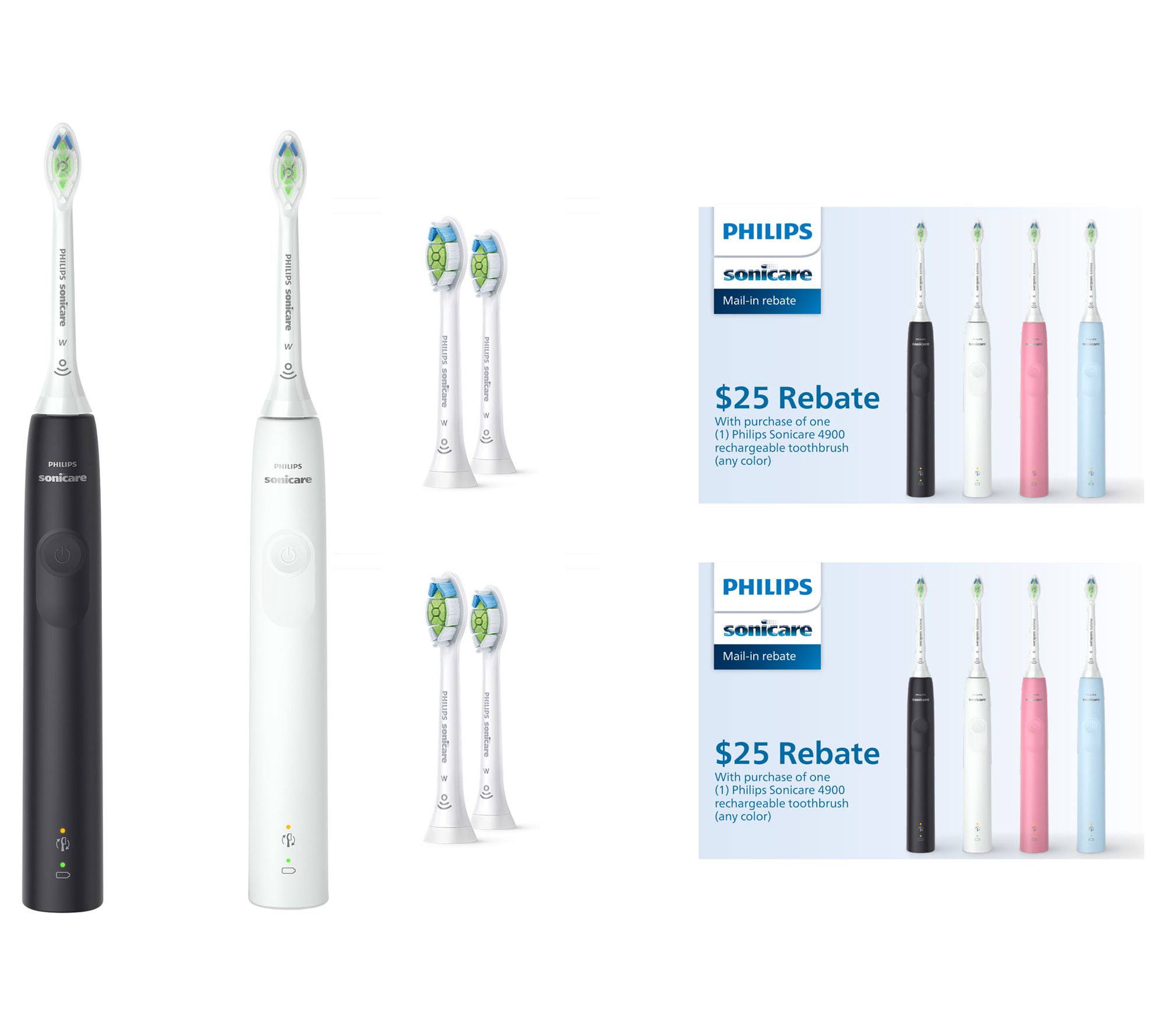 Includes two Philips Sonicare 4900 Series handles, six DiamondClean brush heads, two charging stands, two USB charging cords, two travel cases, and two $25 manufacturer's rebate offers