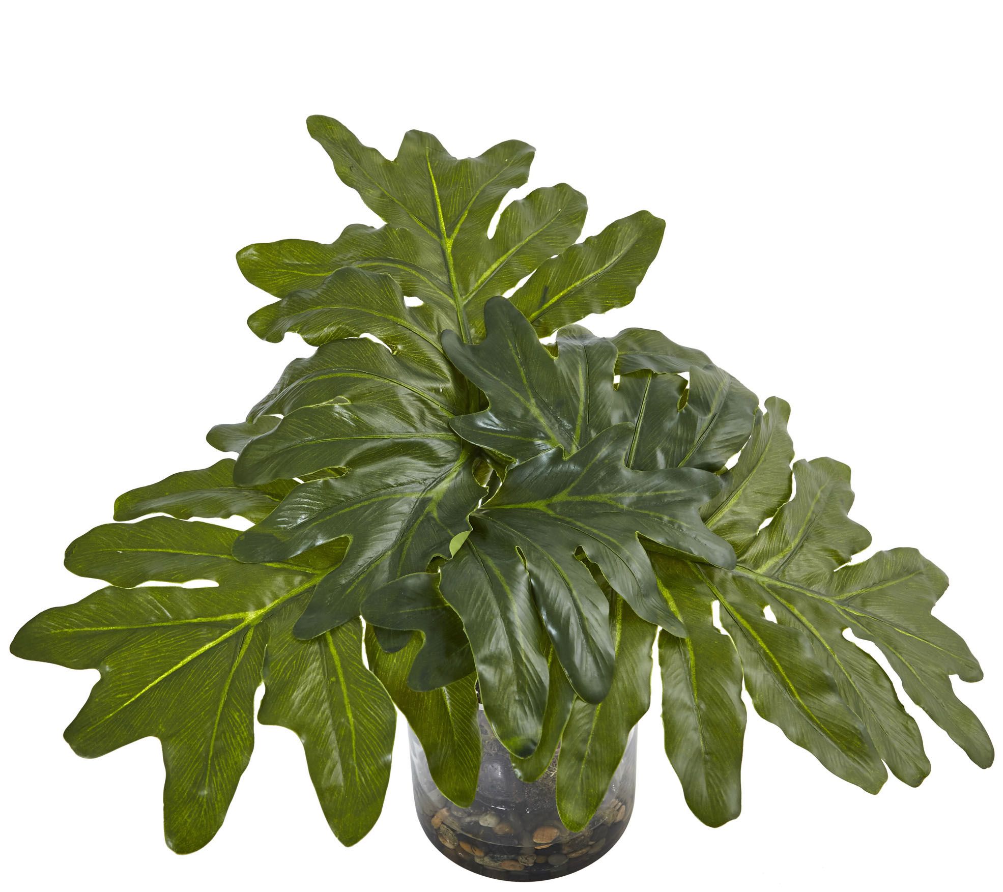 • Includes lifelike philodendron arrangement in glass vase with faux water and river rocks