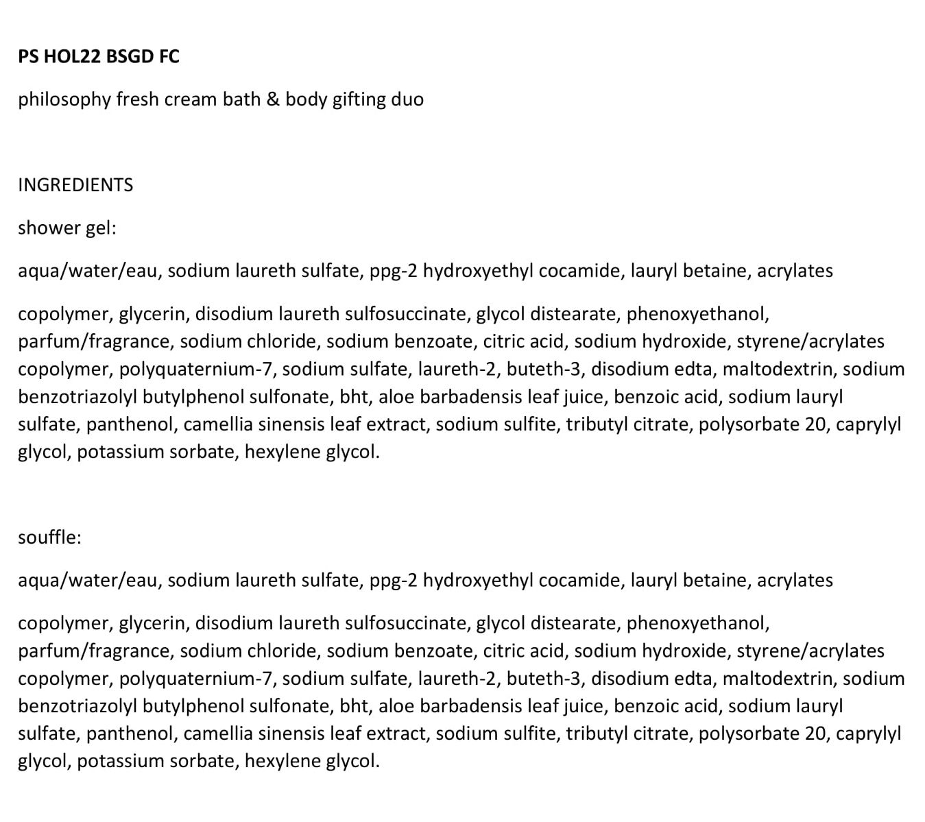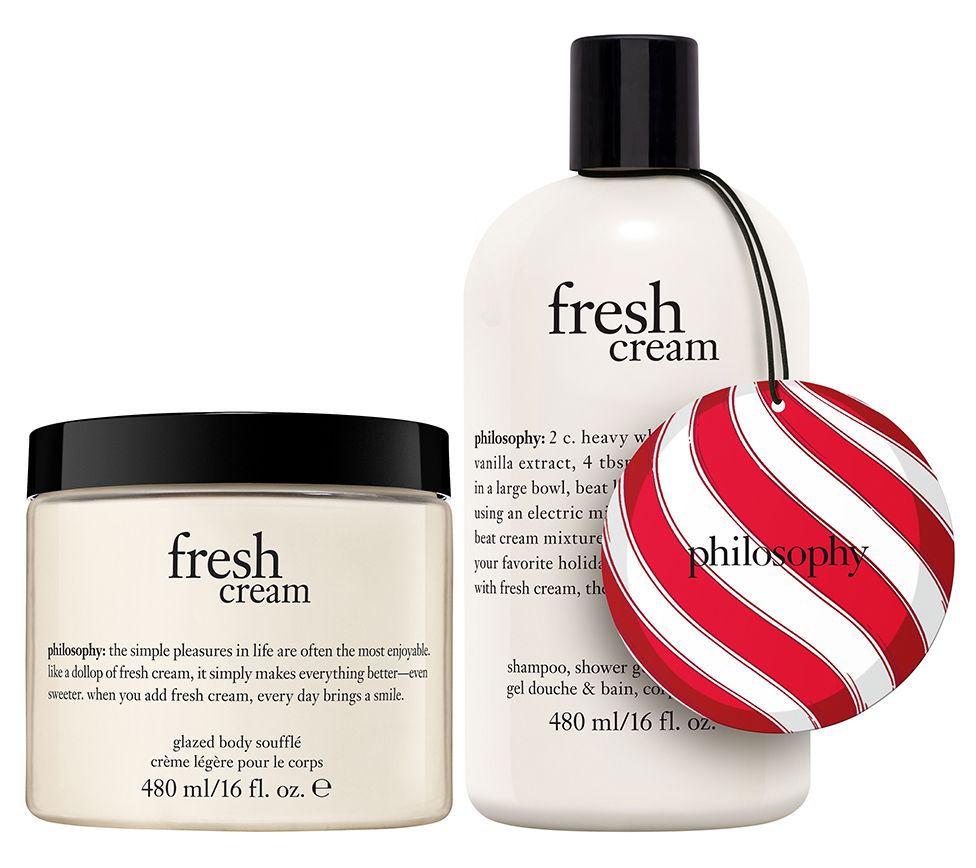 Cleanse and hydrate with this giftable philosophy set. The 3-in-1 shower gel formula provides a rich, foaming lather to cleanse and condition, leaving skin and hair feeling silky-soft. The luxuriously lightweight formula of the glazed body souffle moisturizes skin and is formulated with oils, leaving skin feeling silky-soft and lightly scented.